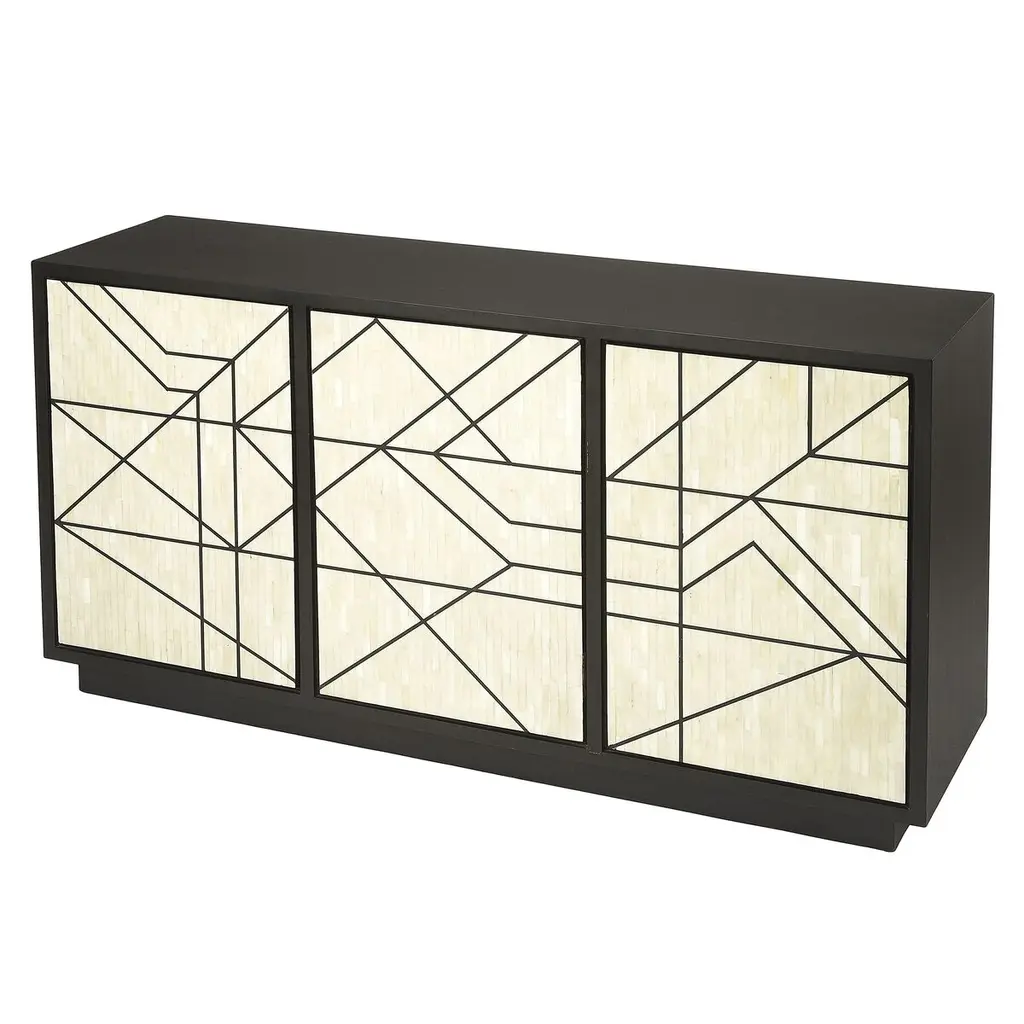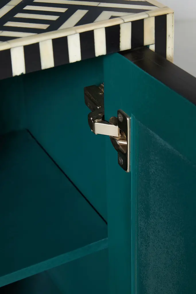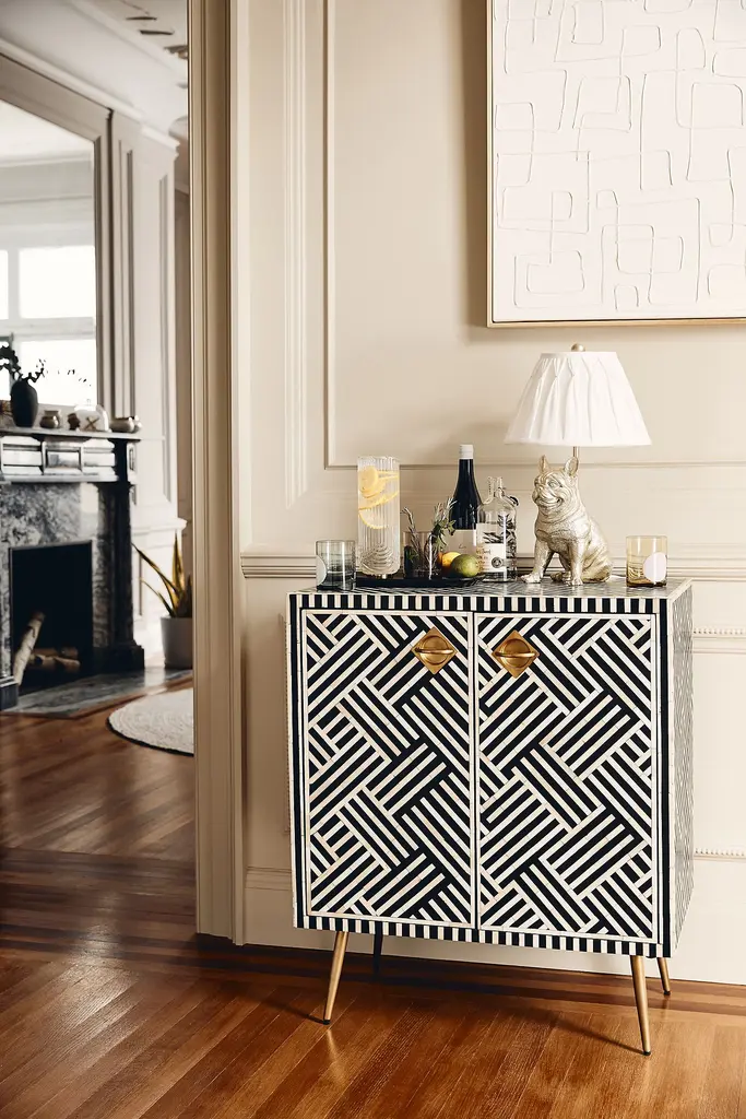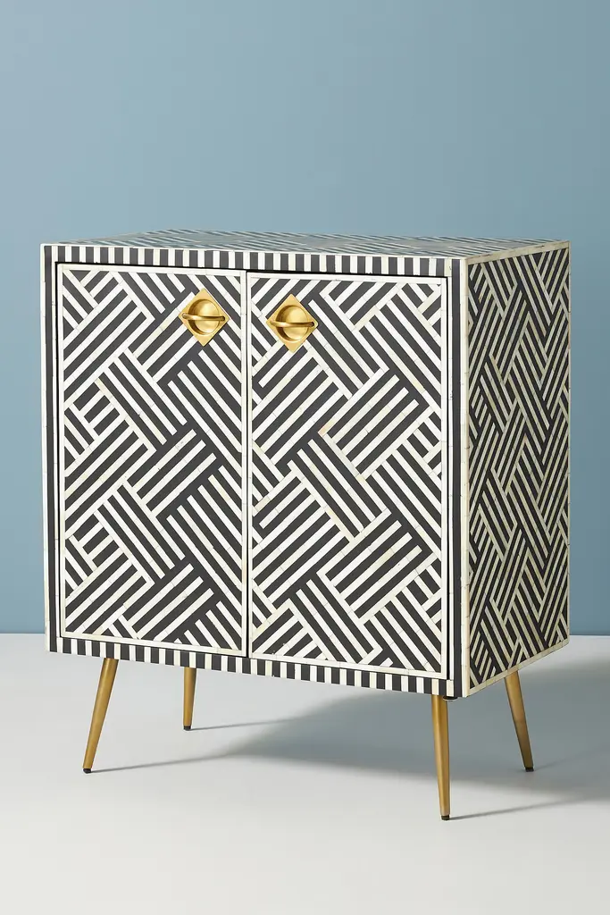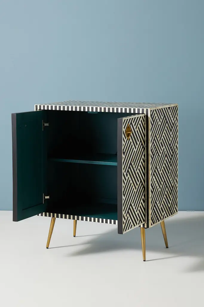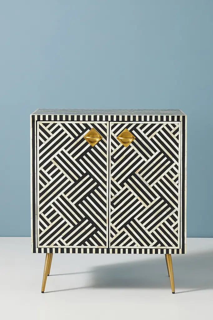 Featuring intricately patterned bone inlay and defining brass hardware, our showstopping Optical Inlay collection exudes unparalleled craftsmanship. Artful and functional at once, this cabinet makes a striking statement in an entryway, or provides ample storage for small-space living rooms.For ordering assistance and more, please contact us. For aesthetic advice and tips to help decorate your space, enjoy our complimentary home styling services.For more information on the materials and techniques of this piece, click here.