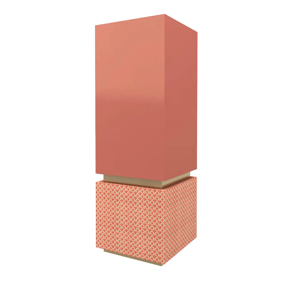 Making a sophisticated and bold addition to a modern home, this cabinet is composed of two monolith-like elements fashioned of wood. Upholstered with a luminous matelassé fabric, which preciousness derives from the use of metallic yarns and the power of color. The base is connected to the orange-lacquered top with a gold-finished brass element. Fashioned of wood, the interior features clear glass shelves enriched with an exquisite mirror on the background.