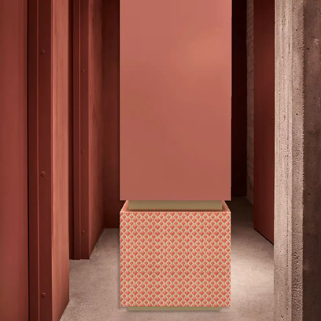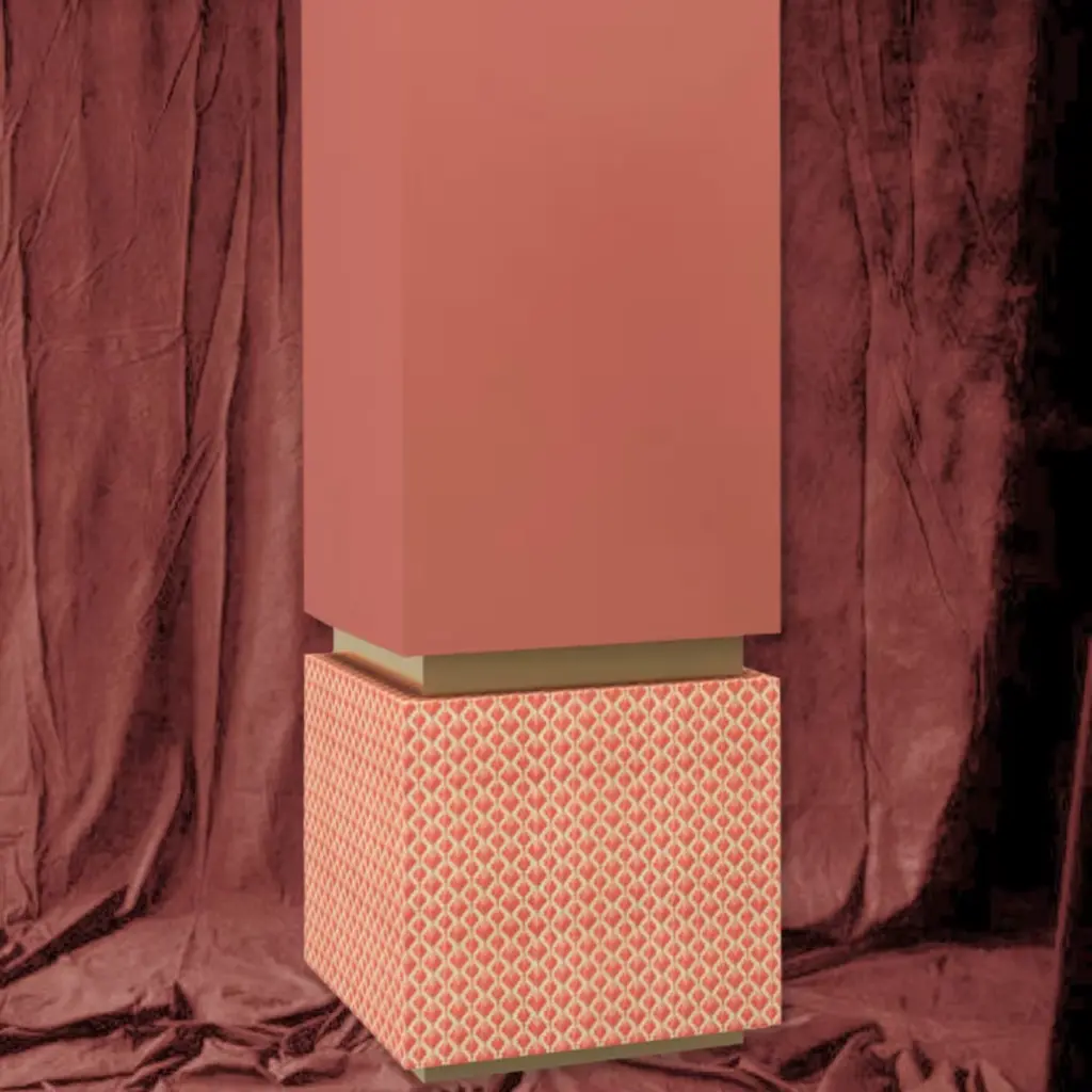 Making a sophisticated and bold addition to a modern home, this cabinet is composed of two monolith-like elements fashioned of wood. Upholstered with a luminous matelassé fabric, which preciousness derives from the use of metallic yarns and the power of colour. The base is connected to the orange-lacquered top with a gold-finished brass element. Fashioned of wood, the interior features clear glass shelves enriched with an exquisite mirror on the background.