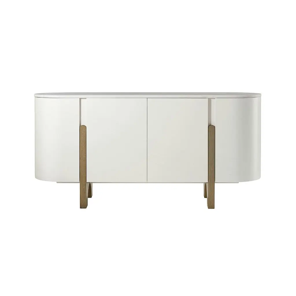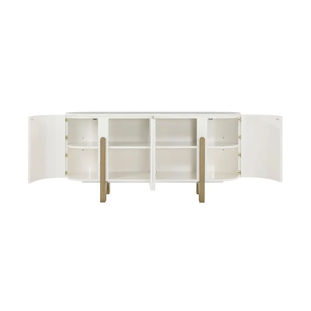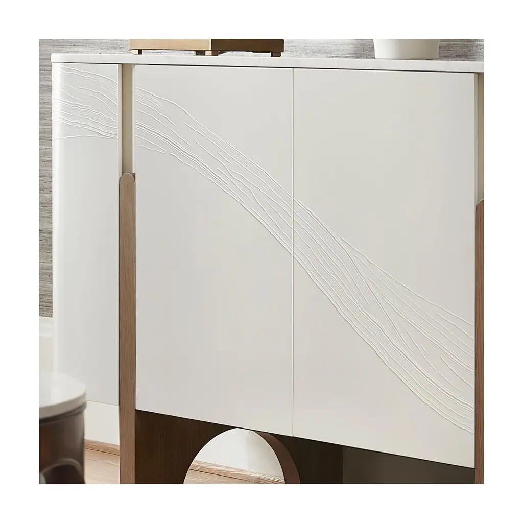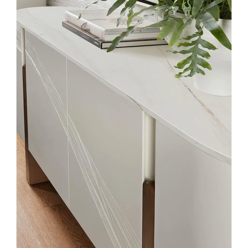 Featuring sweeping organic textures that elegantly dance across the lacquered doors. A marble top, Dune finished Ash legs and a curving design make this contemporary piece truly eye-catching.Dimensions: 70.25" W x 20.25" D x 34" H