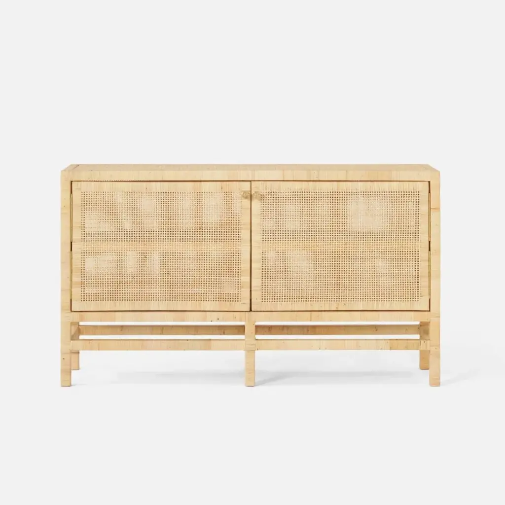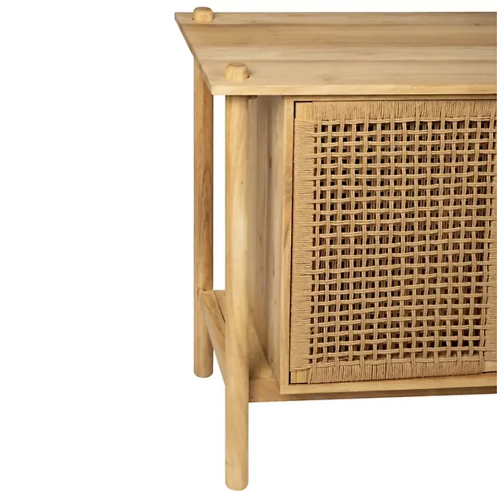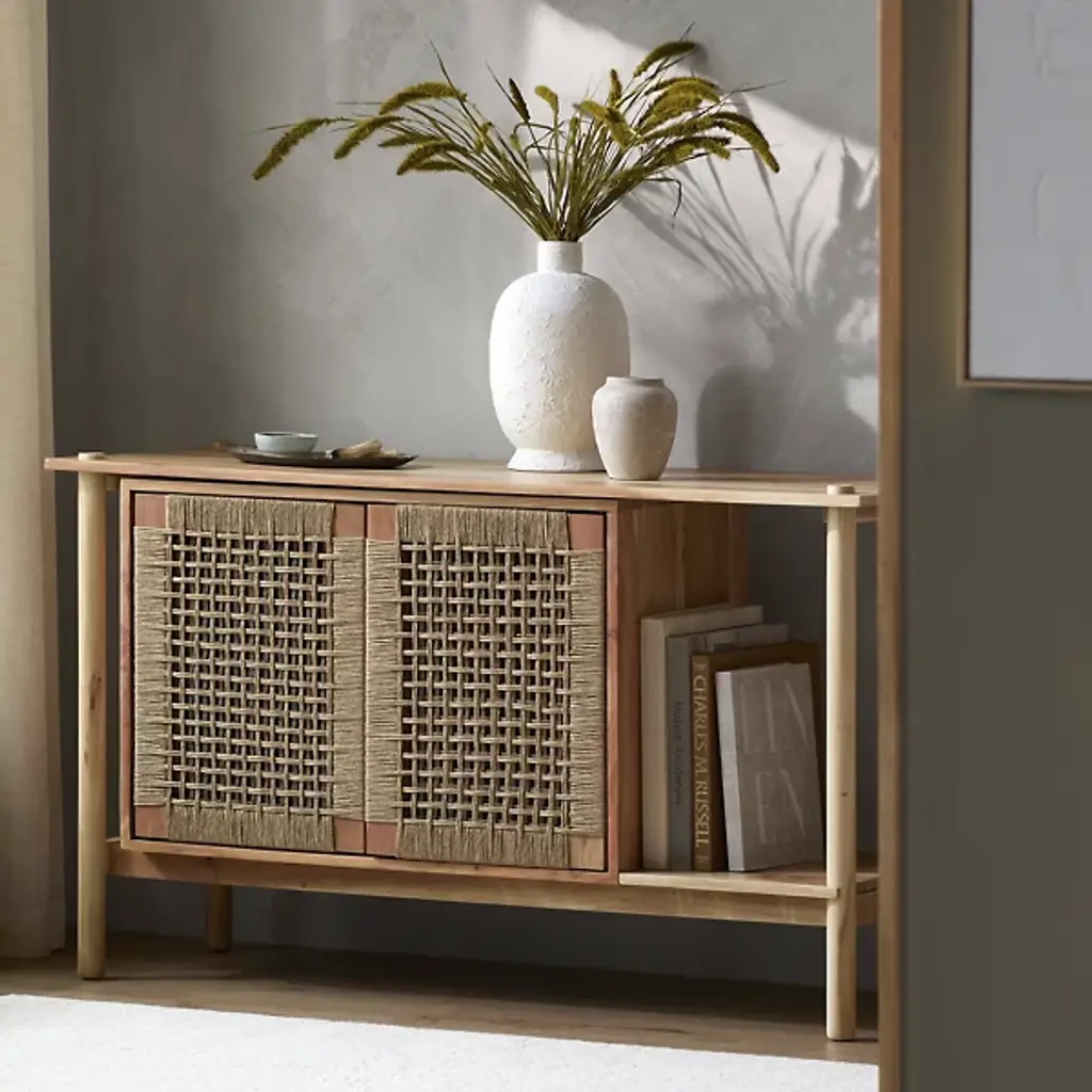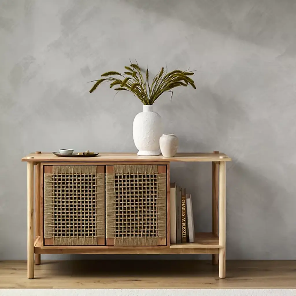 The Orly Cabinet by Surya offers a harmonious mix of rustic warmth and Scandinavian craftsmanship. Made in India from durable mango wood, this piece features a rectangular hardwood top and a lower shelf for open display. The woven wicker-fronted storage compartment also offers an alluring organic texture and practical functionality that will keep the surrounding space clean and stylish.