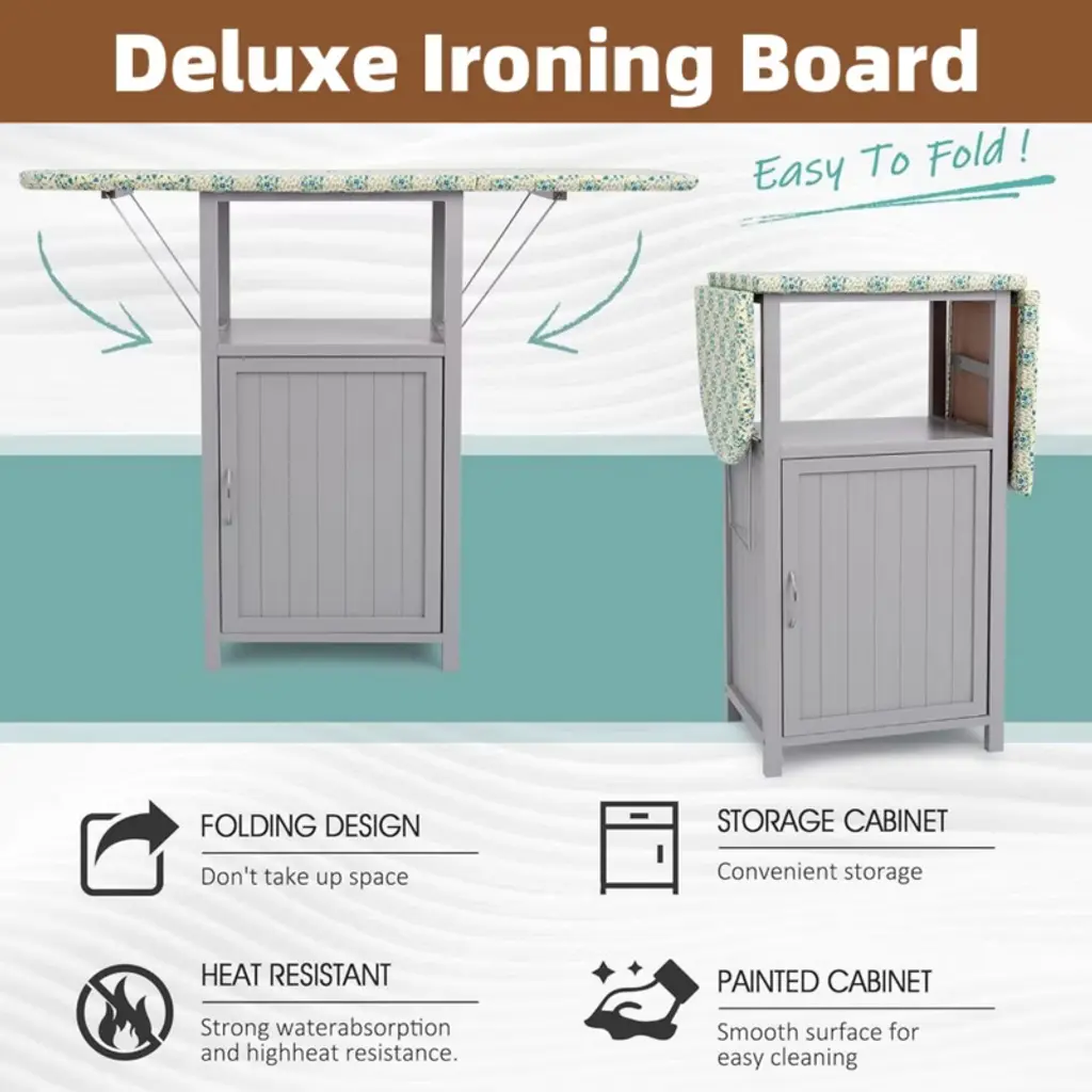 Orrd Solid Wood Folding Ironing Board With Storage Cabinet Heat Resistant Sponge For Small Spaces Laundry Room Gray