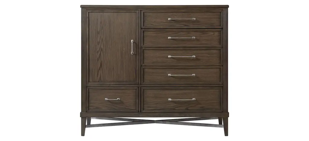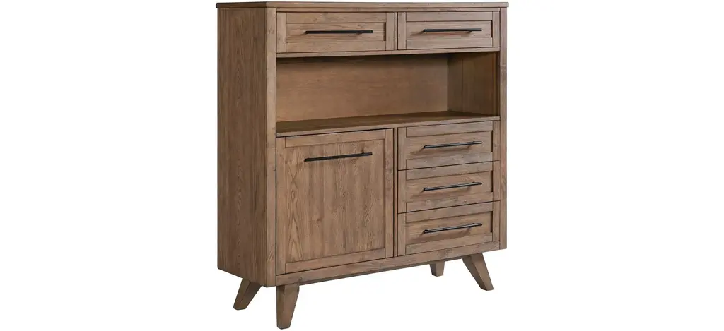 The Oslo Cabinet is constructed with wire brushed oak veneer and offered in a weathered finish. This cabinet features an center for display and a unique pattern on the top.