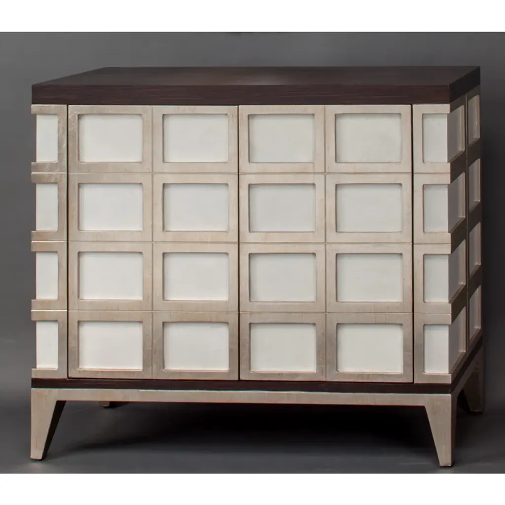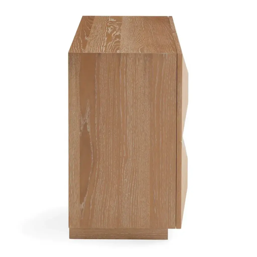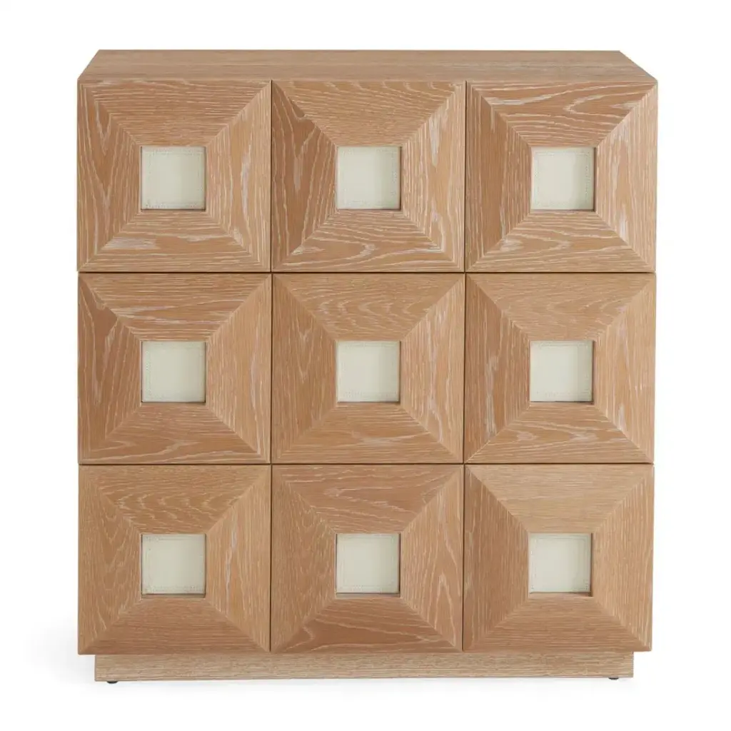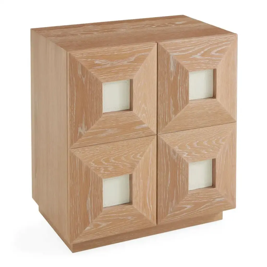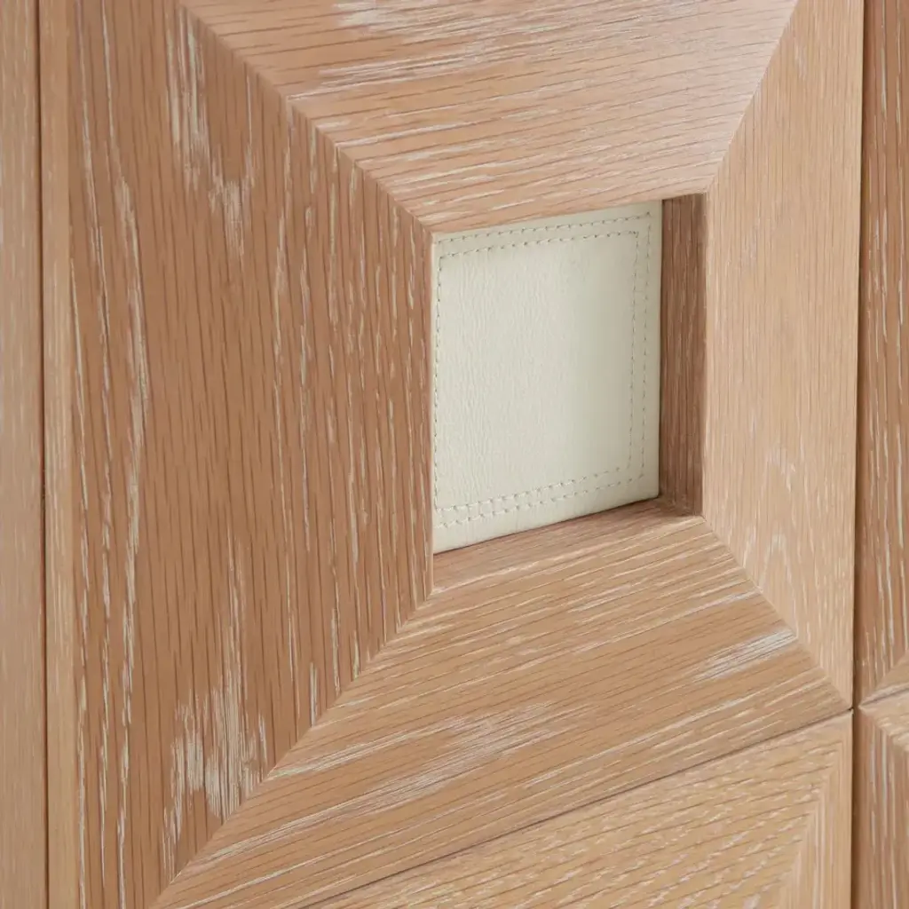 Crafted from wire-brushed and limed solid oak and featuring two doors faced with ivory leather insets detailed with timeless topstitched borders. Perched on a recessed base, our Otto Small Cabinet feels couture in your Brooklyn Brownstone and chic in your Tribeca loft. Our collection of artisan crafted solid oak furniture is as mighty as its source. Wire-brushing exposes the natural wood grain and our liming technique accentuates each solid piece of wood's unique pattern. A nod to French 50s cool, a dash of Milanese moxie, and a whisper of Scandinavian soulfulness.