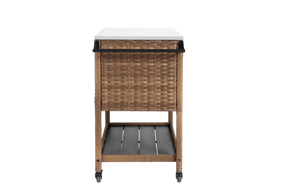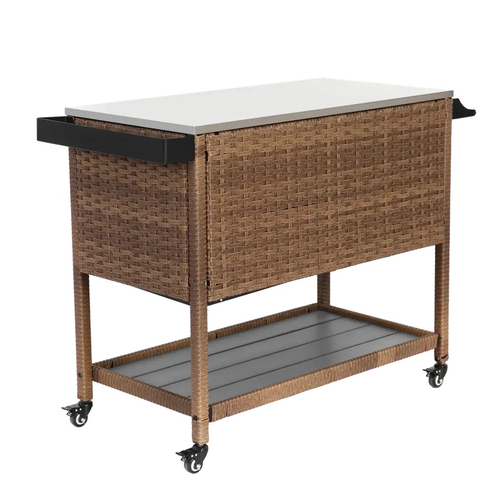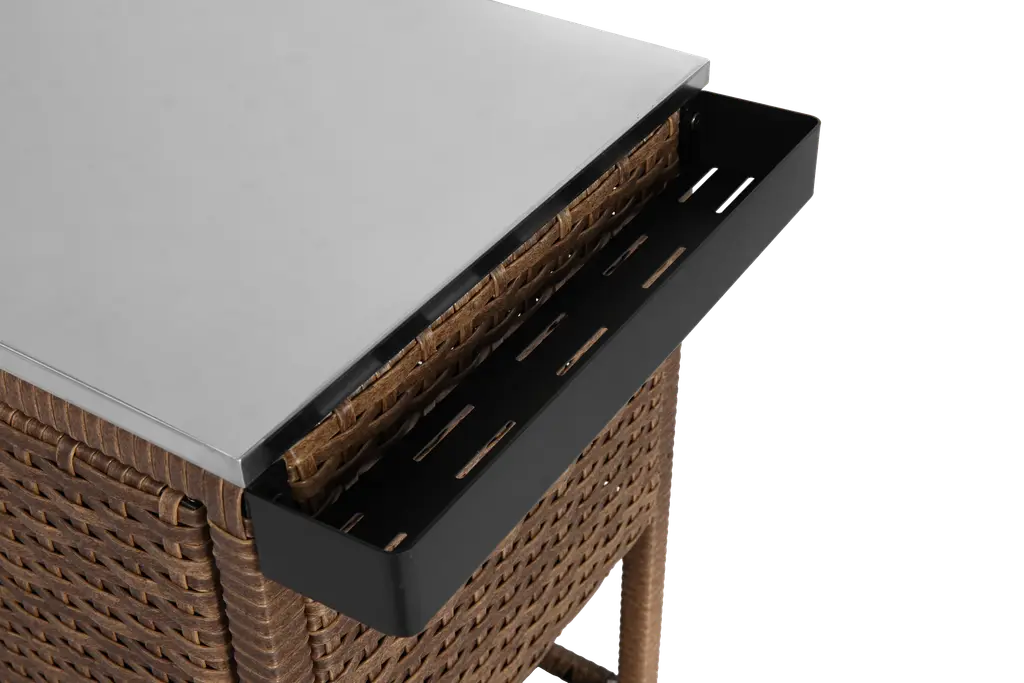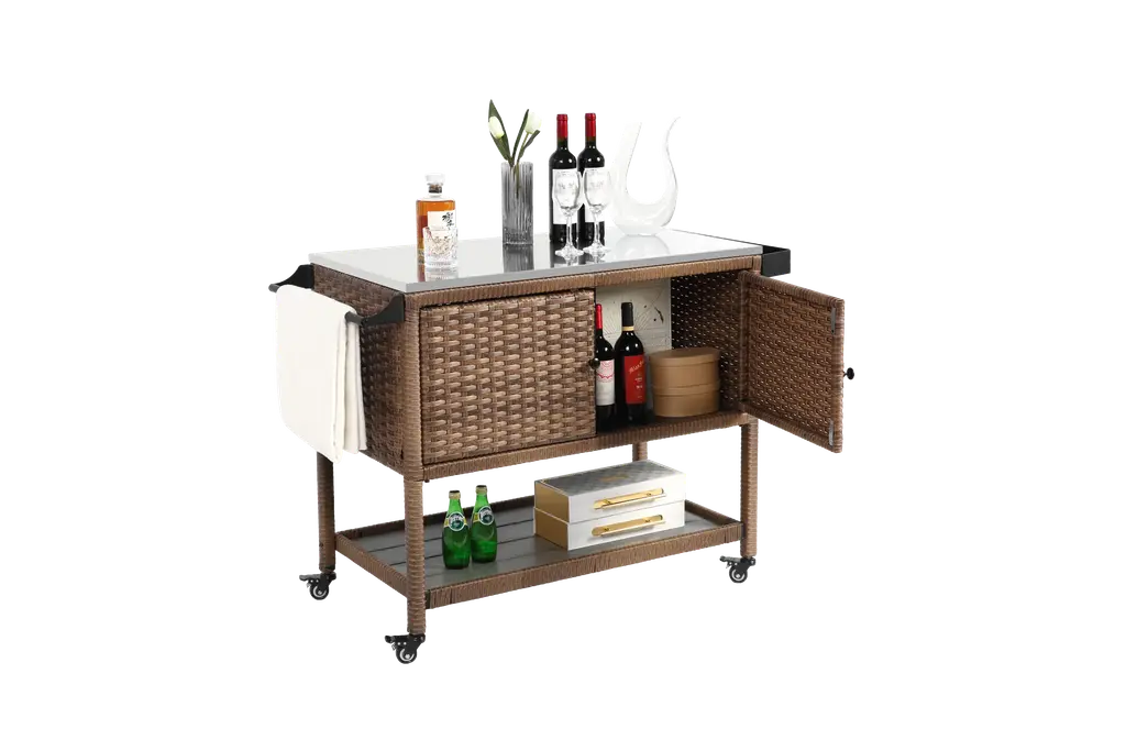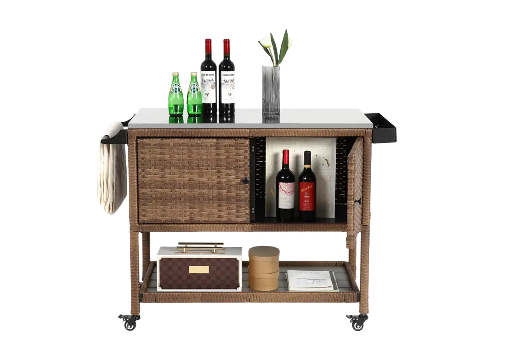 Large bar cart This large outdoor wicker storage cabinet offers ample storage options, including of open storage, cabinet storage, as well as an expandable shelf and tabletop to store fruits, drinks, cutlery, etc. Stainless steel table top This outdoor kitchen cabinet features a high-quality stainless steel tabletop with an expandable panel on the side; The baffle can be rotated to create a two-layer shelf for additional storage; Only requires a simple wipe to clean Versatile use The large drawer design facilitates item storage, and the wine glass rack helps to store goblets; Features paper towel holder and bottle opener to meet your needs; The armrests can be used to hold towels or use hooks to hang kitchen utensils Sturdy and durable This rattan outdoor kitchen table features a solid steel frame that's covered in weather-resistant handwoven wicker; Stainless steel countertops are better for outdoor use; Can withstand diverse weather conditions to achieve long-lasting use Large bar cart,Outdoor Kitchen Wicker Island Rolling Cart & Storage Cabinet Color Brown Product Dimensions 47.24'' W x 20.12'' D x 35.04'' H Special Feature Wheel Recommended Uses For Product outdoor and indoor area including garden, yard, pool, kitchen, dining room Frame Material Steel Unit Count 1 Count Maximum Weight Recommendation 154Pounds Carton size 1set: 46.46'' W x 23.62'' D x 7.87'' H Item Weight 55.12 Pounds Country of Origin China