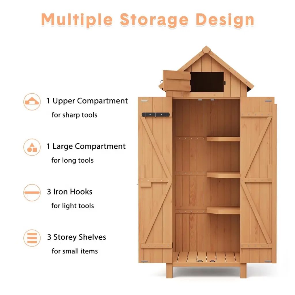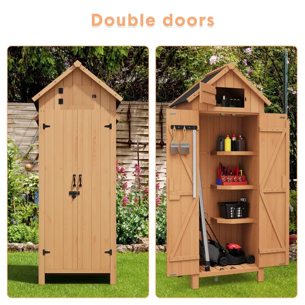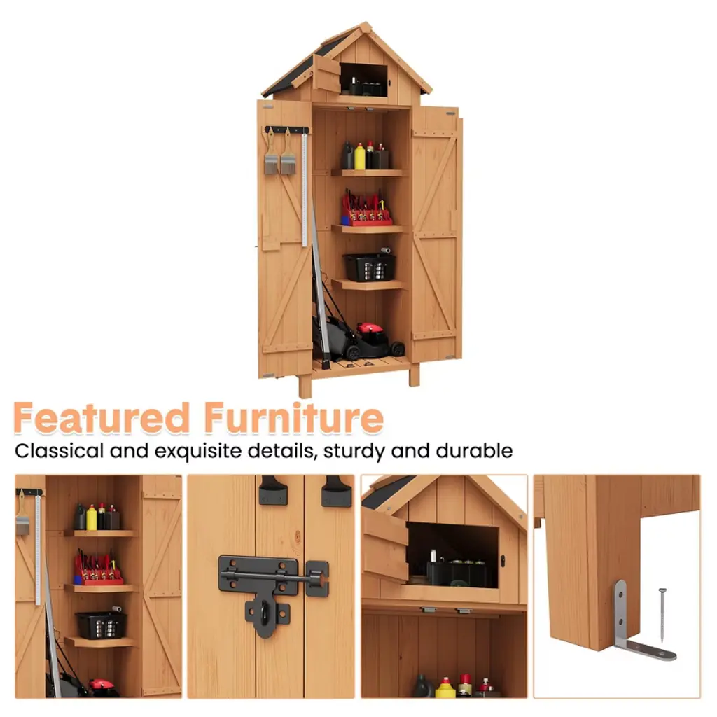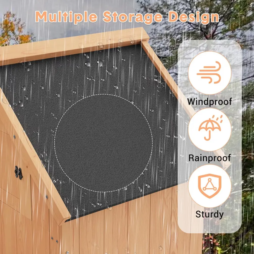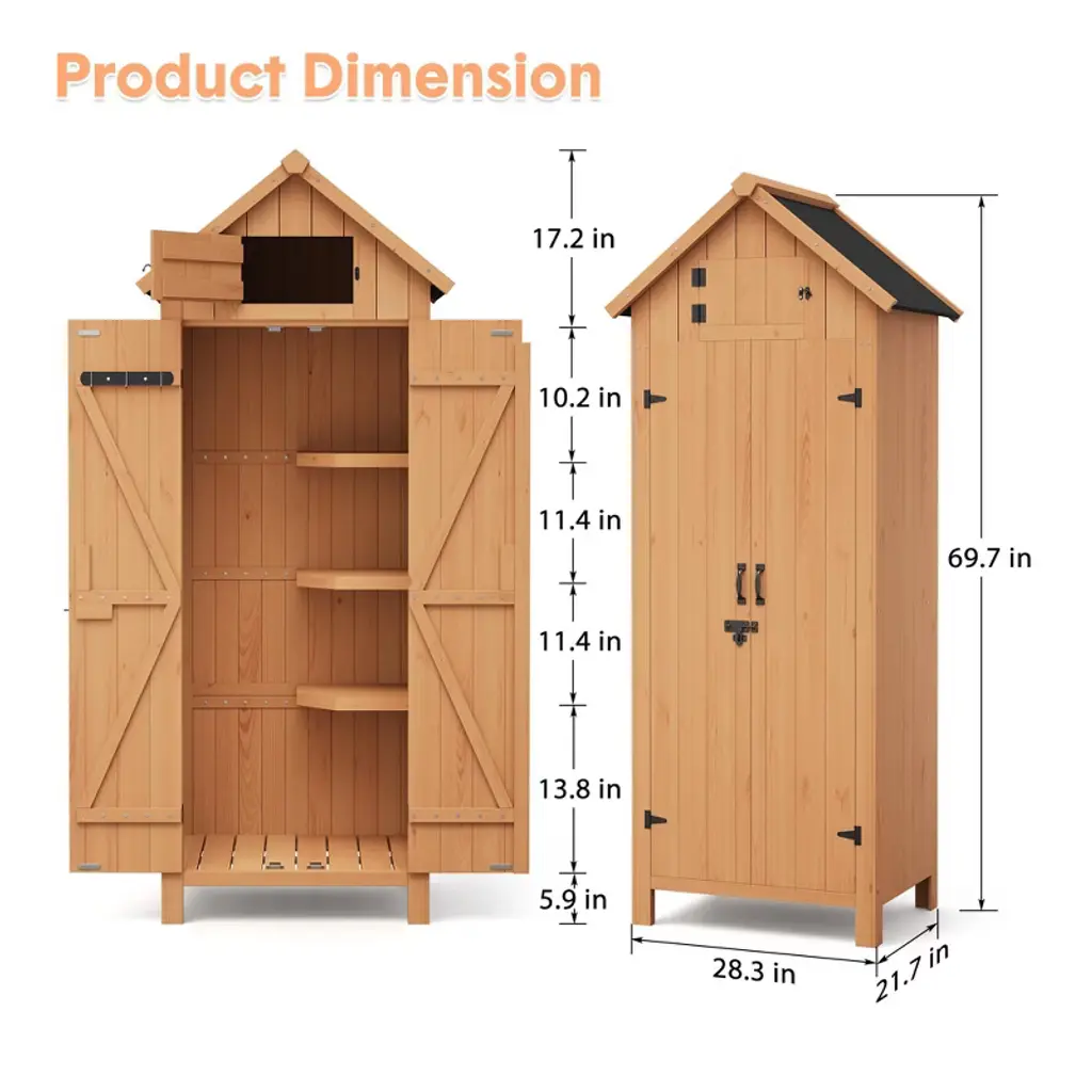 Description:This 70" waterproof wooden storage shed is a space-saving vertical cabinet designed for patios, yards, and lawns. With 3 shelves + roof storage, it keeps garden tools, seasonal items, and outdoor accessories neatly organized. The lockable double doors provide security, while the sloped roof and elevated base ensure weather resistance. Easy to assemble and built for durability, it’s the perfect storage solution for small outdoor spaces. Name: 70" Waterproof Vertical Wooden Storage Shed Material: Engineered wood (weather-resistant & durable) Capacity: Dimensions: 69.69" (H) x 28.35" (W) x 21.46" (D) Storage Space: 3 adjustable shelves + overhead roof storage Features:✔ Waterproof & Weather-Resistant – Tilted roof + thick engineered wood✔ Secure Lockable Doors – Keeps tools and valuables safe✔ Elevated Bottom – Protects against ground ✔ Space-Saving Vertical Design – Ideal for compact areas✔ Easy Assembly – Pre-labeled parts & clear instructions Package Included: 1 x Wooden Storage Shed 1 x Assembly Instruction Manual All necessary screws & hardware
