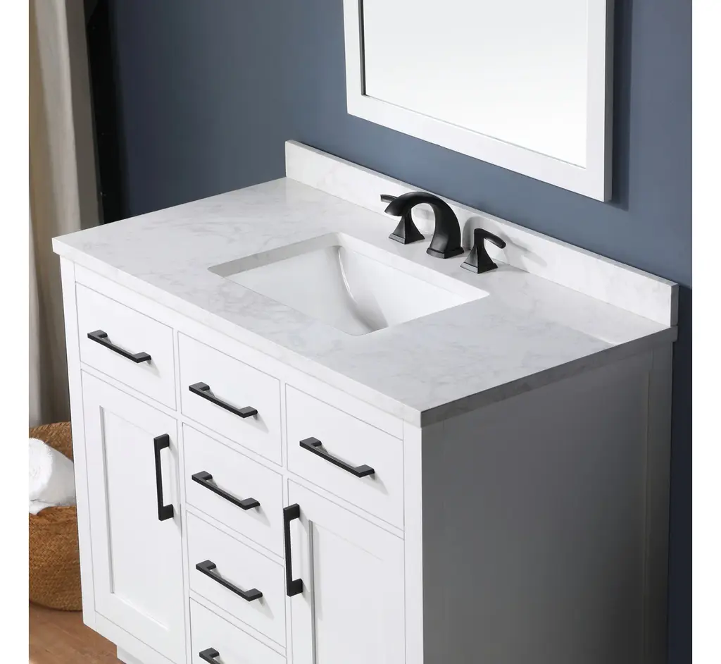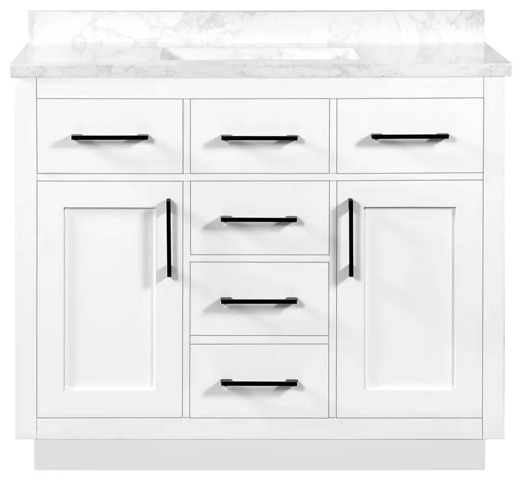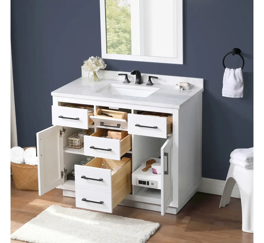 Find modern amenities and every inch of storage space maximized in the Athea 42-inch wide vanity by OVE Decors. A handsome white straight edge engineered stone counter complete with an undermount rectangular sink and matching 3-inch high backsplash is easy to clean and ready for years of use. A double door Shaker panelled cabinet reveals a pull-out shelf complete with hair styling tool compartment holders and a built-in power strip with sockets and USB ports. A tilt-down top drawer, two regular drawers and a double deep bottom drawer with clever separator compartments and soft-close dovetailed construction keep all your bathroom essentials tidy and organized. Also available with sizes ranging from a space-saving 30-inch to large 72-inch double vanity models. Pre-installed Brushed Nickel hardware and extra black hardware included. Included Components: Covered under Ove Decors' 1-year limited warranty Wood vanity cabinet with 2 doors, 6 drawers Engineered Stone vanity top with single ceramic sink and matching backsplash Faucet is not included and must be purchased separately Cabinet Features: Constructed from wood and MDF providing a lifetime of durability Free standing installation – vanity is seated on the floor with wall anchors, providing a functional design Double door design provides easy access to storage space 6 full extension drawers allows for organized storage Vanity cabinet includes matching decorative hardware Vanity will need to be assembled Vanity Top Features: Engineered Stone vanity top includes single undermount sink constructed of ceramic Three pre-drilled faucet hole Center drain location provides optimal draining capability Equipped with an overflow drain to help prevent water overflow and spillage from occurring Vanity top includes matching backsplash Cabinet Specification: Cabinet Width: 42" (left to right) Cabinet Height: 34-1/2" (top to bottom) Cabinet Depth: 22" (front to back) Number of Doors: 2 Number of Drawers: 6 Vanity Top Specifications: Vanity Top Width: 42" (left edge to right edge) Vanity Top Depth: 22" (front edge to back edge) Backsplash Height: 3" Number of Basins: Single Sink Measurements: 20-1/4" L x 14-15/16" W x 7-1/4" H Number of Faucet Holes: 3 Faucet Centers: 8" Drain Connection: 1-3/4"