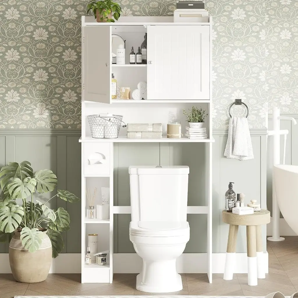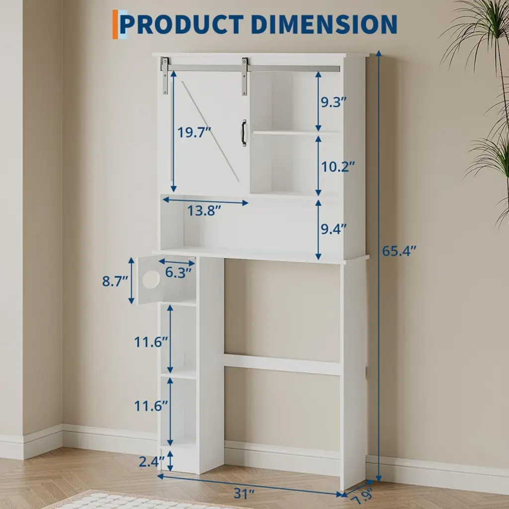 Over The Toilet Storage Cabinet ¨C Tall Bathroom Organizer with 2 Sliding Barn Doors, Adjustable Shelf & Toilet Paper Holder, Space-Saving DesignBrand: TROPOWMaterial: Premium Engineered WoodColor: WhiteStyle: Modern FarmhouseDimensions: 31"W x 7.9"D x 65.4"HStorage Features: 2 Sliding Barn Doors (Adjustable Inner Shelf) 3 Open Shelves Built-In Toilet Paper HolderSpecial Features: Anti-Tip Device for Safety Space-Saving Depth (7.9") Easy-Clean Painted FinishAssembly: Required (Instructions Included) PRODUCT HIGHLIGHTSSMALL BATHROOM SOLUTION Fits standard toilet spaces ¨C maximizes vertical storage Holds: Towels, toiletries, cleaning supplies Toilet paper holder ¨C keeps essentials within reach CUSTOMIZABLE ORGANIZATION? Adjustable shelf ¨C fits tall bottles or baskets? 3 open shelves ¨C display or hide items? Barn doors ¨C save space vs. swinging doorsSTURDY & SAFE Engineered wood ¨C resists moisture warping Anti-tip kit ¨C prevents accidents Sleek white finish ¨C wipes clean easily MULTI-ROOM VERSATILITY? Laundry room ¨C detergent & supplies? Entryway ¨C shoes & small items? Kitchen ¨C spices or cookbooksEASY ASSEMBLY Clear step-by-step guide Tool-free door installation Lightweight (XX lbs) WHY CHOOSE THIS CABINET?? Saves Space ¨C 7.9" depth fits tight bathrooms? Farmhouse Charm ¨C Barn door elegance? Adaptable Storage ¨C Adjustable + open shelving? Easy Maintenance ¨C Smudge-proof finishPerfect For: Apartments & small bathrooms Rental-friendly upgrades Farmhouse or modern decor