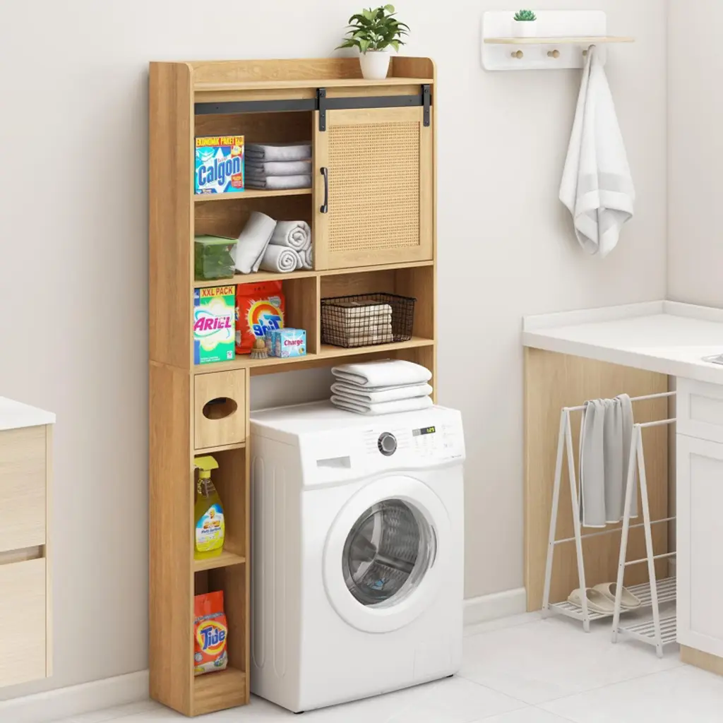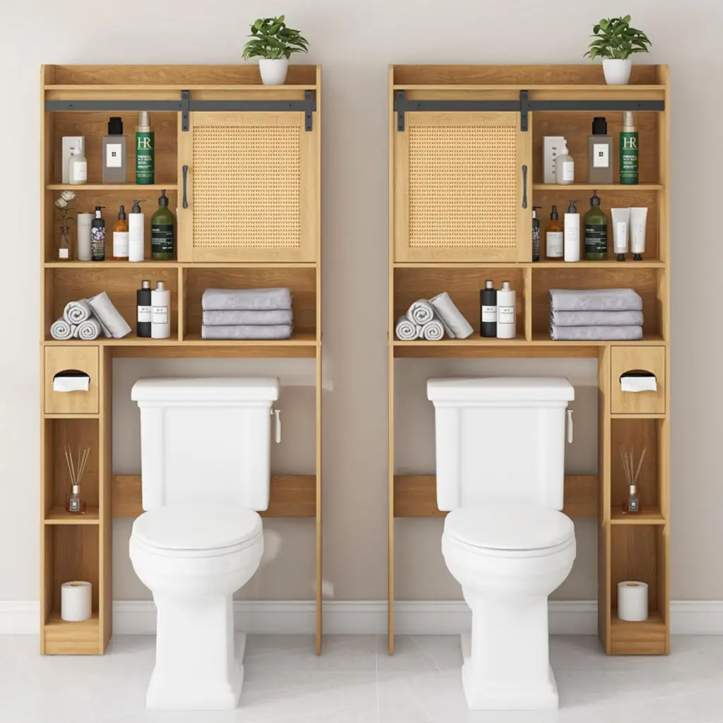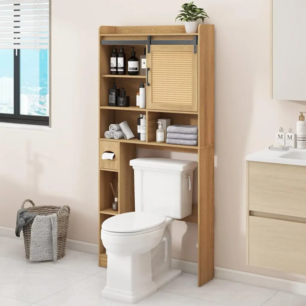 Over The Toilet Storage Cabinet With Sliding Door & Paper Holder Stand, Space-saving Rack, Oak