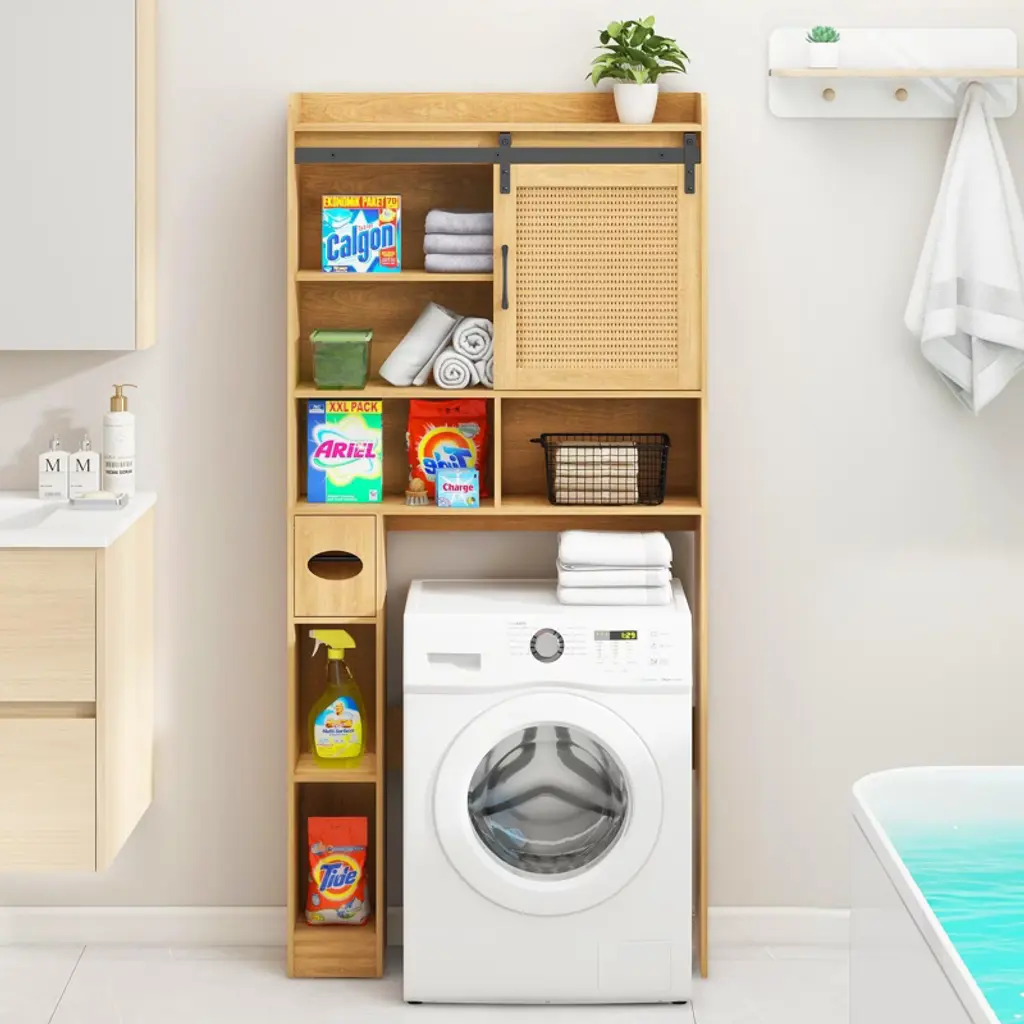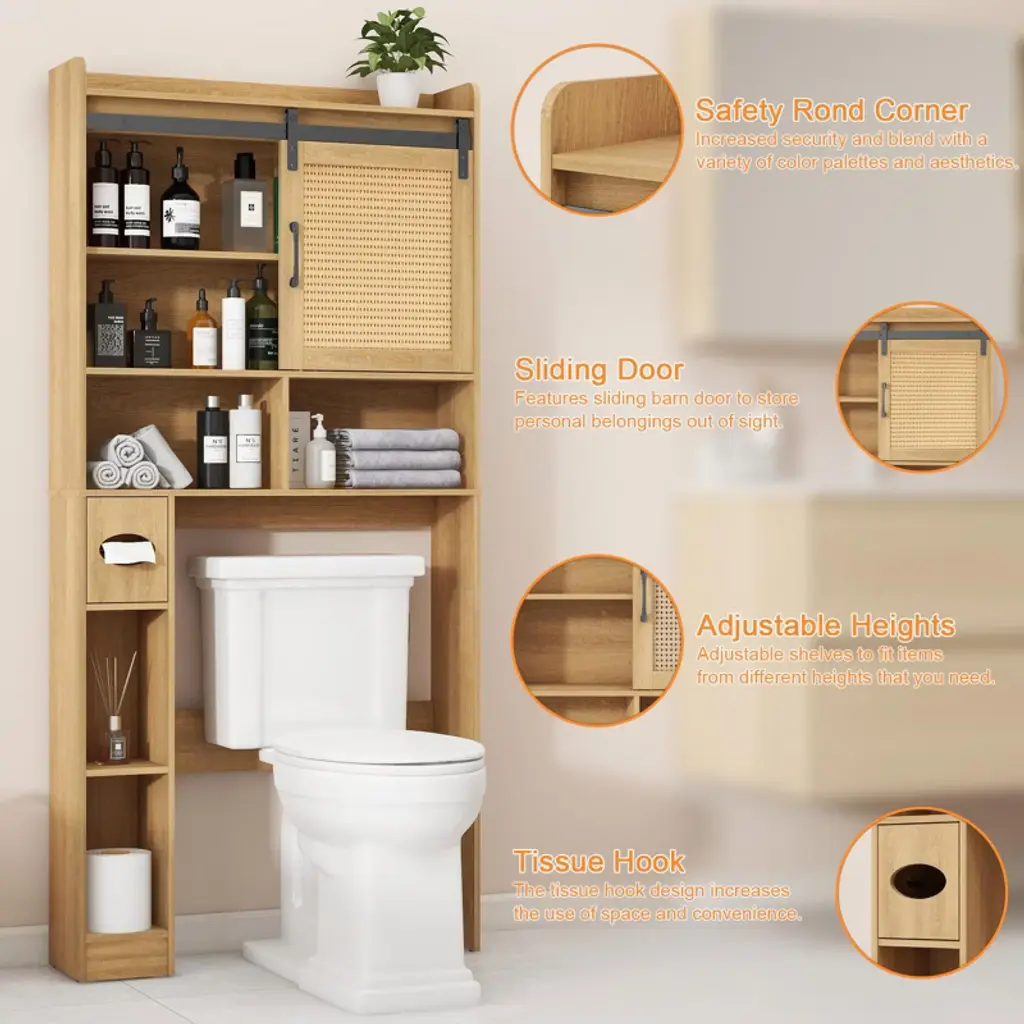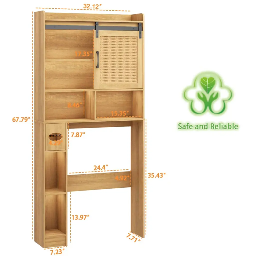 This farmhouse-style over-toilet rack, made of advanced engineering wood with neutral wood grain, fits various decors. It has a sliding barn door for hidden storage, open shelves, vertical cabinets for paper rolls, and a 3-position adjustable shelf. Measuring 67"x32"x7.7", it saves space. Easy to assemble with step-by-step instructions.