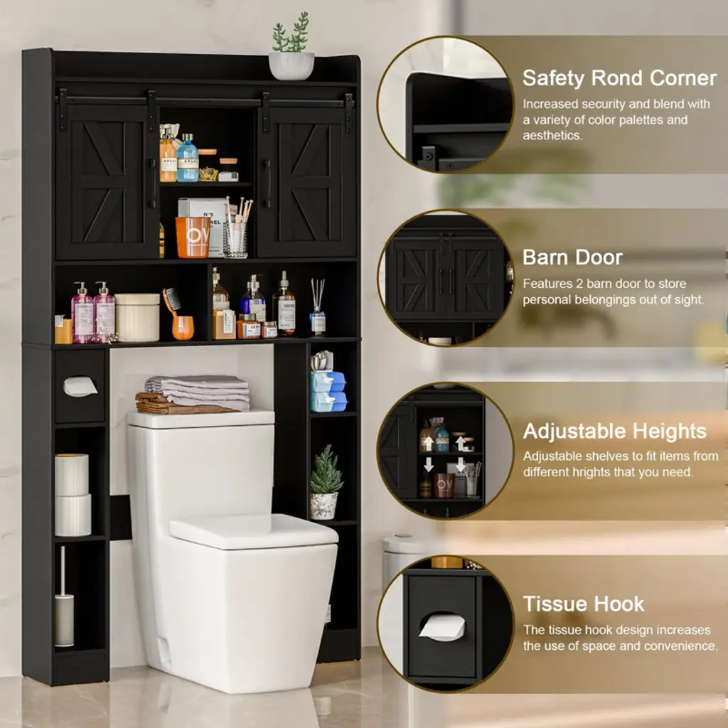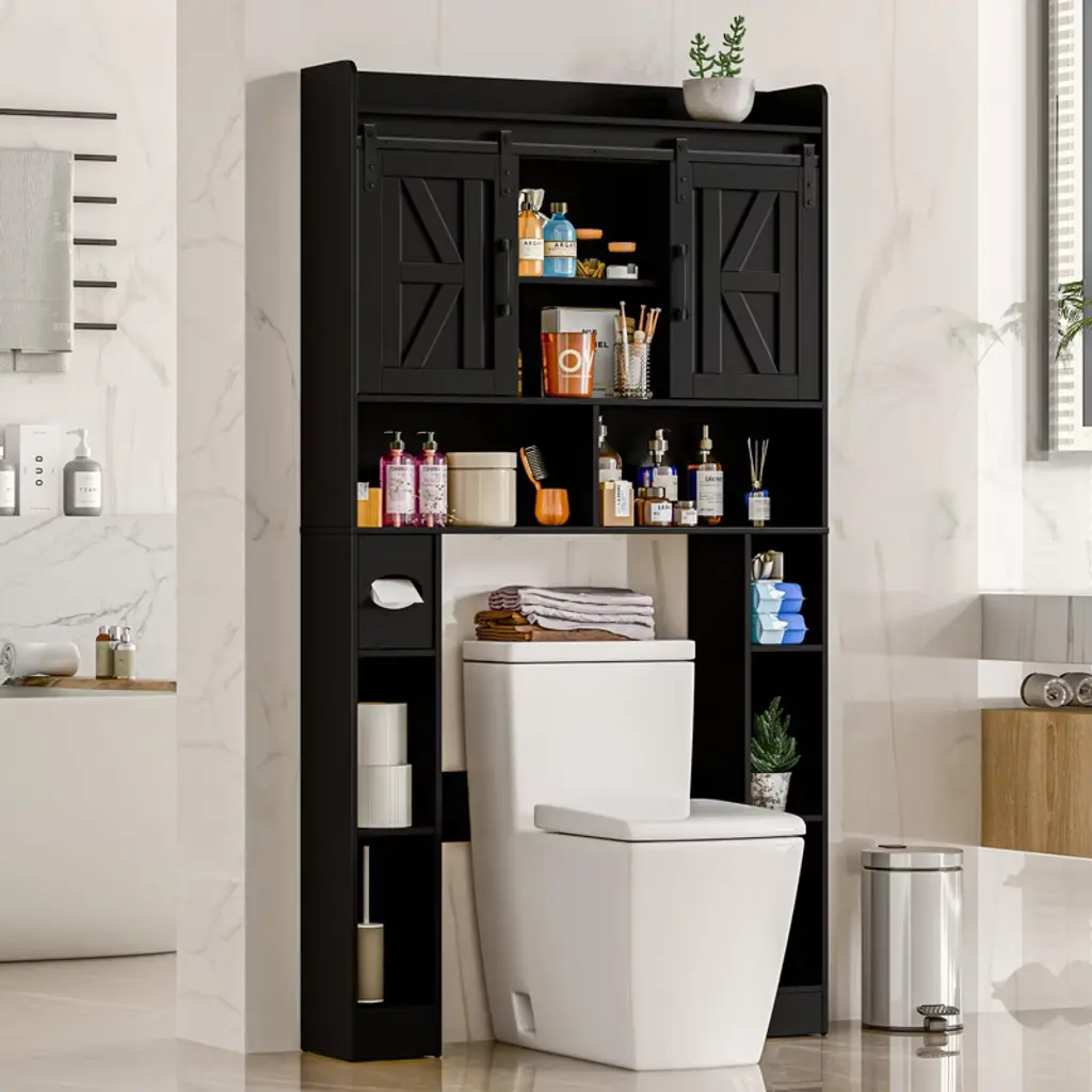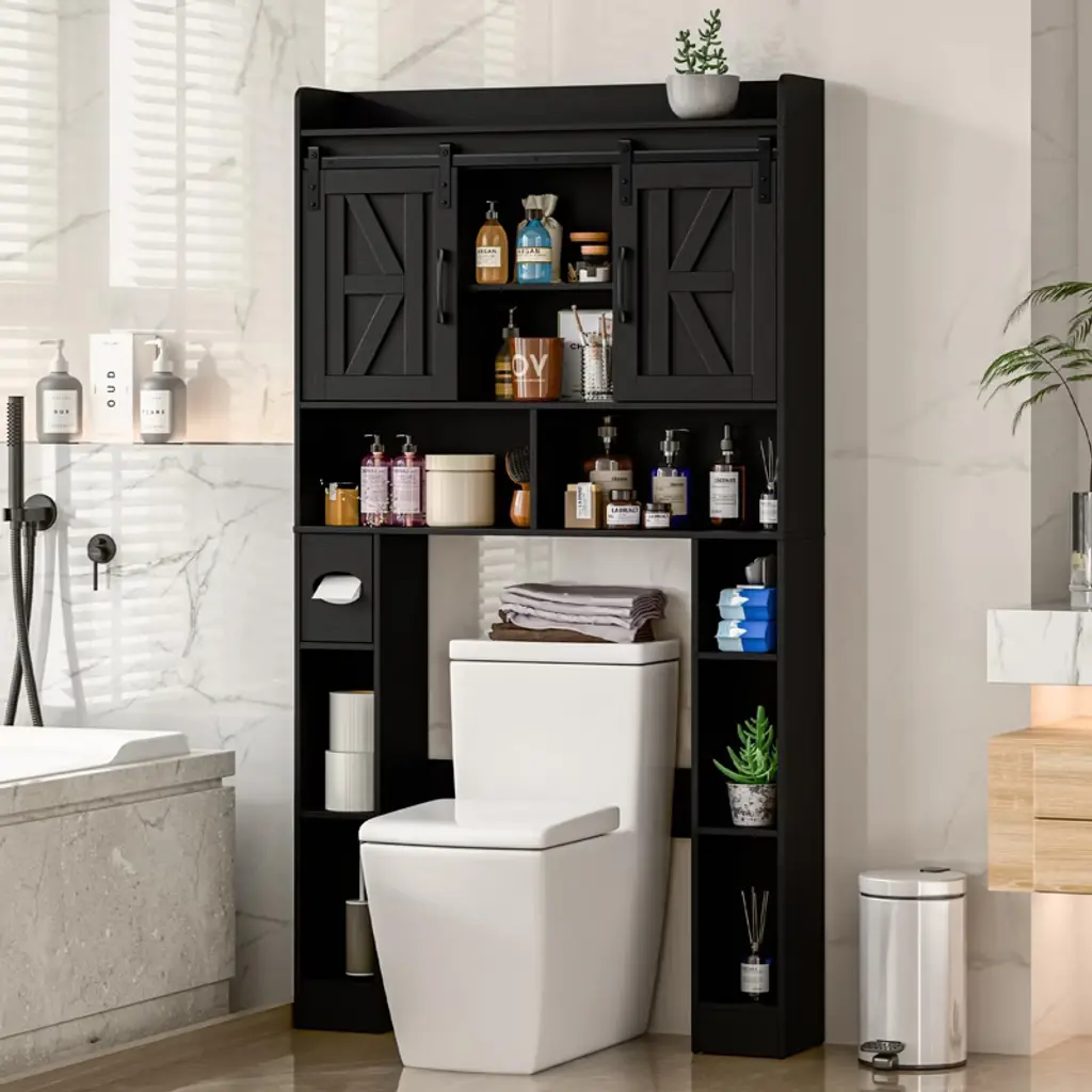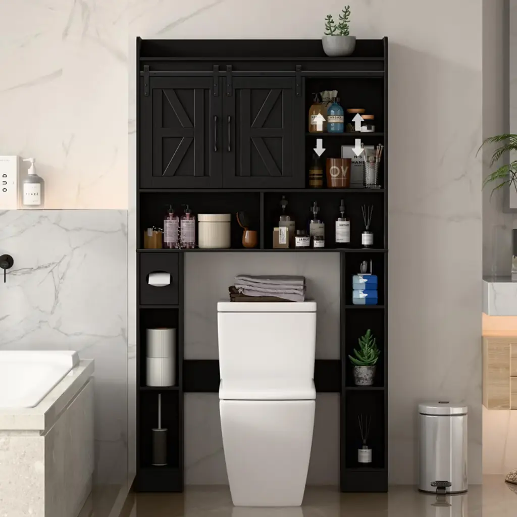 Over The Toilet Storage Cabinet With Sliding Doors, Home Space-saving Toilet Rack, Pure Black