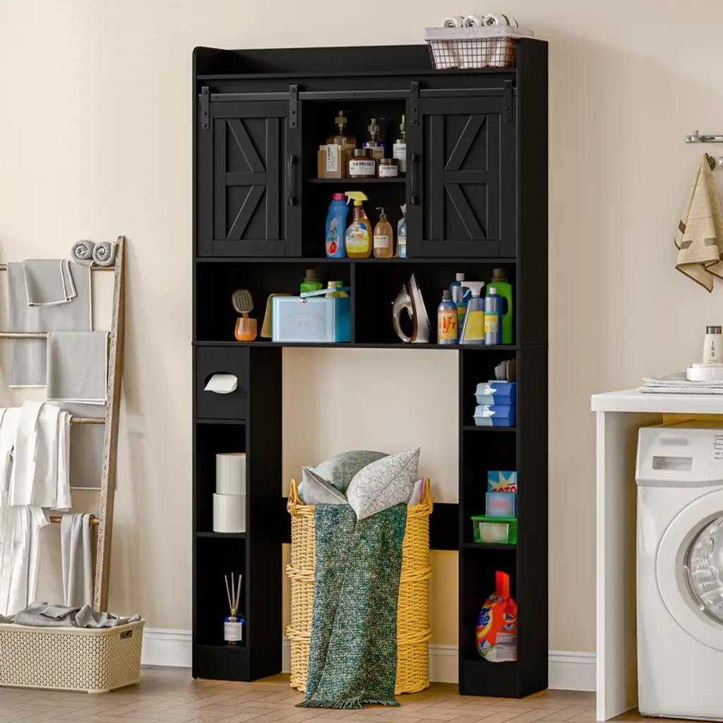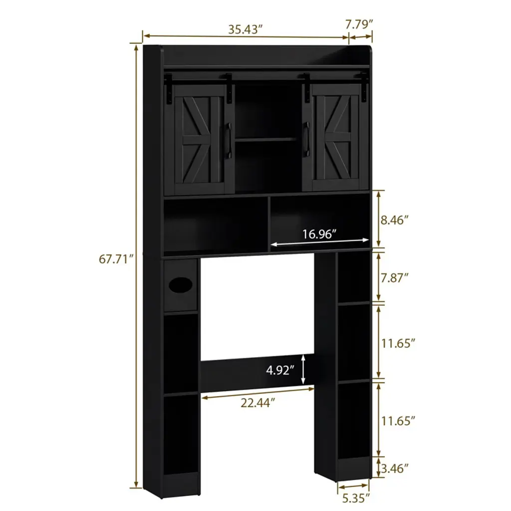 This over-the-toilet storage cabinet, made of high-quality engineered wood, blends farmhouse rustic charm with functionality. It features two sliding barn doors for hidden storage, open shelves for daily items, and three adjustable shelves to fit various-sized essentials. Measuring 67.7" x 35.4" x 7.79", its space-saving design works in both large and small bathrooms. Easy to assemble with clear instructions and labeled parts, a second person’s help is recommended for smoother setup.