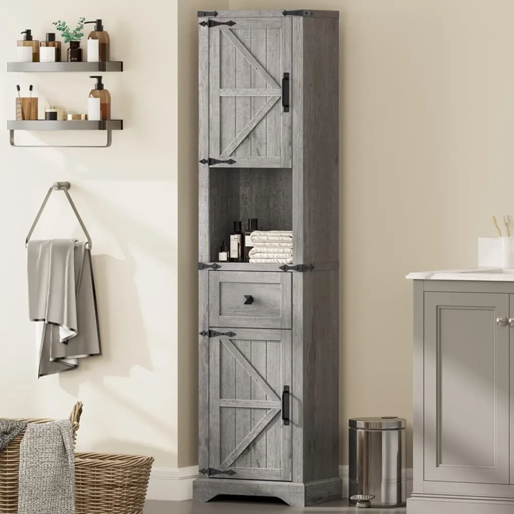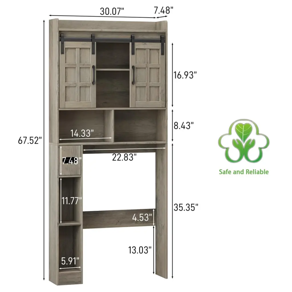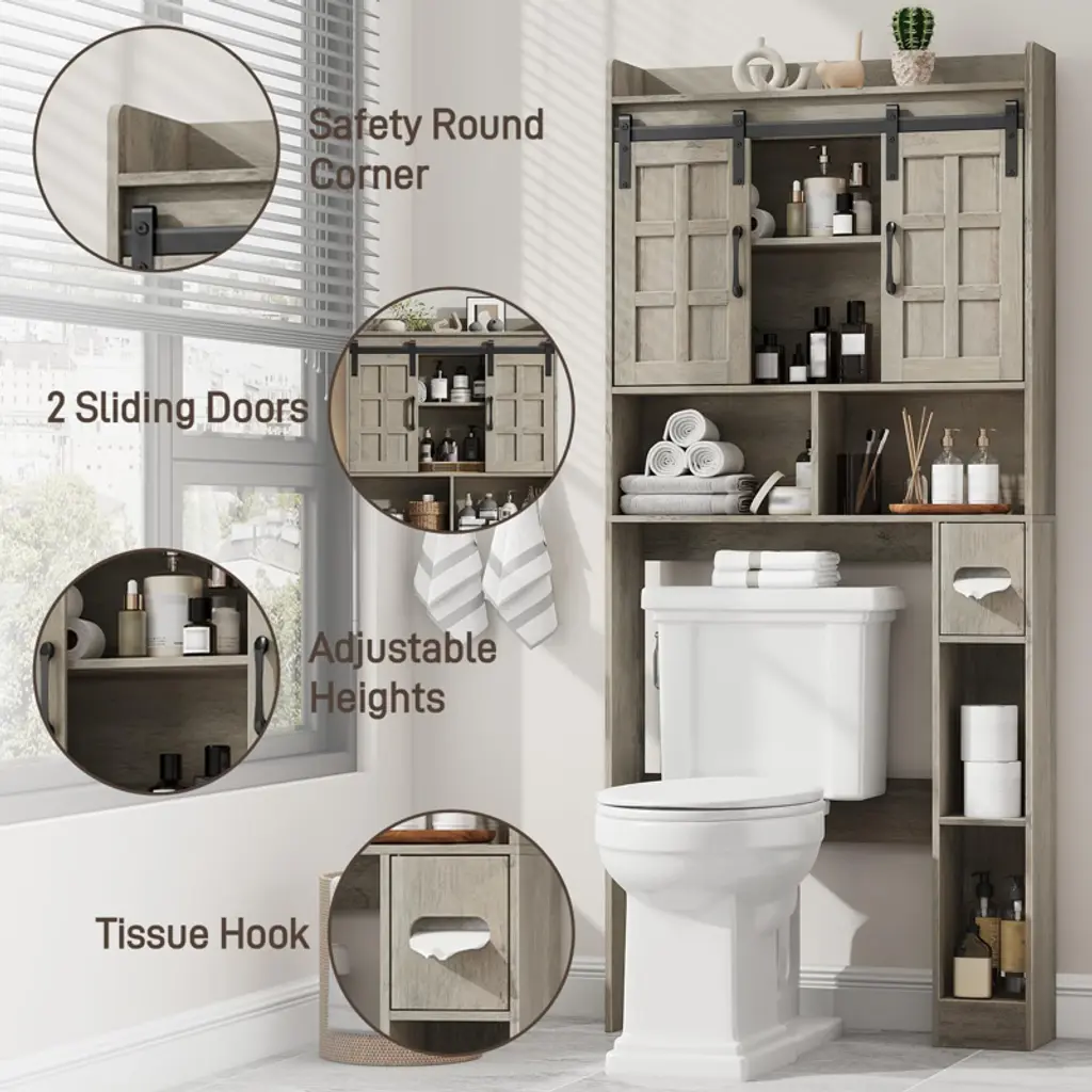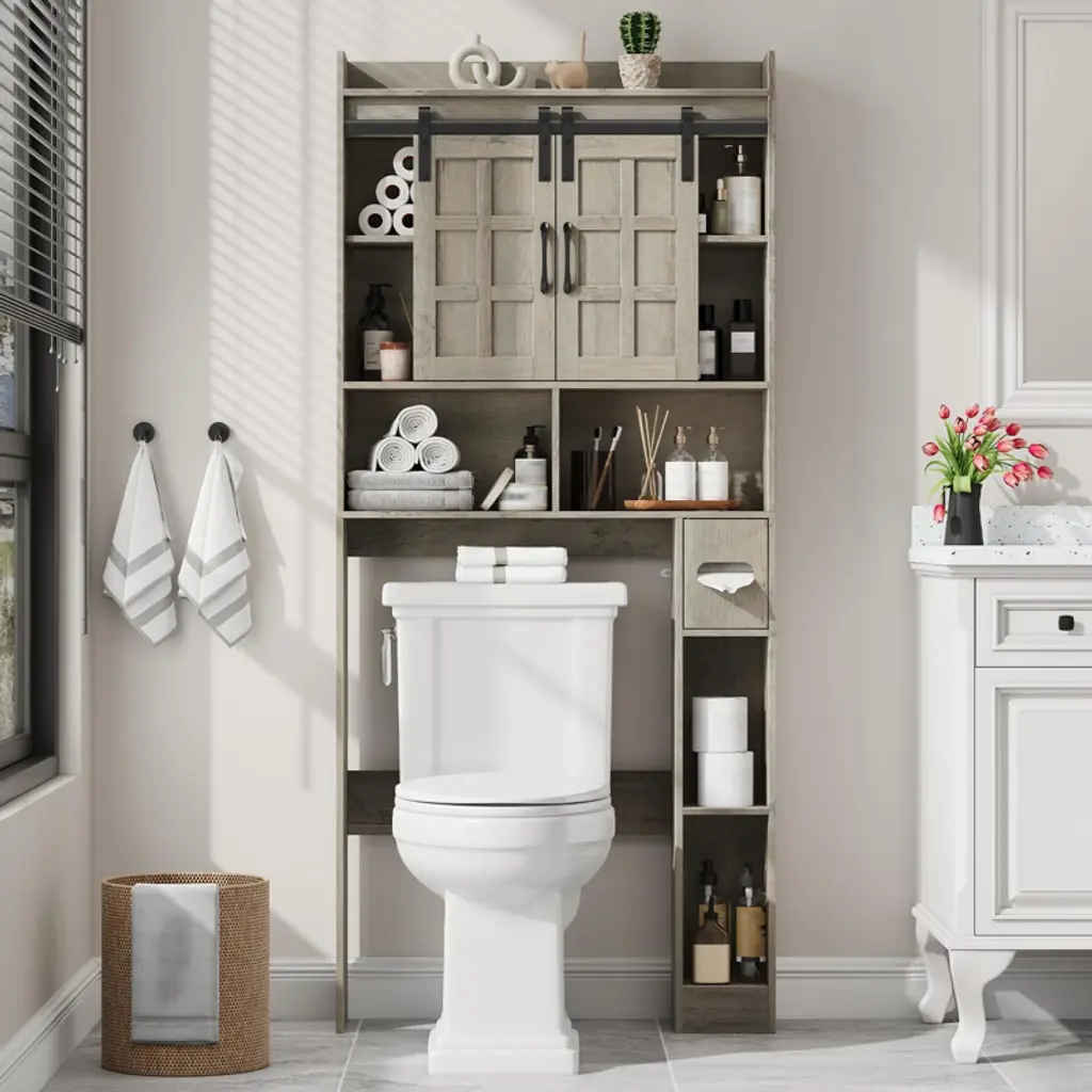 This over-the-toilet storage cabinet blends farmhouse charm with practicality, crafted from premium engineered wood with a natural wood grain finish that adds rustic elegance—its adaptable design works with diverse decor. It features two sliding doors for hidden towel/toiletry storage, open shelves for easy-access essentials, and vertical compartments for toilet paper, keeping bathrooms tidy. A 3-position adjustable shelf (height-adjustable, repositionable, or removable) lets you tailor storage to item sizes.
