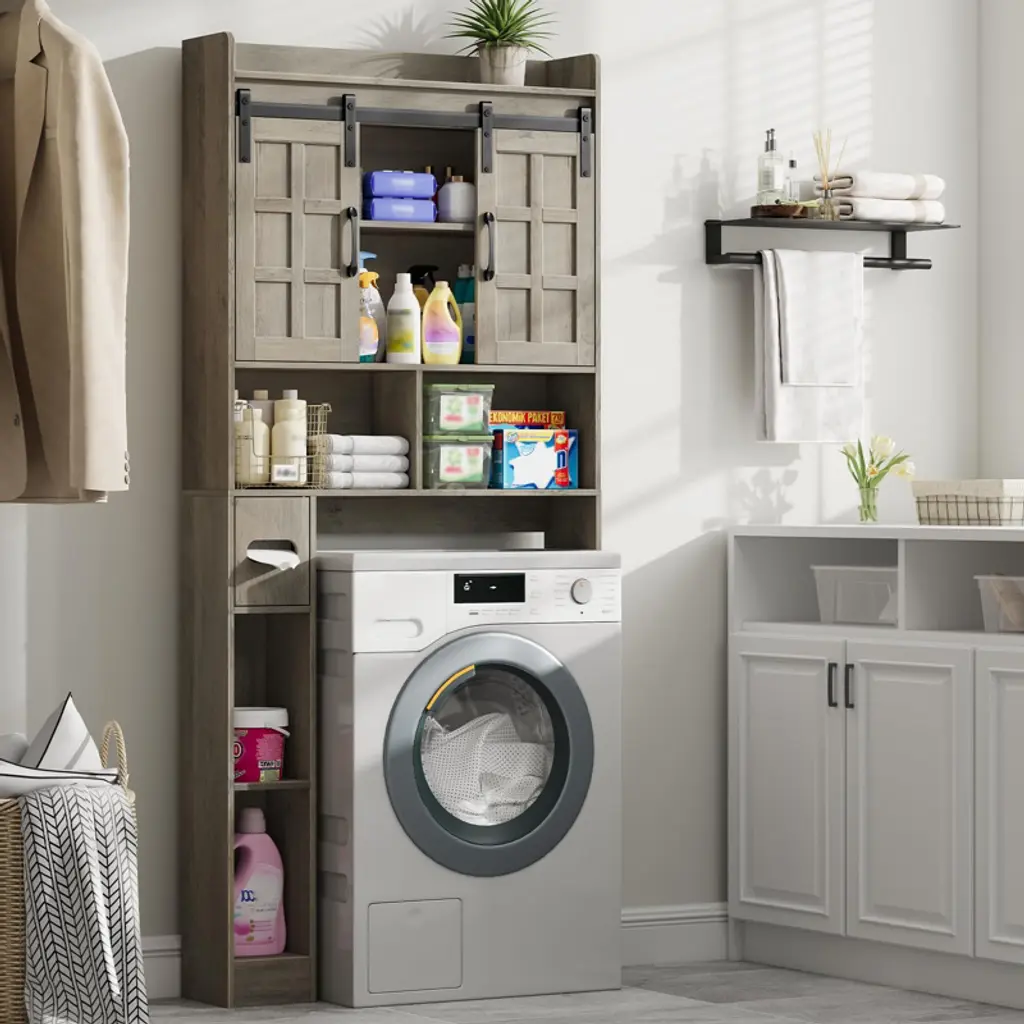 Over The Toilet Storage Cabinet With Sliding Doors, Home Space-saving Toilet Rack, Wash Grey