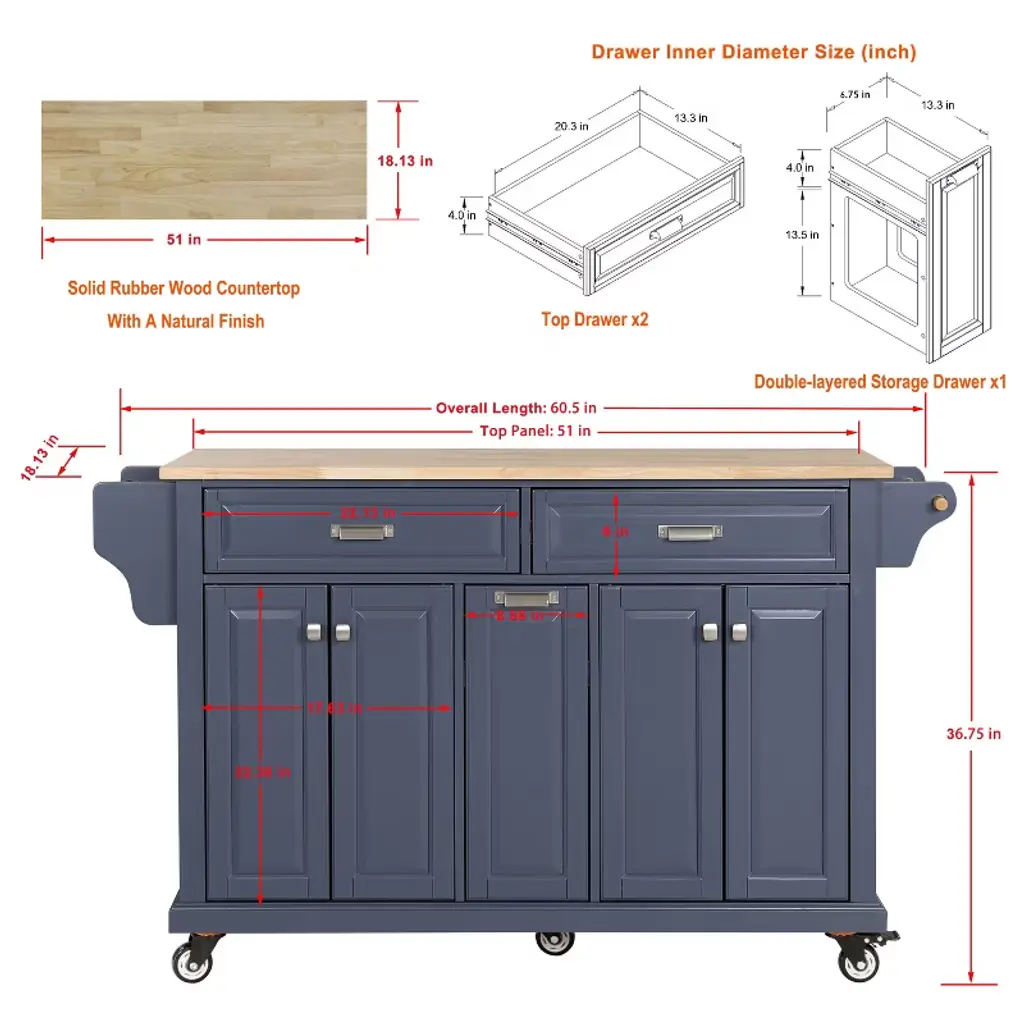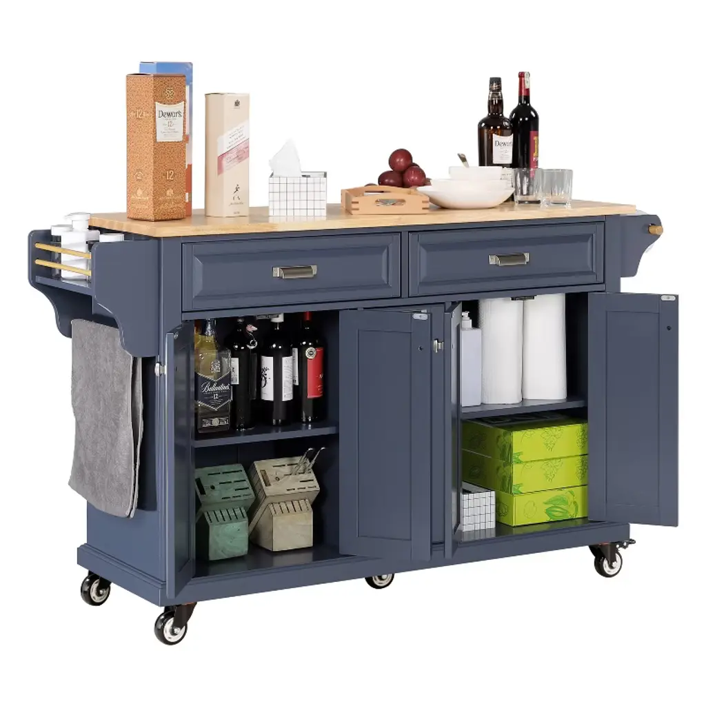 Paged Kitchen Island With Rubber Wood Countertop, Kitchen Cart On 5 Wheels With Storage Cabinet And 2 Top Drawers For Kitchen, Blue