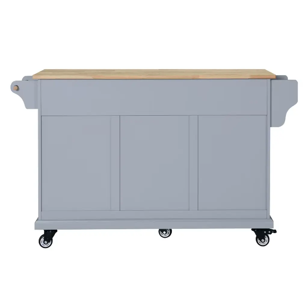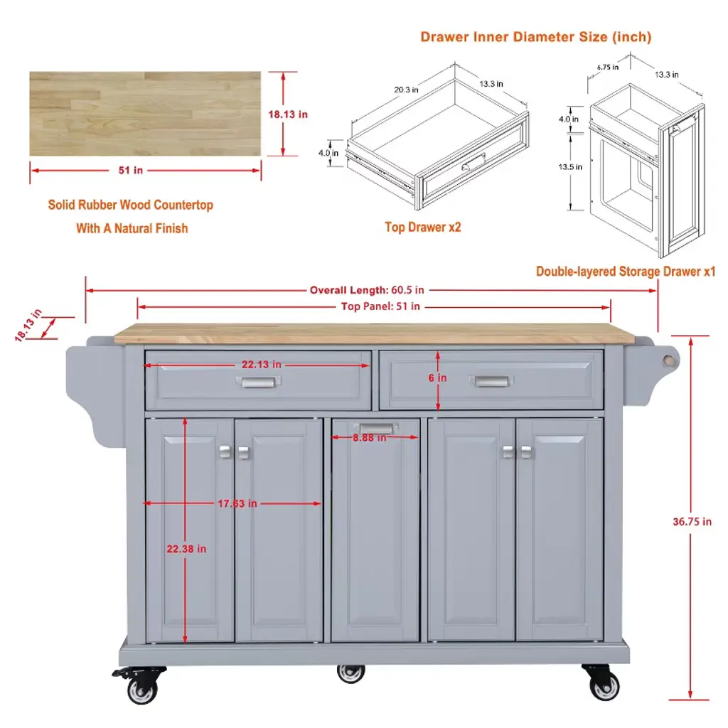 Paged Kitchen Island With Rubber Wood Countertop, Kitchen Cart On 5 Wheels With Storage Cabinet And 2 Top Drawers For Kitchen, Gray