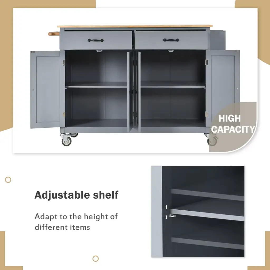 The kitchen island is constructed with sturdy and durable materials, providing reliable support and long-lasting performance for daily kitchen activities. Provides a spacious and practical workbench, perfect for cooking and other household chores. Optimized space utilization while maintaining the cleanliness and accessibility of essential items. Providing multiple uses in different areas of the home, from the kitchen to dining spaces, enhances practicality in various daily scenarios.