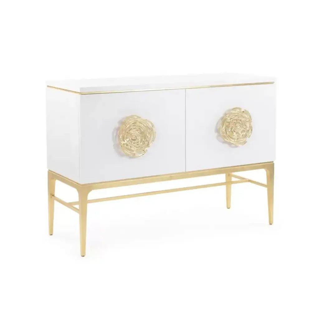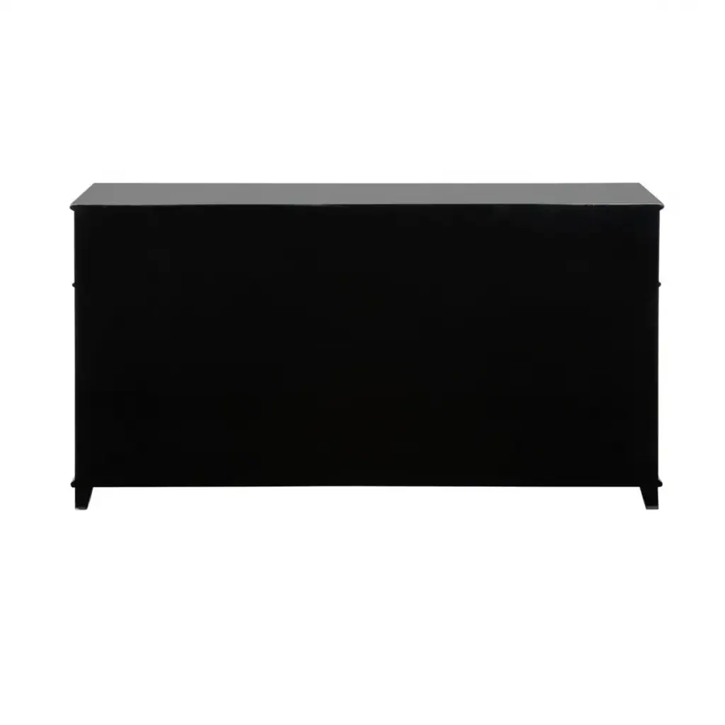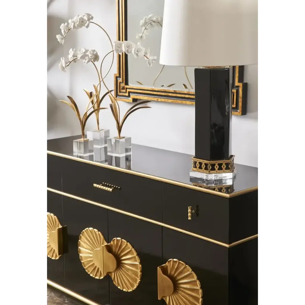 Make a grand statement at your next dinner party with the Palm Beach Buffet Cabinet. This piano black lacquer finished storage piece is sure to draw acclaim with its gold leaf shell accents and carved wood faux bamboo knobs. Designed by Kristi Nelson.
