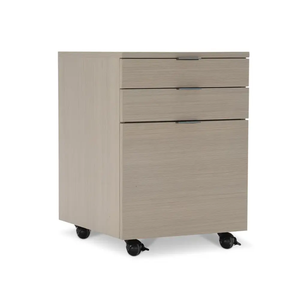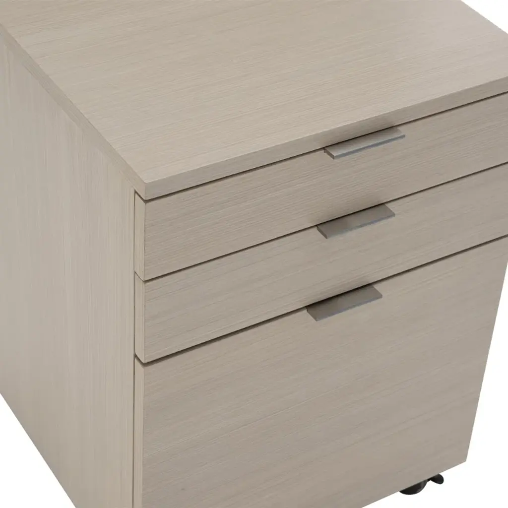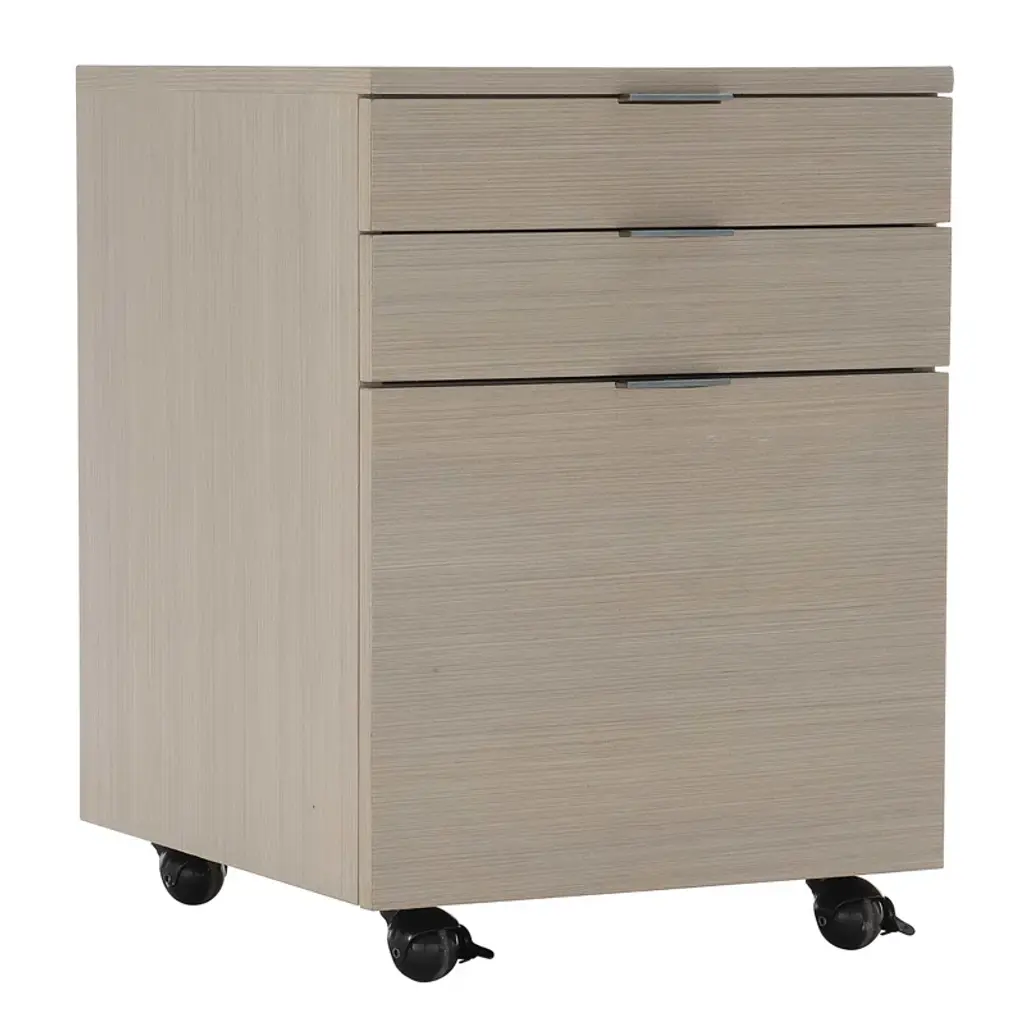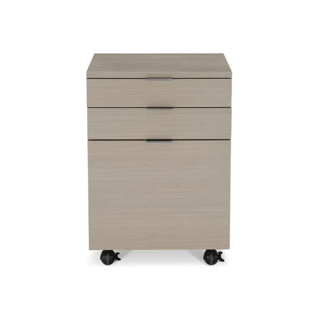 Bernhardt Workspace blends minimalist profiles and sophisticated finishes with a chic, modern feel. The Axiom file cabinet provides ample storage behind a no-fuss facade, making it highly functional as well as stylish. With three spacious drawers, it helps keep a workspace organized and uncluttered. Sleek metal hardware and a linear wood grain in Linear Grey finish create a look of subtle sophistication.