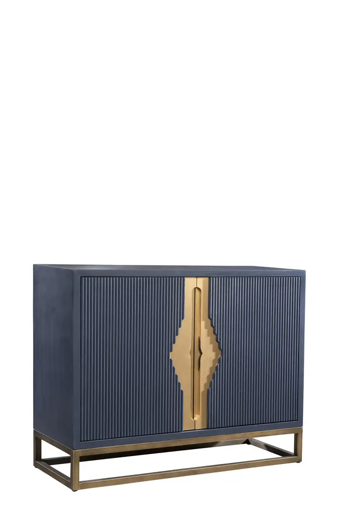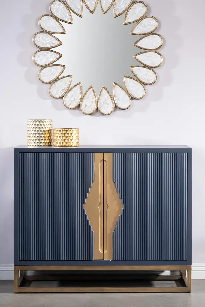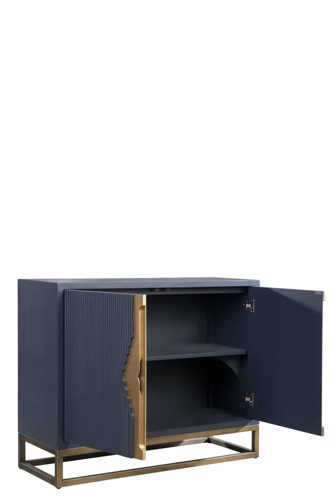 2 doors accent cabinet, adorned with fluted doors and gold pull handles wood has the most beautiful shade of gray color with blue undertone. 1 shelf in the middle . Shelf measurements: 37.5"wx14.25"dx12"h Care Instructions: Dust with a cloth