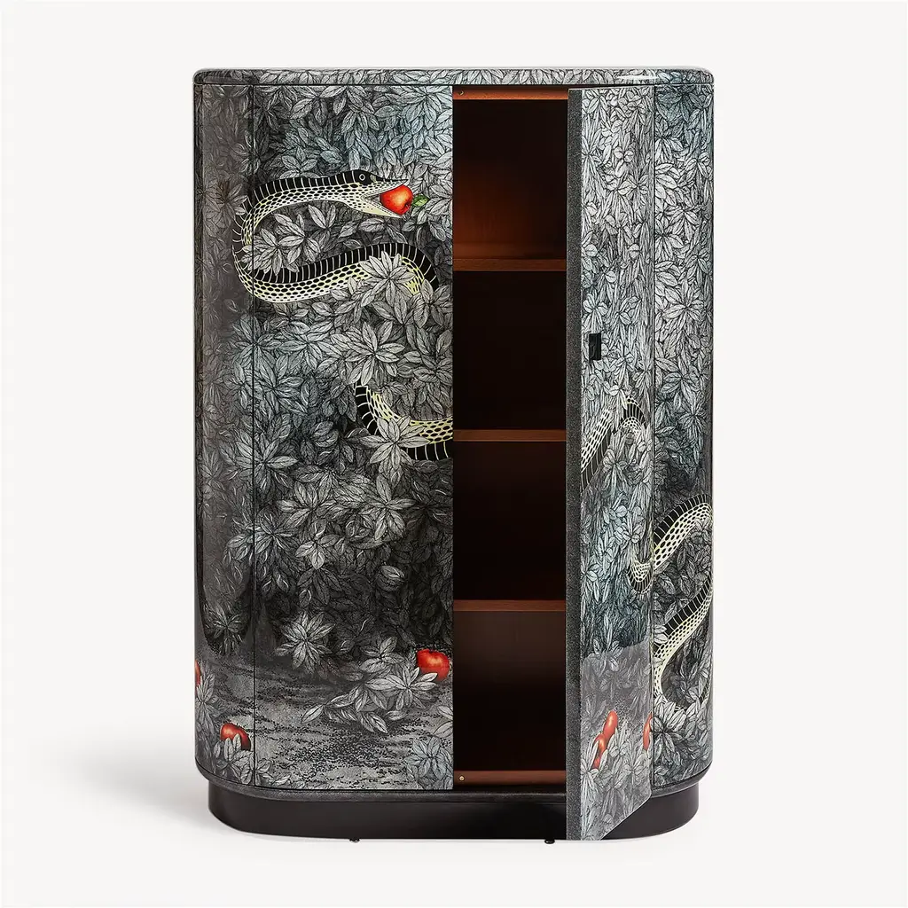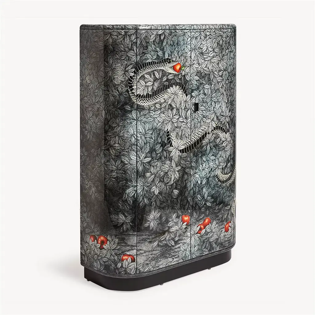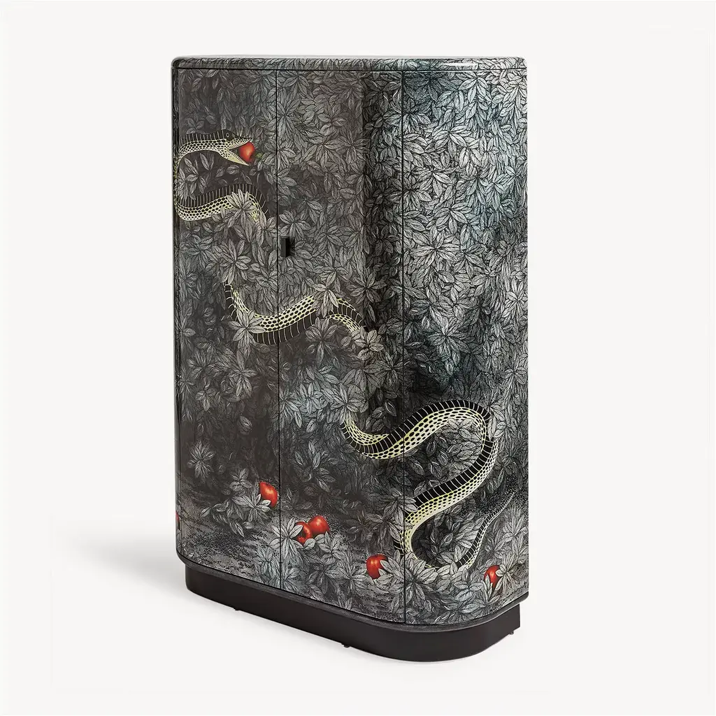 This cabinet with its rounded, elegant shapes quickly became one of the most popular classics of all time. Silkscreened, painted, and lacquered by hand, it is decorated with the tempting snake, an eternal symbol of seduction and an example of Fornasetti's timeless aesthetic. Any minor discrepancies between similar creations are the result of craftsmanship and attest to the uniqueness of each product.