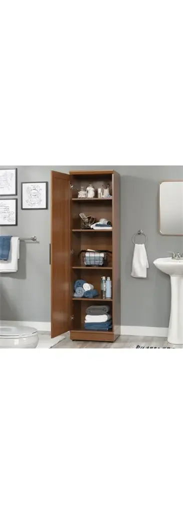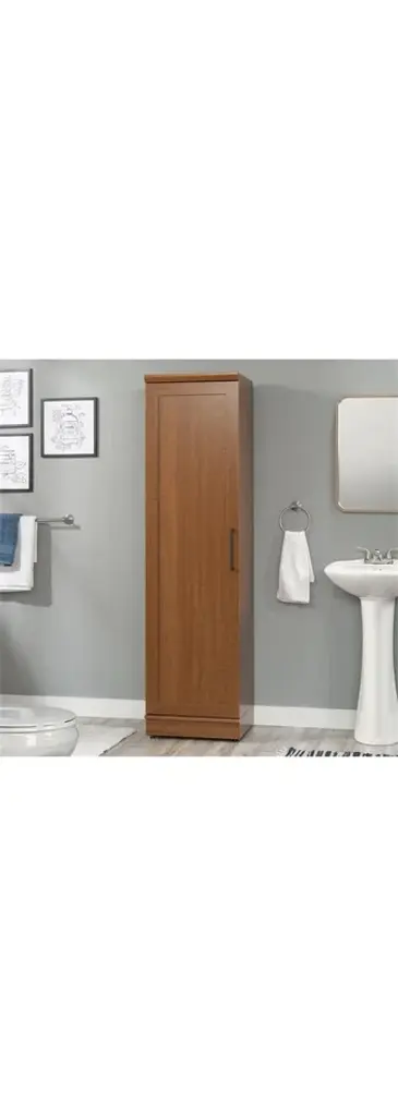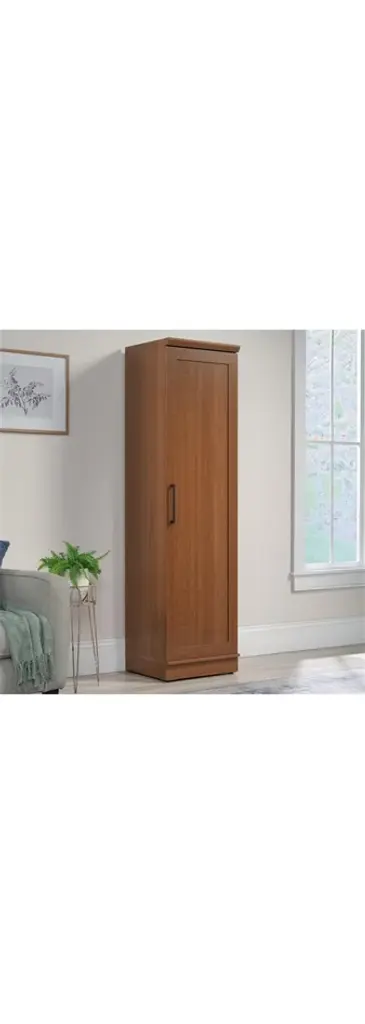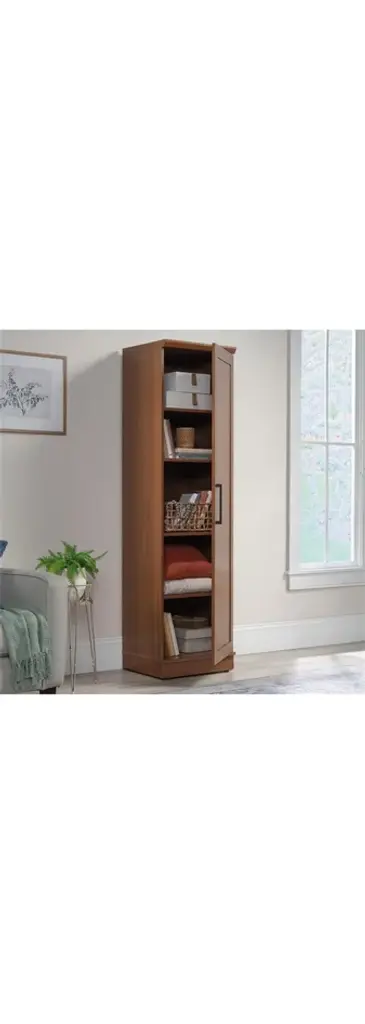 Behind every good cook stands an organized pantry and a kitchen storage cabinet with space to hold each delectable ingredient. The single door storage cabinet from the collection will stand up to clutter and disorganization, from tall boxes of cereal to baskets of spices, the three adjustable shelves and one fixed shelf provide the ultimate, versatile storage space. The reversible door of this pantry storage cabinet opens to the left or to the right for easy and versatile placement within any room or storage area, while adjustable levelers at the base provide a secure and reliable unit for your home. This one-door storage cabinet is the perfect addition to a dining room, with space for tablecloths, glassware, dishes, or flower vases. The perfect pantry is achievable for every household with this narrow storage cabinet, finished in golden Sienna Oak. It provides adaptable shelving and plenty of space to help organize the kitchen, garage, or just about any room in your home.Features:Finish: Sienna OakMaterial: Engineered woodThree adjustable shelves will accommodate pantry items of all shapes and sizes.One fixed shelf in the center plus the bottom shelf provides five total shelves.Reversible door opens to the left or right providing versatile placement in any room.Adjustable base levelers for alignment on uneven flooring.Specifications:Product Dimensions: 70.945" H x 18.819" W x 17.087" DProduct Weight: 77.05 lbs.
