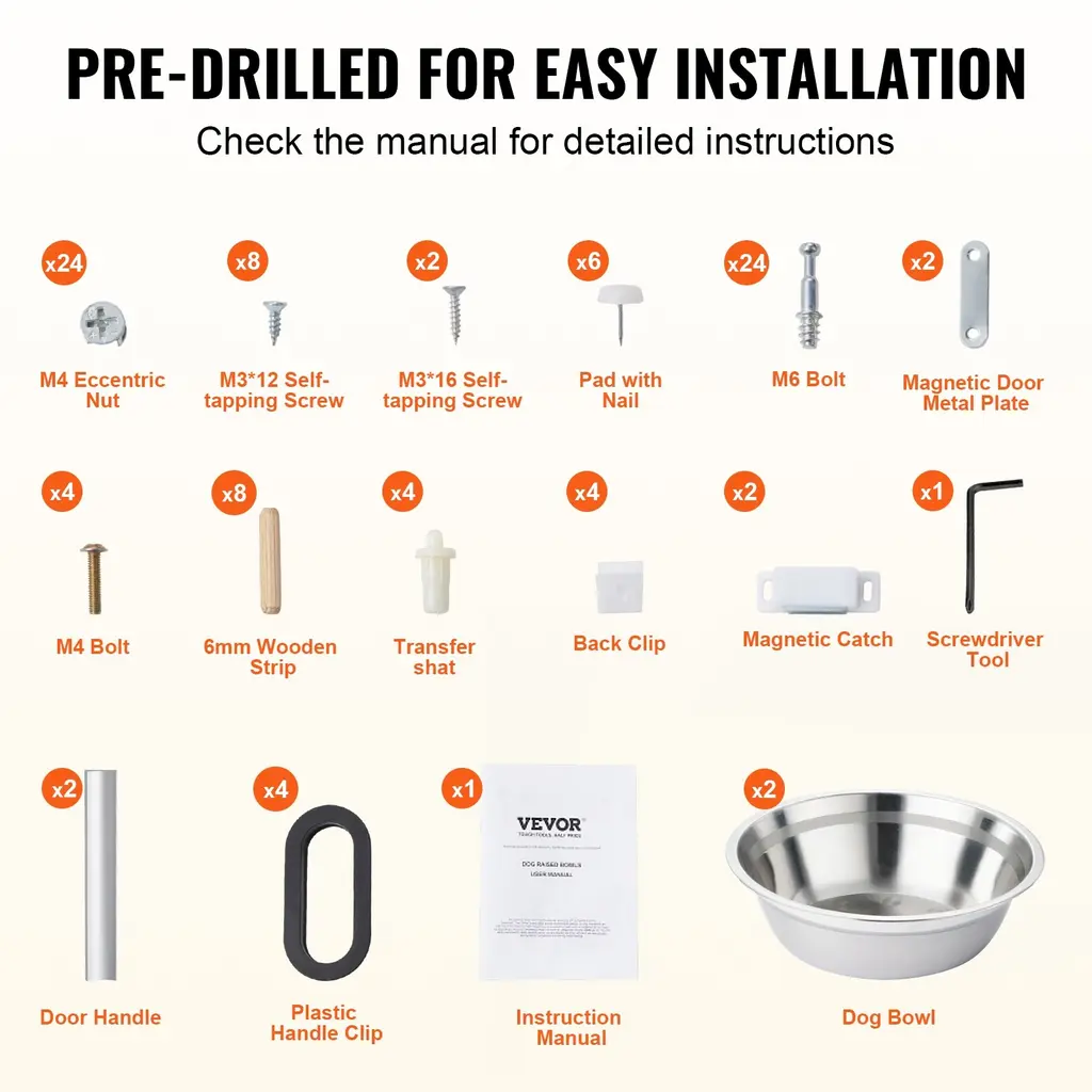 Comfortable Feeding for Your Pet: Our wooden feeding station with storage cabinet features an ergonomic design that elevates the dog bowls, reducing neck strain and protecting your pet's neck. Includes two 0.53-gallon stainless steel bowls to meet your dog's feeding needs. Ample Storage Space: More than just a raised dog bowl stand, this cabinet is a large storage cabinet for all your pet supplies. The double-door storage area accommodates pet food, treats, toys, coats, and decorations. Easy Installation and Maintenance: Designed with pre-drilled holes, this feeding station is simple to assemble with minimal tools following the instructions. The melamine MDF surface is smooth, waterproof, and easy to clean. Versatile Use: With its elegant white finish and sleek design, it adds sophistication to any room. Use it as a coffee table, storage rack, or side table in your living room, bedroom, hallway, or kitchen. What You Will Receive: Dog Bowl x 2, M3 Self-tapping Screw x 8, M6 Bolt x 24, M4 Eccentric Nut x 24, M4 Screw x 4, Black Handle x 2 Pairs, Door Handle x 2, Wooden Strip x 8, Pad with Nail x 4, Magnetic Catch x 2 Sets, Instruction Manual x 1 Package Content 1 x Pet Feeding Station 2 x Dog Bowl 1 x Instruction manual Installation Pack