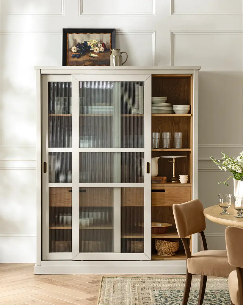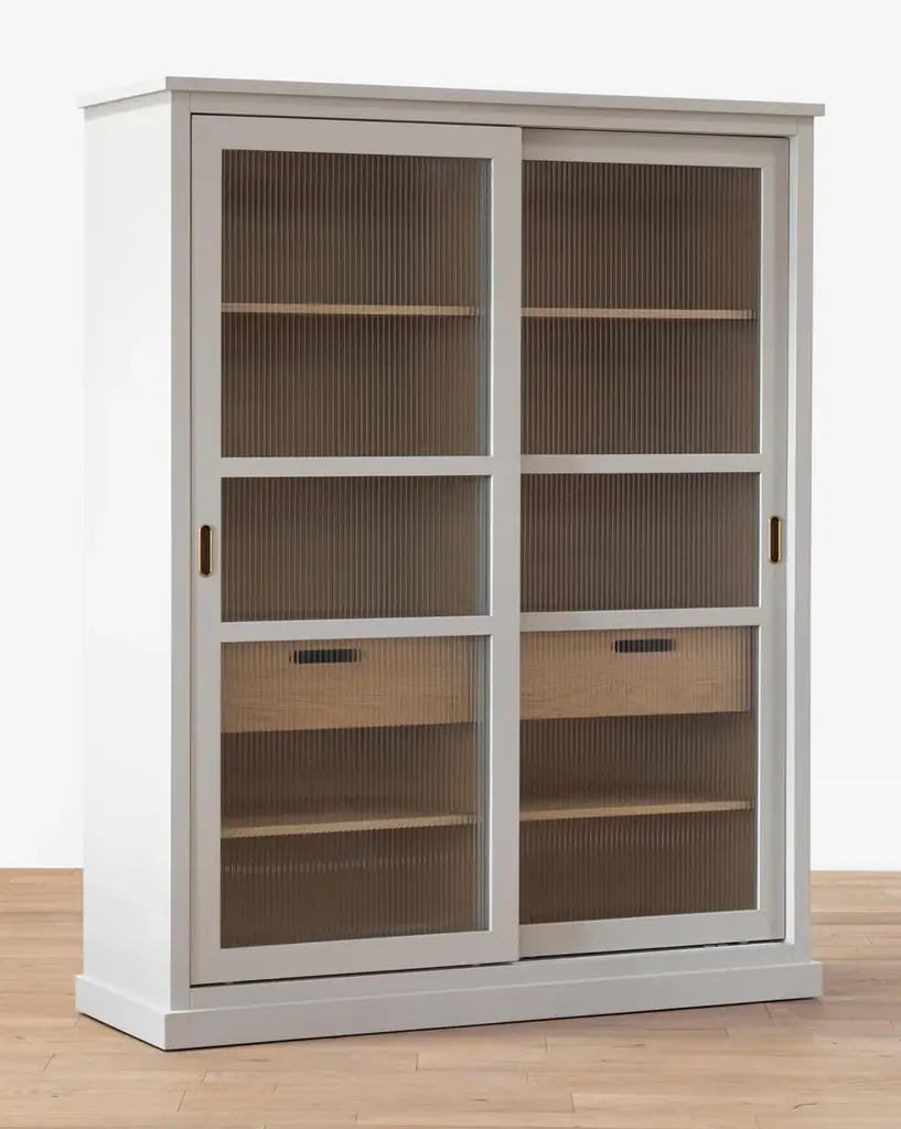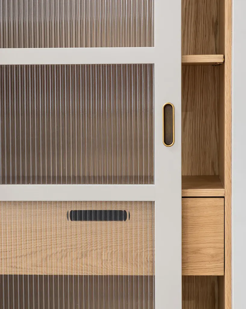 A sleek and innovative painted oak cabinet, the Phillips Cabinet brings a classic meets modern design to your space. Its sliding reeded glass doors open up to functional shelves that are perfect for styling your items. With antique brass handles, this oak cabinet is all about the details.