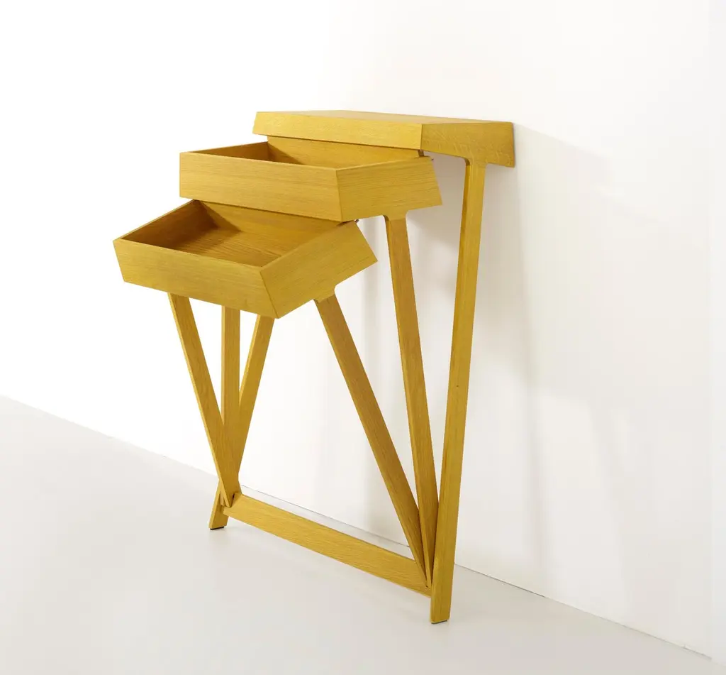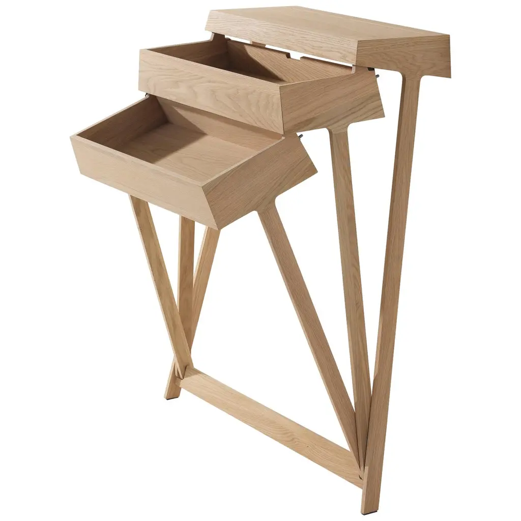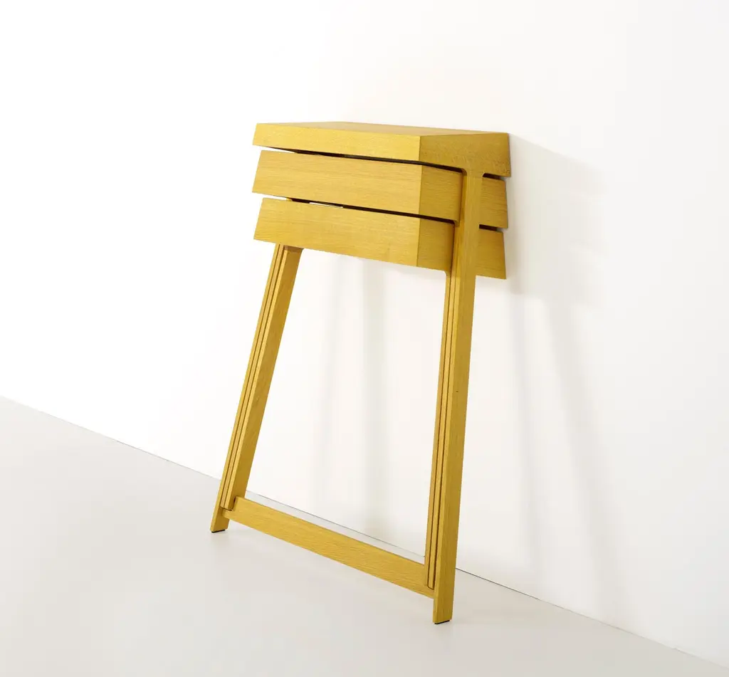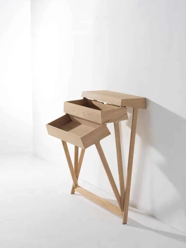 Pivot is a solid wood cabinet which is built on tall legs and features two drawers. The innovative aspect of this cabinet is the fact that the drawers can hinge, making it possible to open both drawers at the same time, which is impossible with a conventional set of drawers. This surprising cabinet is ideally suited to storing small items and everyday necessities in order to make sure these are always in the same place. Very useful during morning rush hour at home!