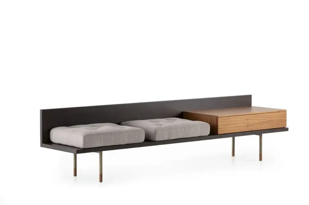 PLANK is a TV stand, but above all, it is a multifunctional furnishing element designed for those who love to combine practicality and aesthetics in every space of the home.Designed by architect Norberto Delfinetti, Plank stems from a design vision focused on smart versatility, transforming the piece into a cross-functional solution for both living areas and entryways.Made of wood, with refined finishes and clean lines, it naturally fits as an entryway bench, living room sideboard, or TV unit.The option to add drawers or padded cushions makes it flexible and customizable—ideal for contemporary spaces that demand both style and functionality.With Plank, functionality meets design, bringing character to any setting.Multifunctional bench with a solid canaletto walnut or ash wood structure, and a metal base with wooden details.Optional features: drawer (with push & pull opening) and cushion (optional cushion upholstered in fabric from the collection).