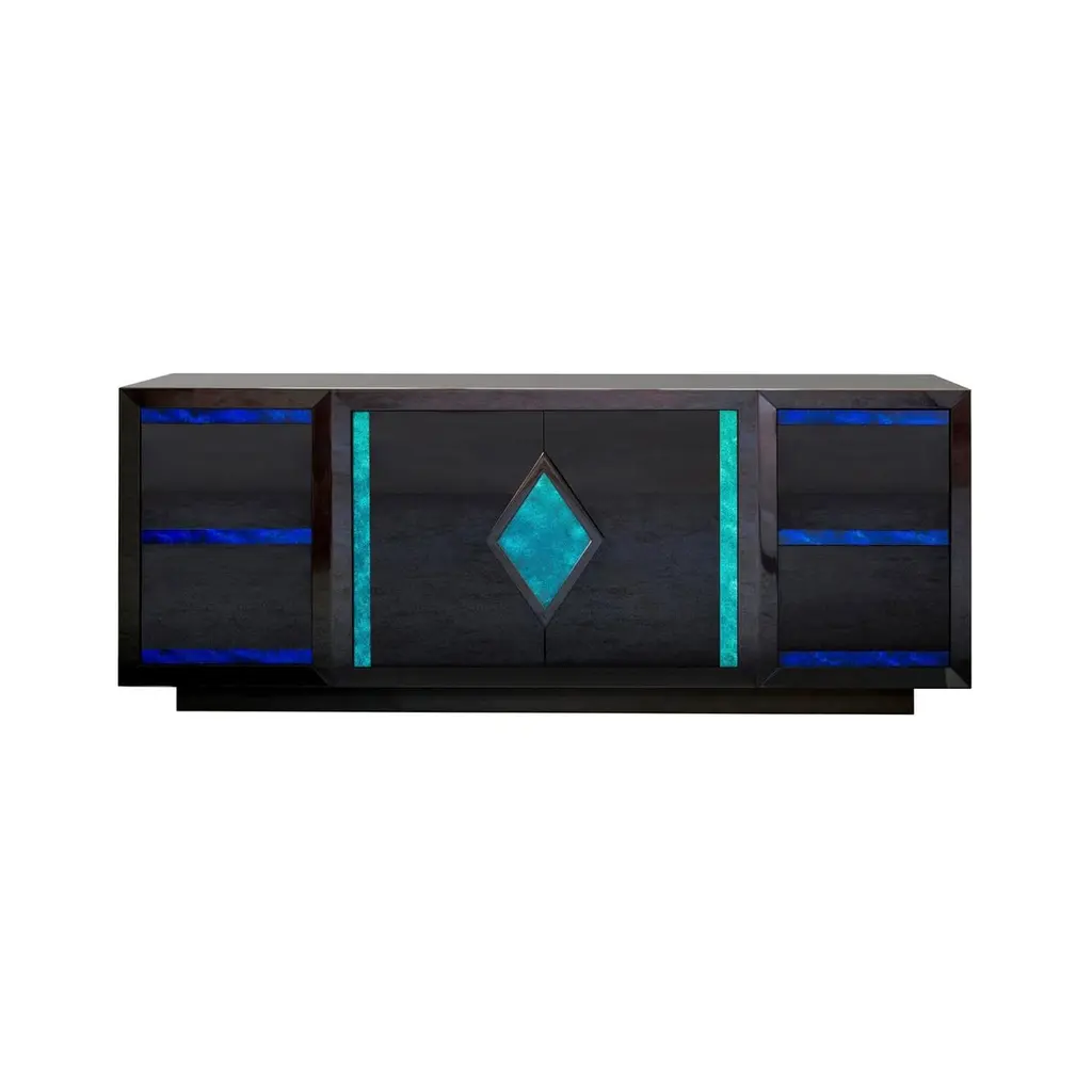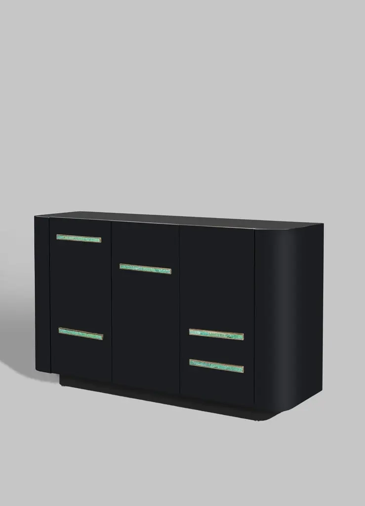 Plaza Cabinet in Brass with Semi Precious Stones, Viya by Vikram GoyalHow society rejoiced when Art Deco dared to create a new approach to life, breathing fresh life into architecture, fashion, and art. Its spirit continues to endure and remains visible in the city of Bombay, home to one of the largest numbers of Art Deco buildings in the world. Of particular beauty are its famed cinema halls, after which these objects are named—a homage to the enduring beauty of an era that dared to dream anew.Cabinet in wood with semi precious inserts. Handmade in India.Product DetailsMaterial: WoodInlay: Brass, Dark Green AventurineSize: 60"L x 18"W x 36"H 152.4 L x 45.7 W x 91.4 H cmWeight: 165 kg 363 lbsNumber of Pieces: 1 CabinetSKU: VCA601This product has been handcrafted by local artisans. As such, slight variations are a testament to the unique character of a piece made by hand.