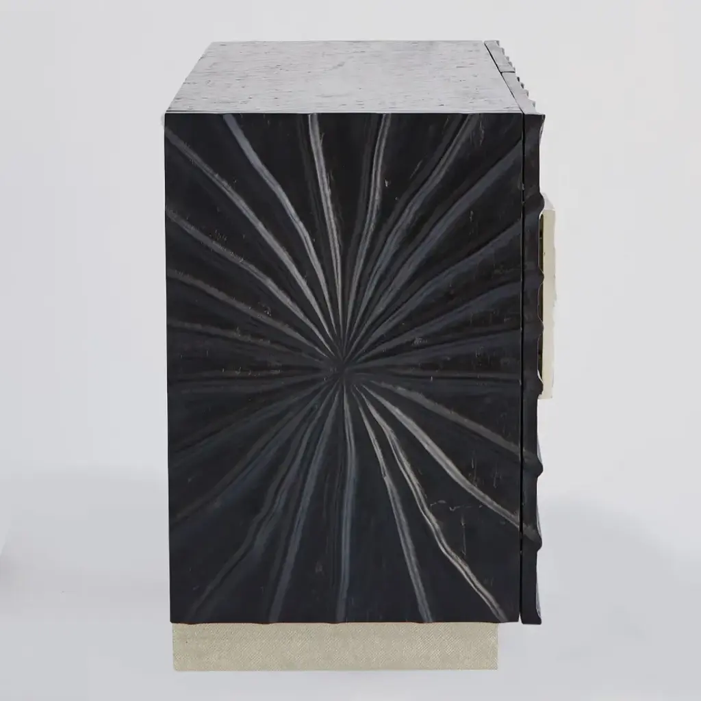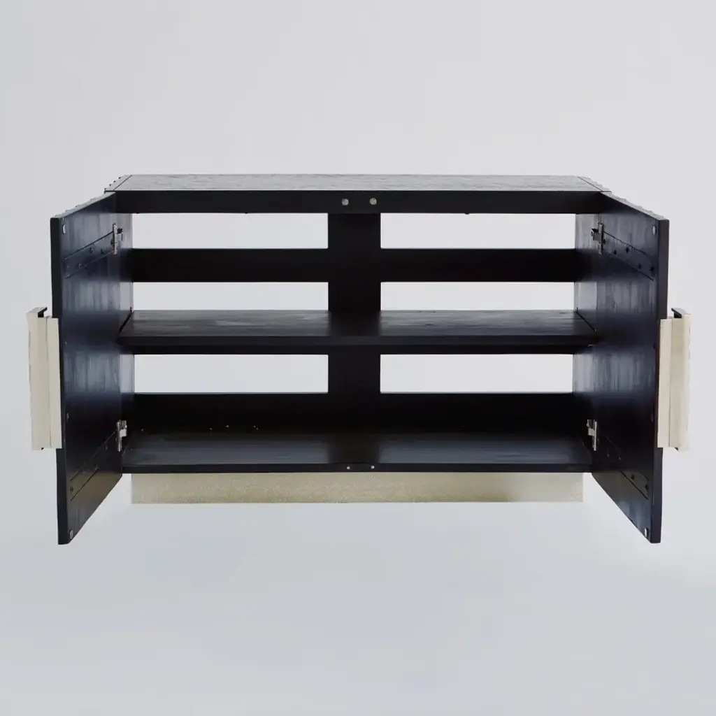 Pleated Media cabinet is vintage inspired. Textured pine wood in a black onyx finish with cast aluminum, door pulls. Equipment cooling slat back and adjustable shelves with a metal clad base. From a fashion forward perspective, Global Views offers accessories, furniture, statement lighting, and an assortment of rugs and mirrors to add beauty and joy to your home.