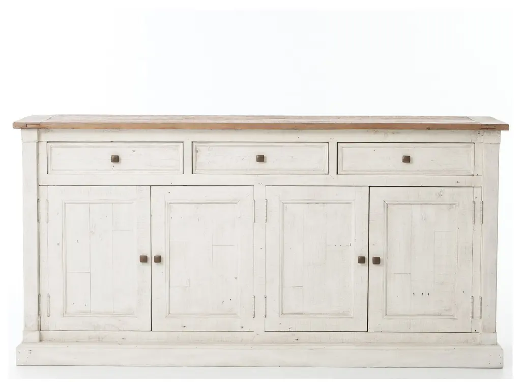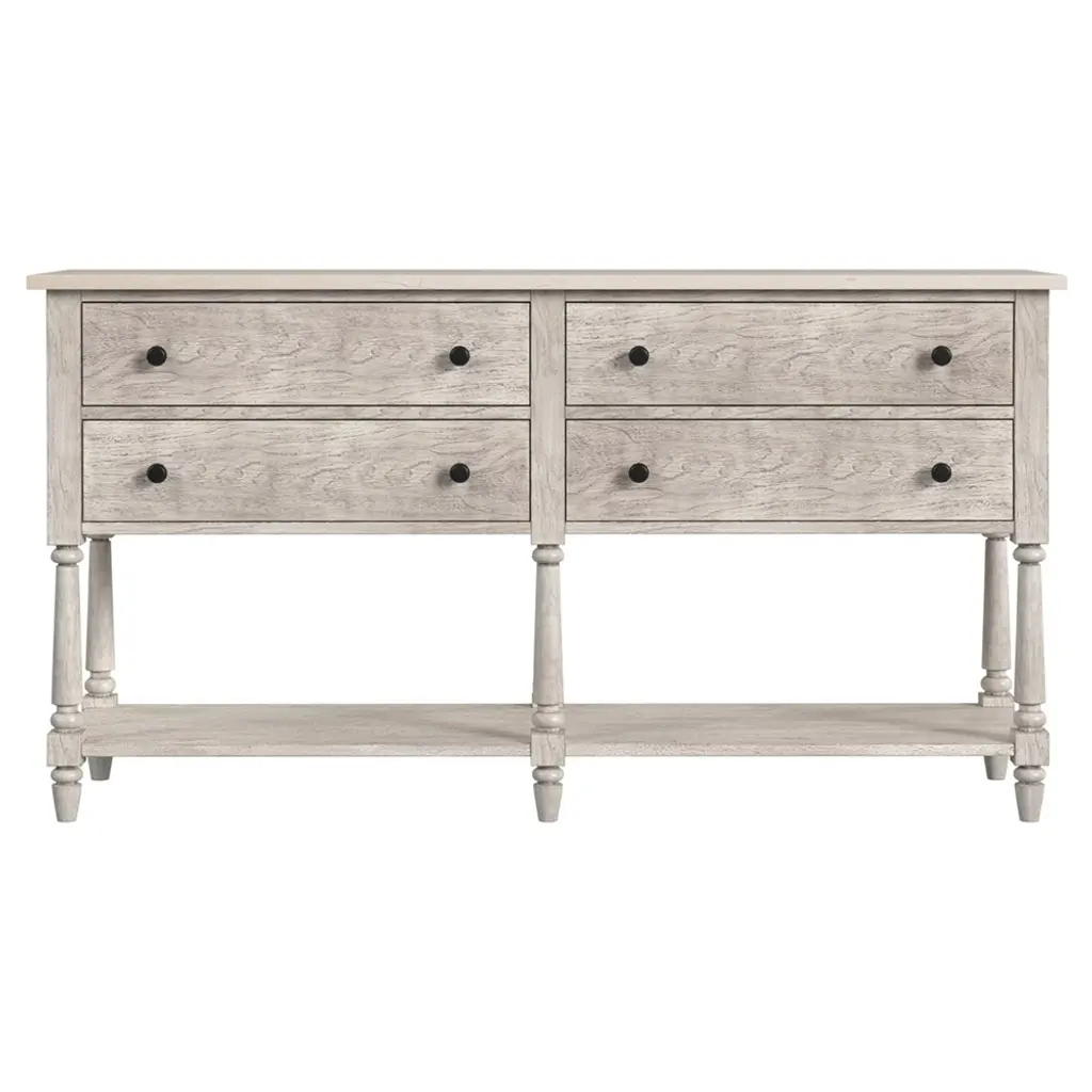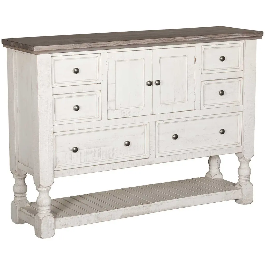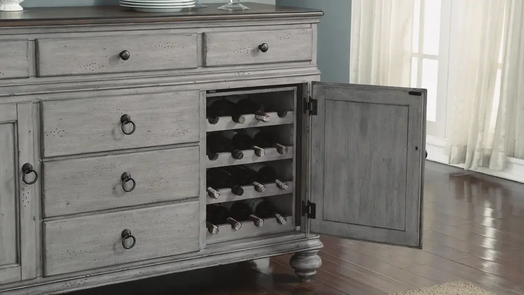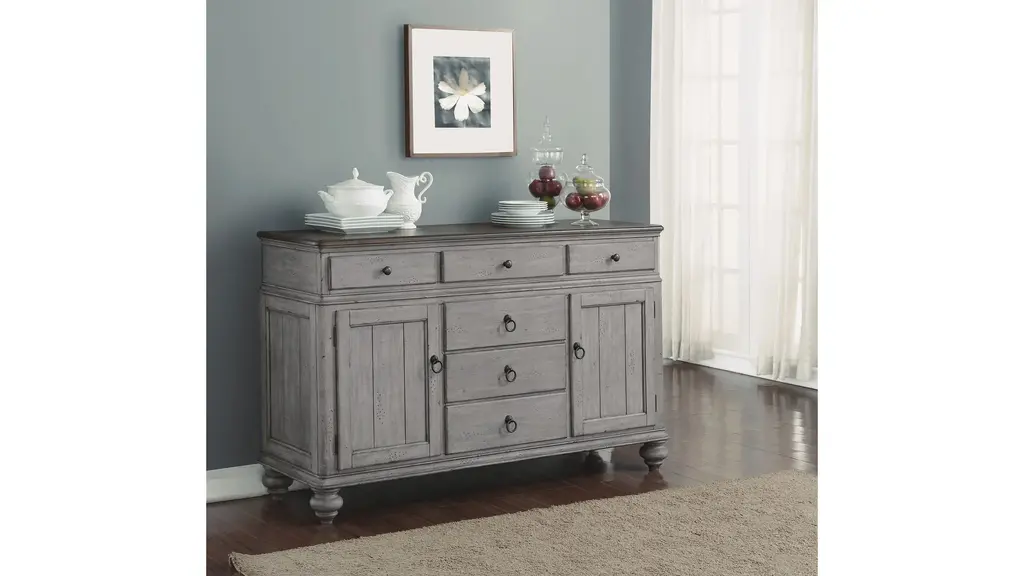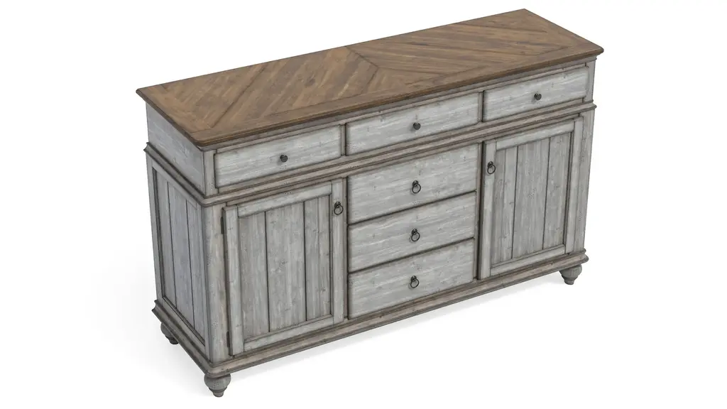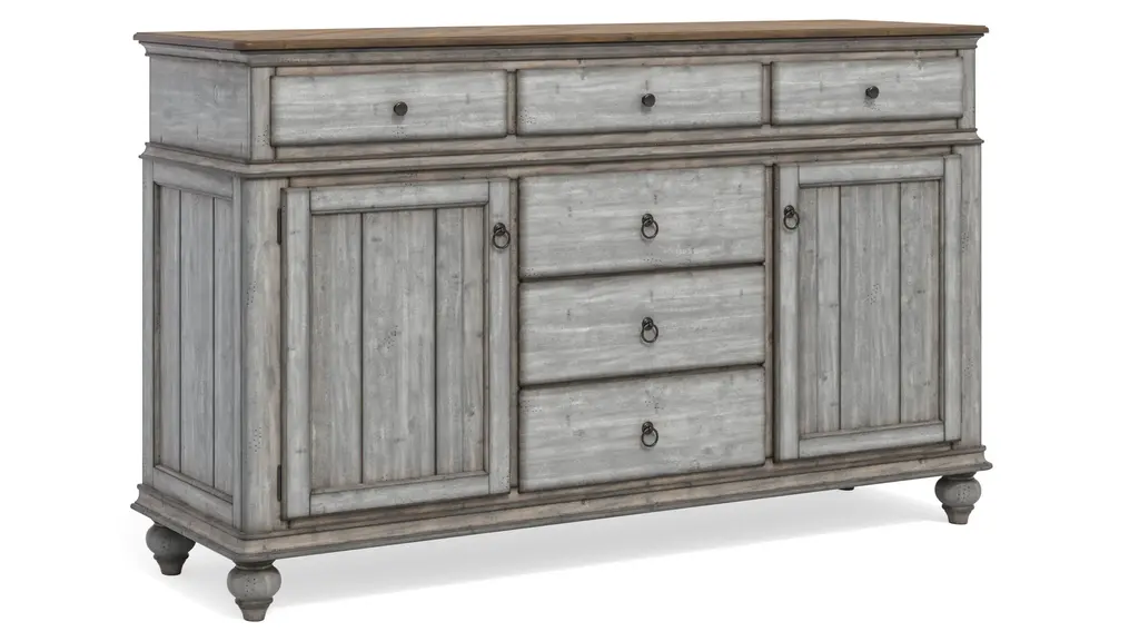 Entertain in relaxed cottage style with everything you need to host dinner guests with this Plymouth Buffet. A weathered graywash finish is accented by a medium brown top and gunmetal pulls, while paneled details and turned bun feet add to the cozy vintage character. This buffet features two cabinet spaces with adjustable shelves and a removable wine rack that can store up to 16 bottles. Pair that with six spacious drawerscomplete with felt-lined top drawers and a removable silverware trayand you have ample storage for serving pieces and other dining essentials. Each drawer features ball-bearing glides for smooth access and support for heavy dining ware.
