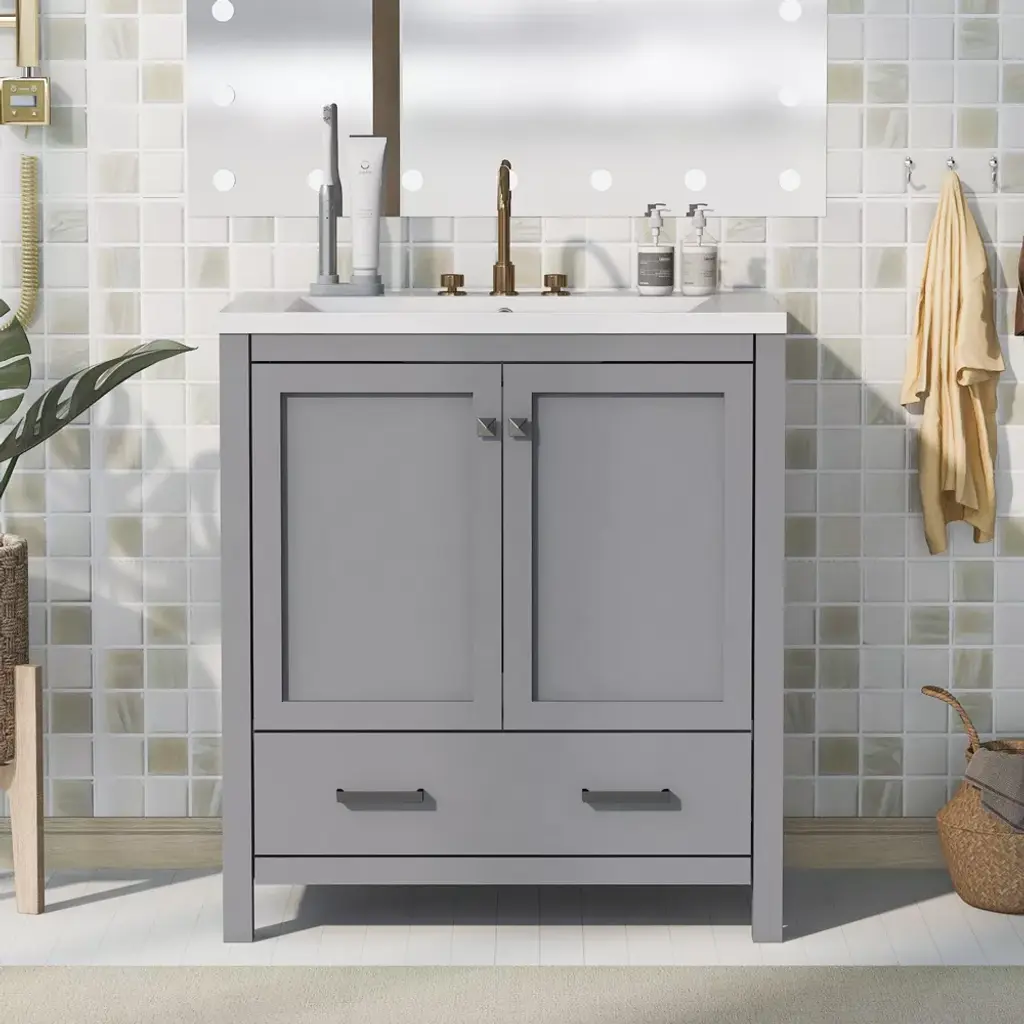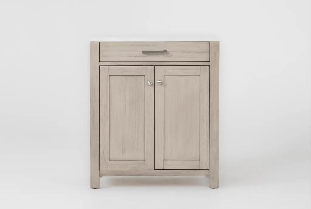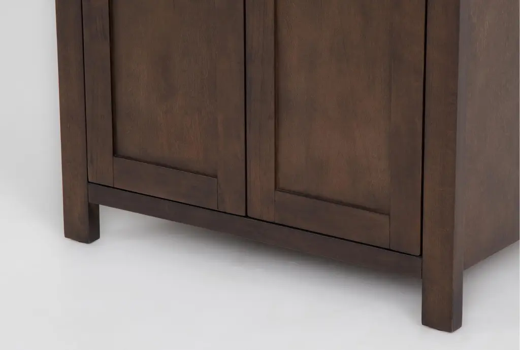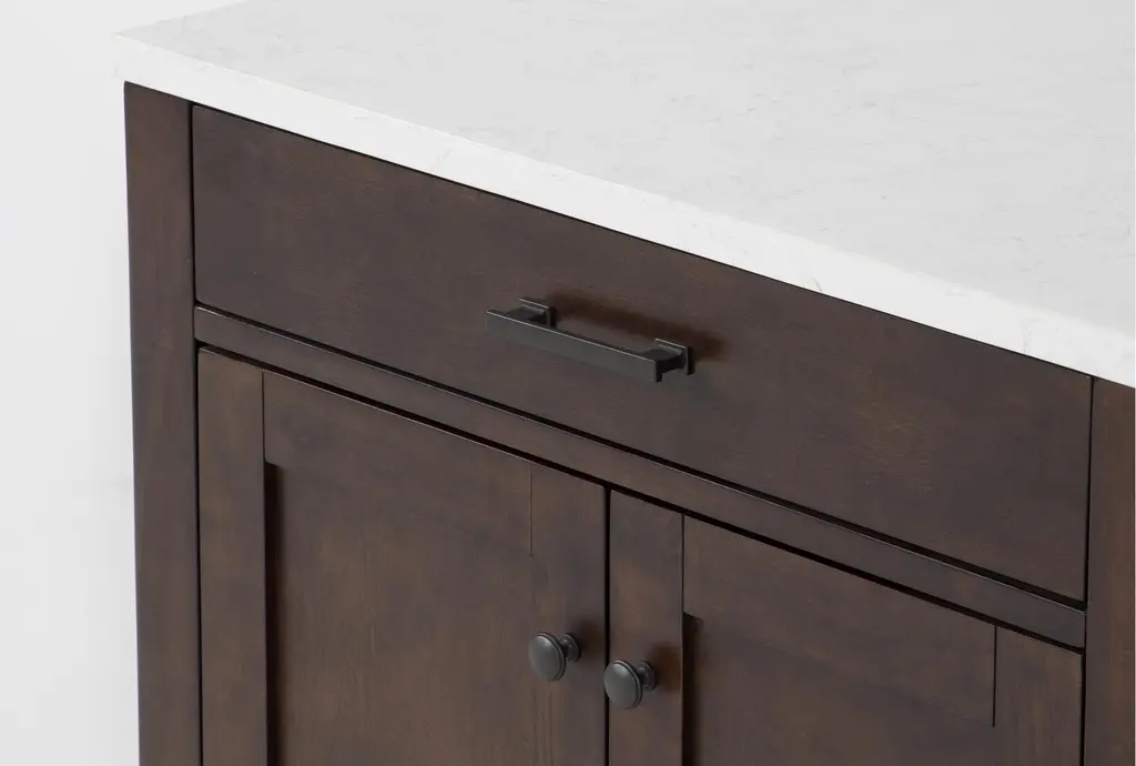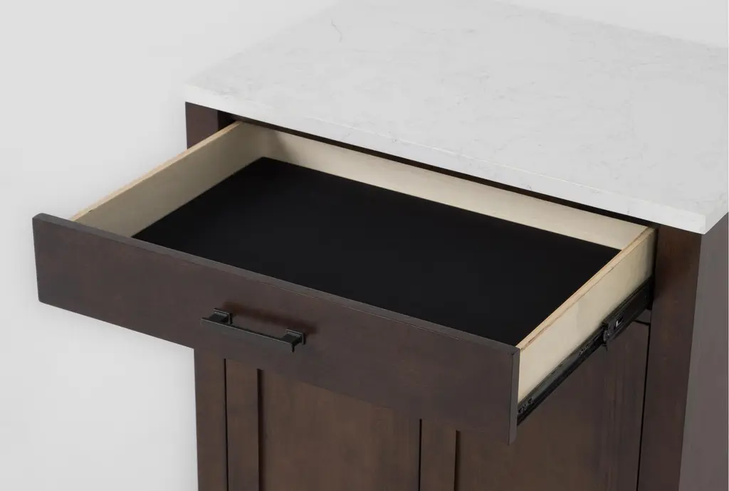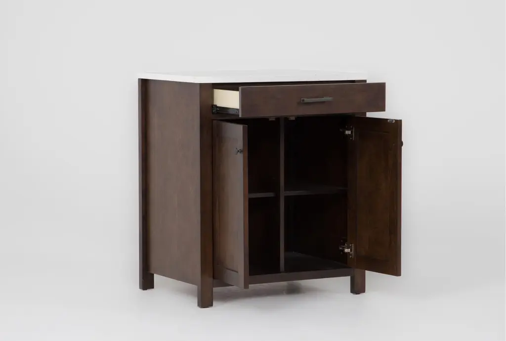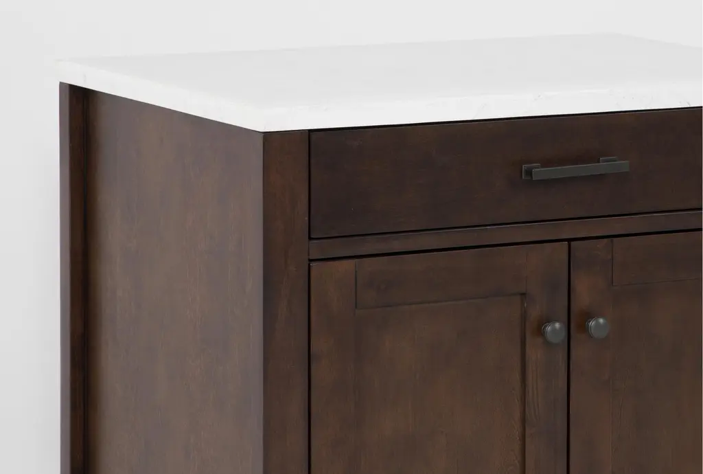Pollie Brown Wood 2 Door 1 Drawer Cabinet With White Faux Marble pairs a clean modern profile with practical storage, offering two doors and a single drawer to keep dining essentials organized and out of sight. The piece combines rubberwood elements and rubberwood veneer over engineered wood for a stable base, topped with an engineered stone surface that mimics white marble and wipes clean easily. Smooth side metal glides ensure the drawer opens reliably, and the compact footprint makes this cabinet a useful surface and storage hub for dining rooms or entryways.