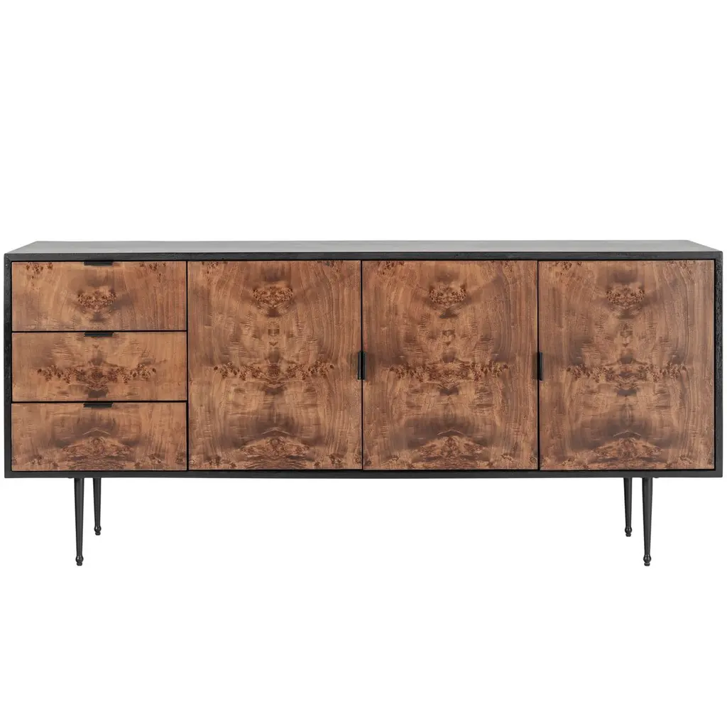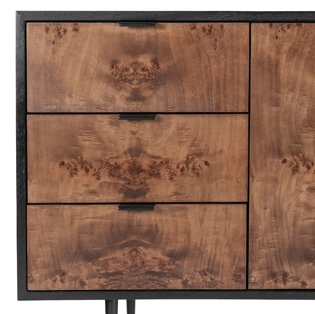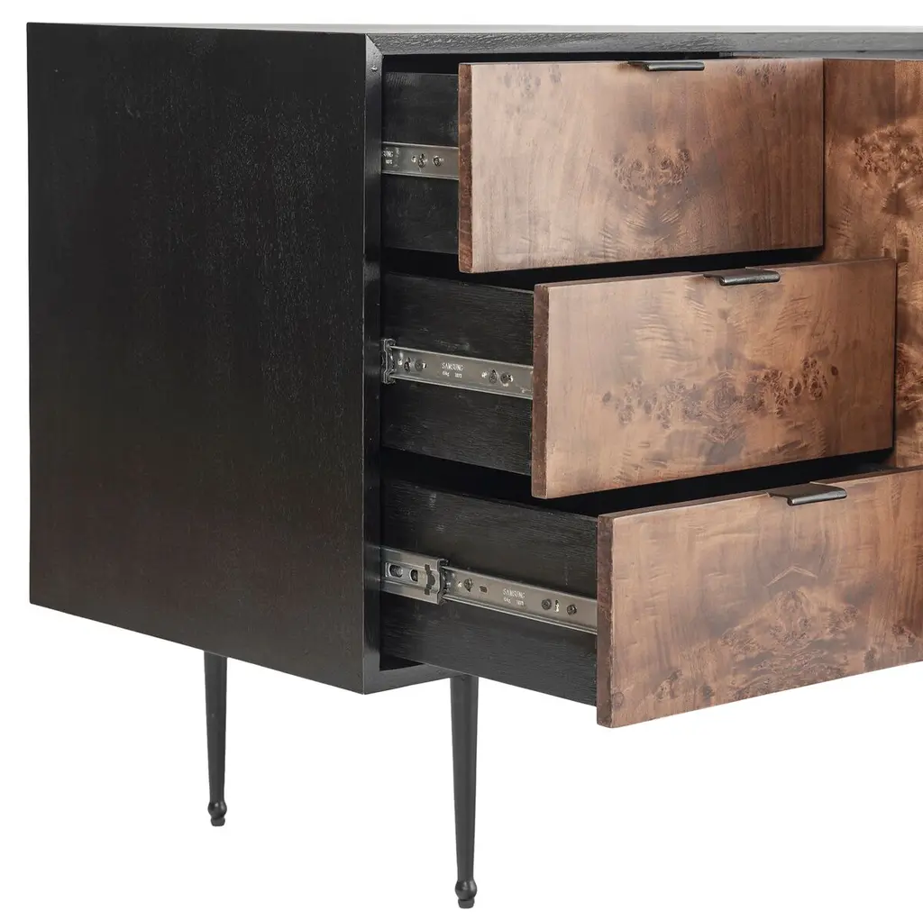 Discover the timeless charm of the Porter Burl Buffet. This modern masterpiece features a Burl veneer cabinet with the option of a light or dark burl, artfully paired with a solid wood black outer case. The inclusion of cast iron legs and drawer pulls adds an industrial touch, creating a statement piece that seamlessly blends sophistication with functionality.