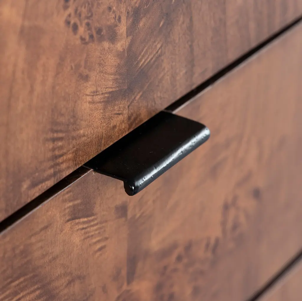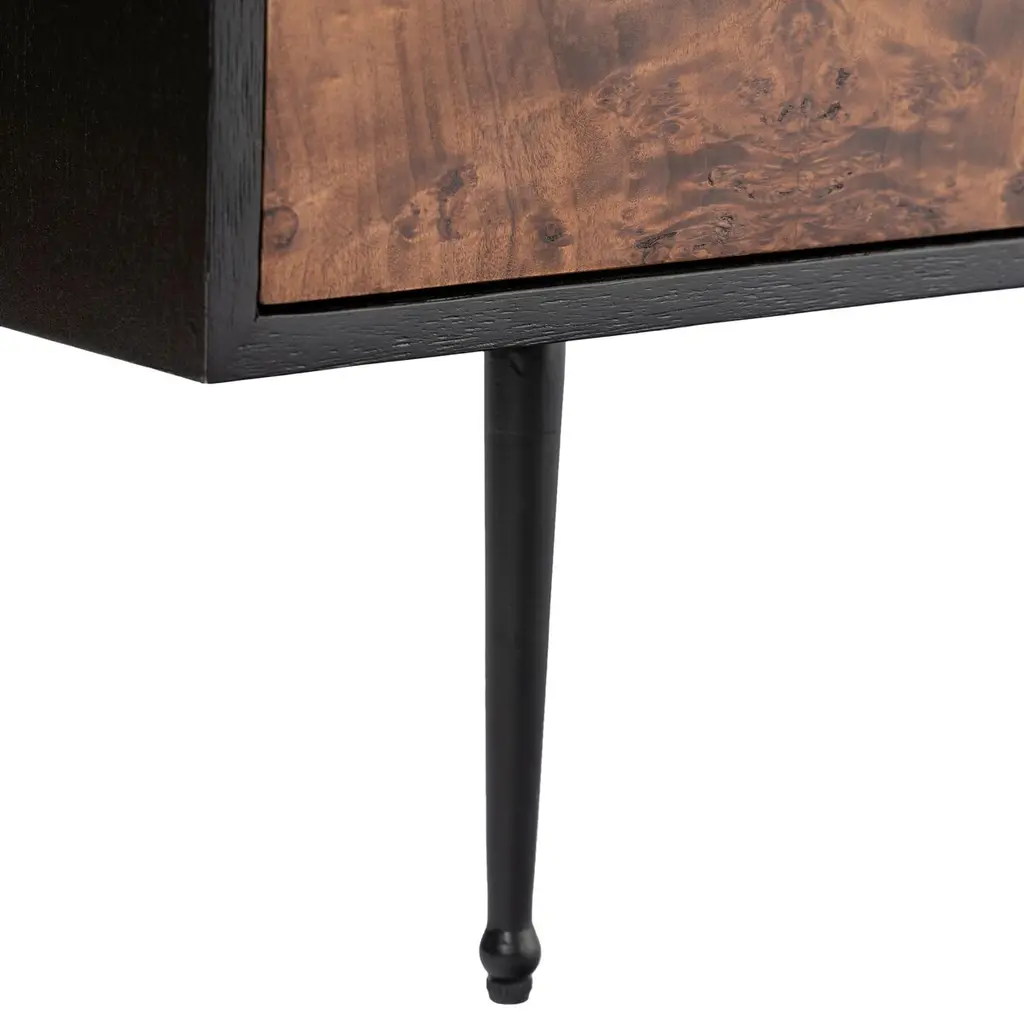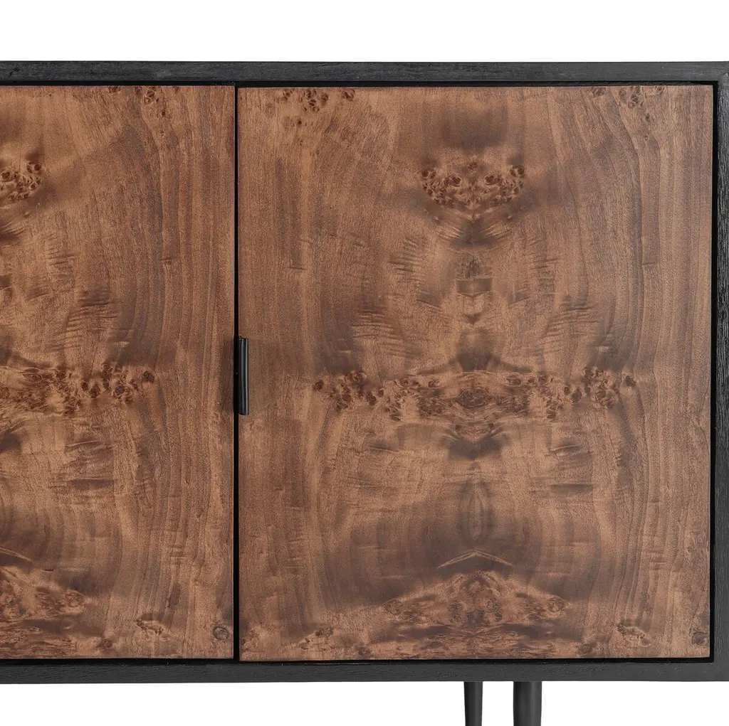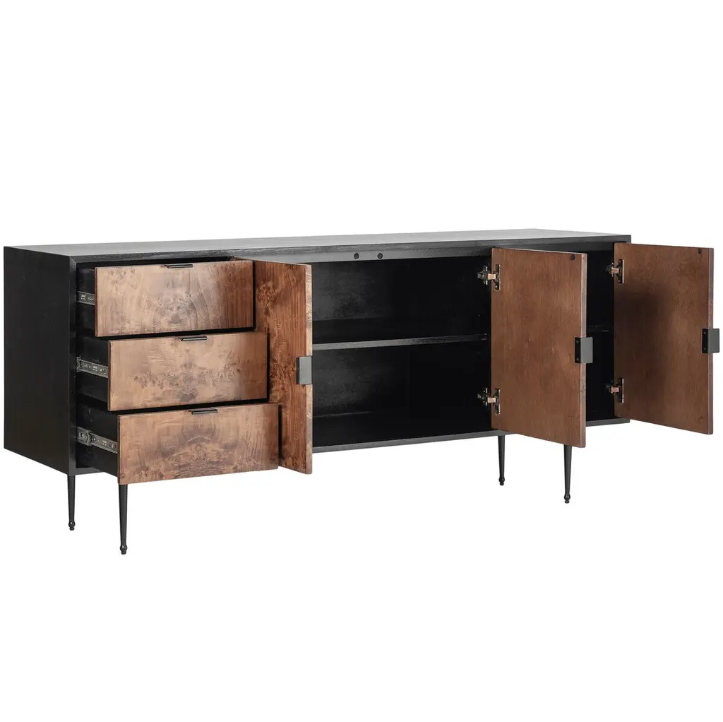 Discover the timeless charm of the Porter Burl Buffet. This modern masterpiece features a Burl veneer cabinet with the option of a light or dark burl, artfully paired with a solid wood black outer case. The inclusion of cast iron legs and drawer pulls adds an industrial touch, creating a statement piece that seamlessly blends sophistication with functionality.