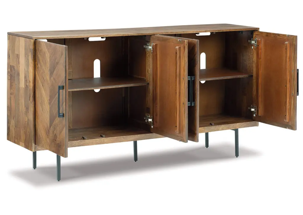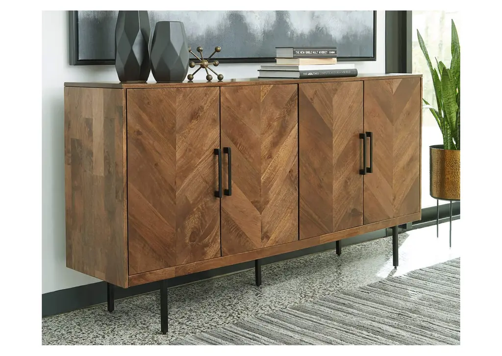 Storage options abound with the Prattville accent cabinet featuring 4 chevron pattern doors accented by long dark gray finished metal door pulls. Store dinnerware, cookbooks and many other options within the sideboard which features 2 fixed shelves. The light brown finish will complement virtually any room decor. Weight 136.000 lbs. (61.2kgs.)