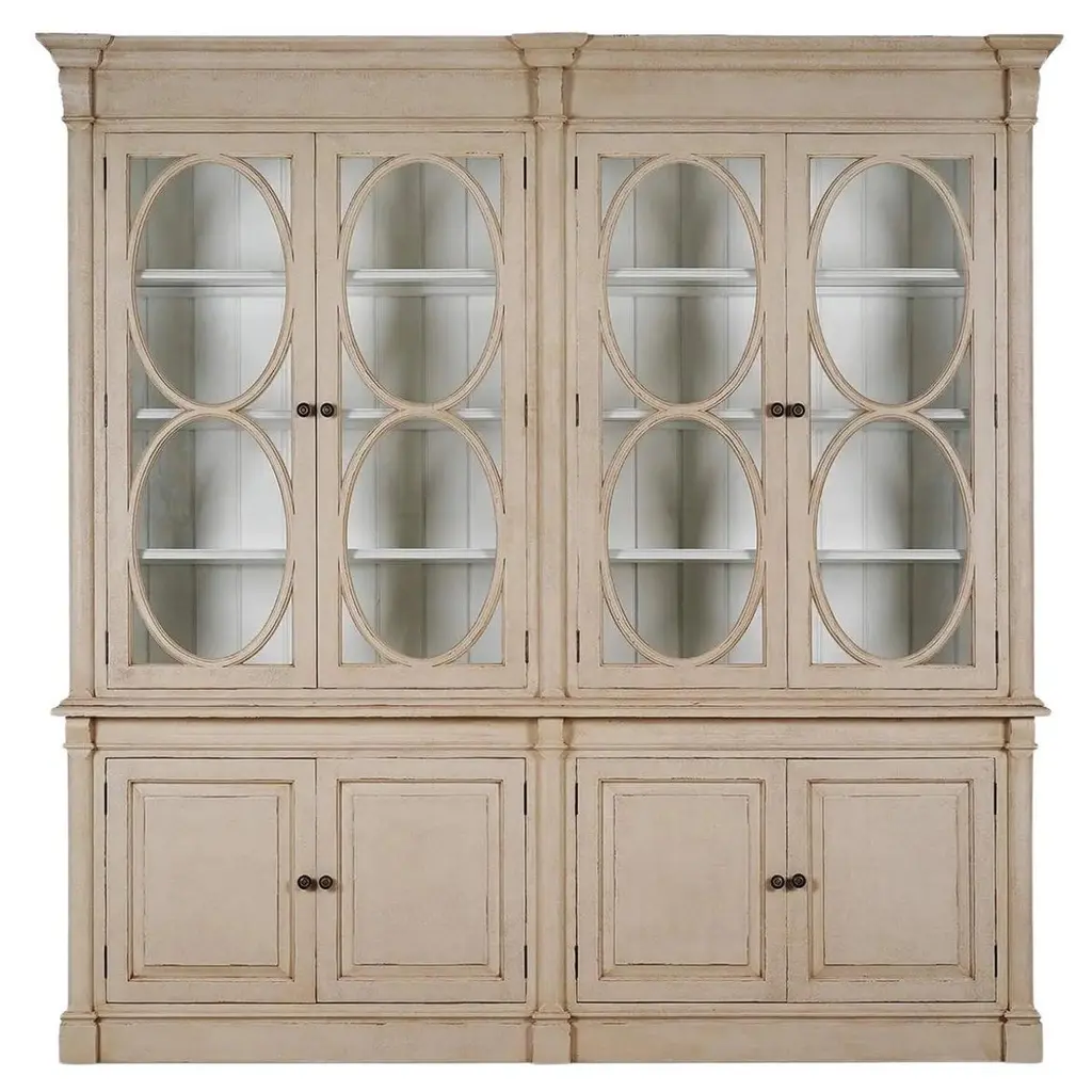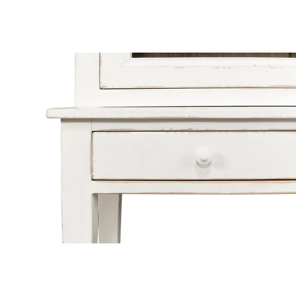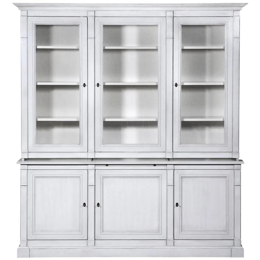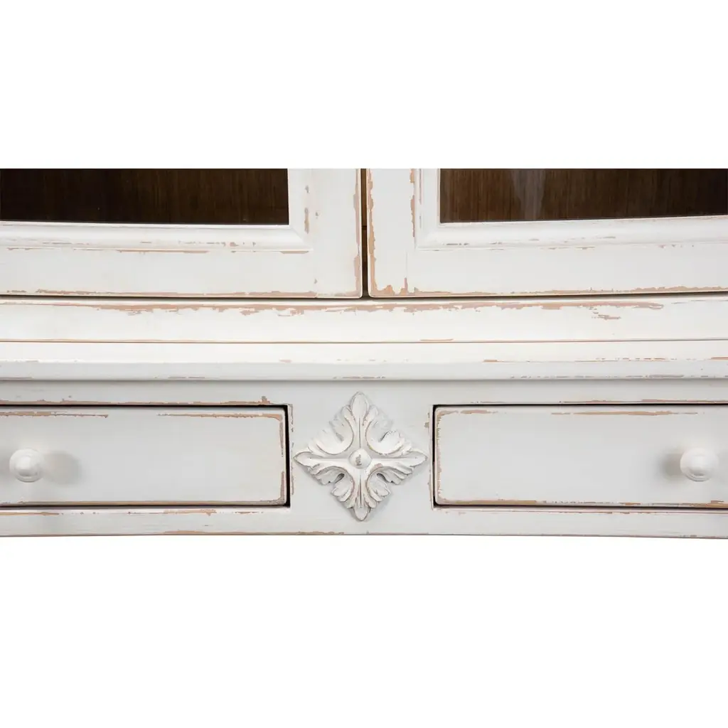 French provincial-style pine painted display cabinet. The white display case has remarkably subtle details such as slightly splayed legs that are tapered and encase the bottom shelf. Crown molding, with glass front doors that expose a contrasting interior finish. Dimensions: 88" W x 17" D x 85" H