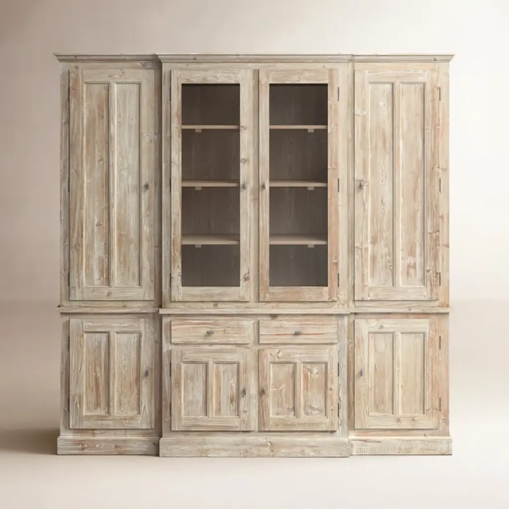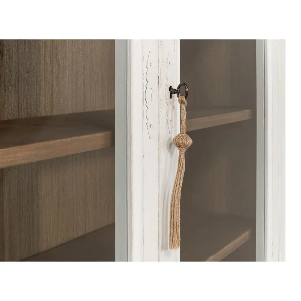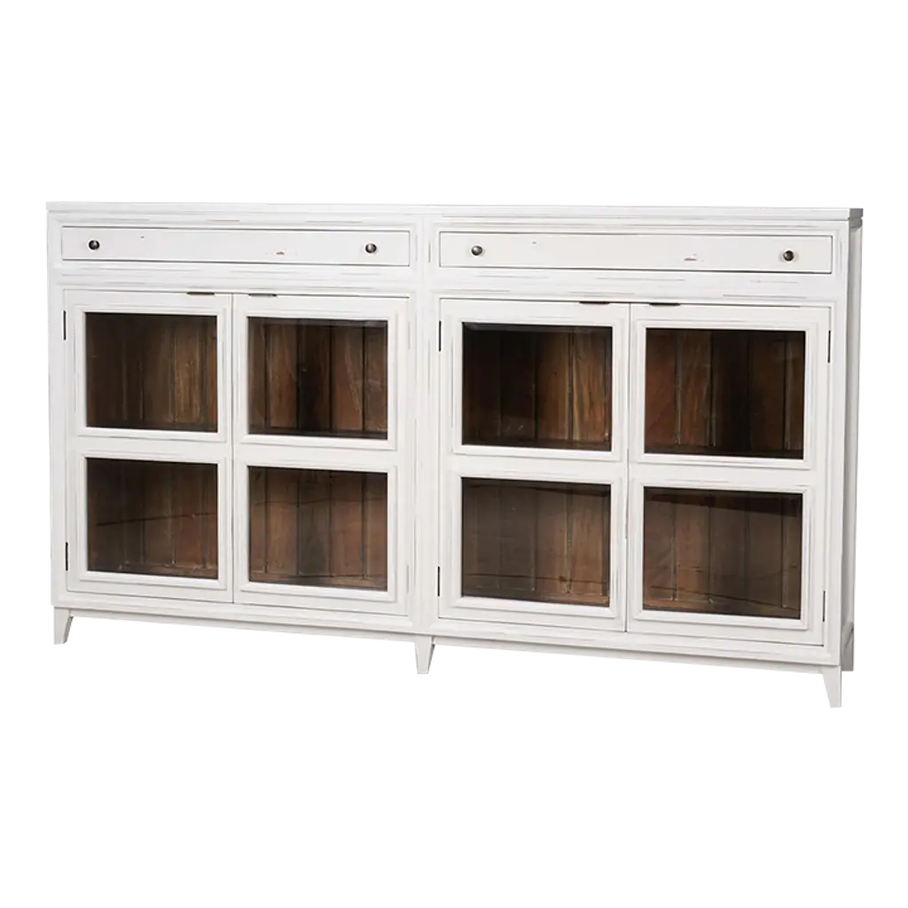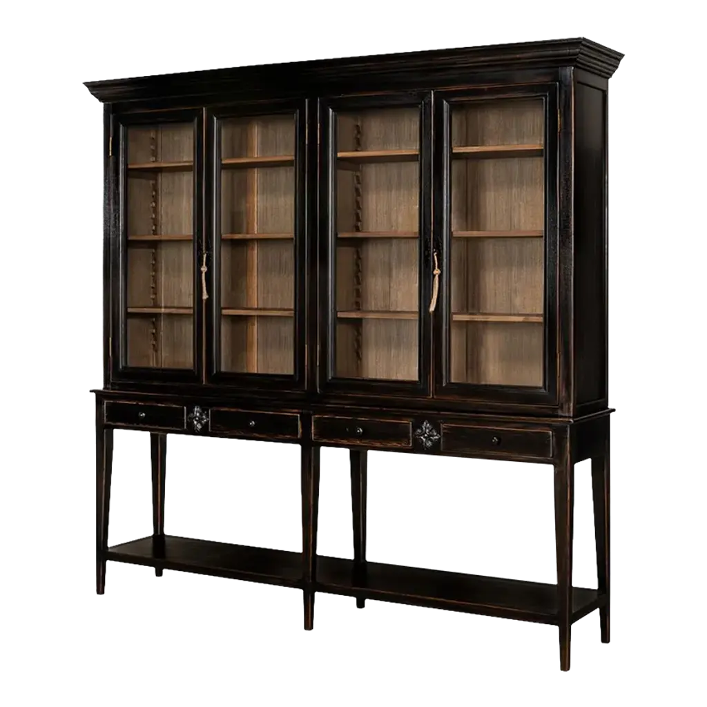French provincial-style pine painted display cabinet. The white display case has remarkably subtle details such as slightly splayed legs that are tapered and encase the bottom shelf. Crown molding, with glass front doors that expose a contrasting interior finish. Dimensions: 88" W x 17" D x 85" H