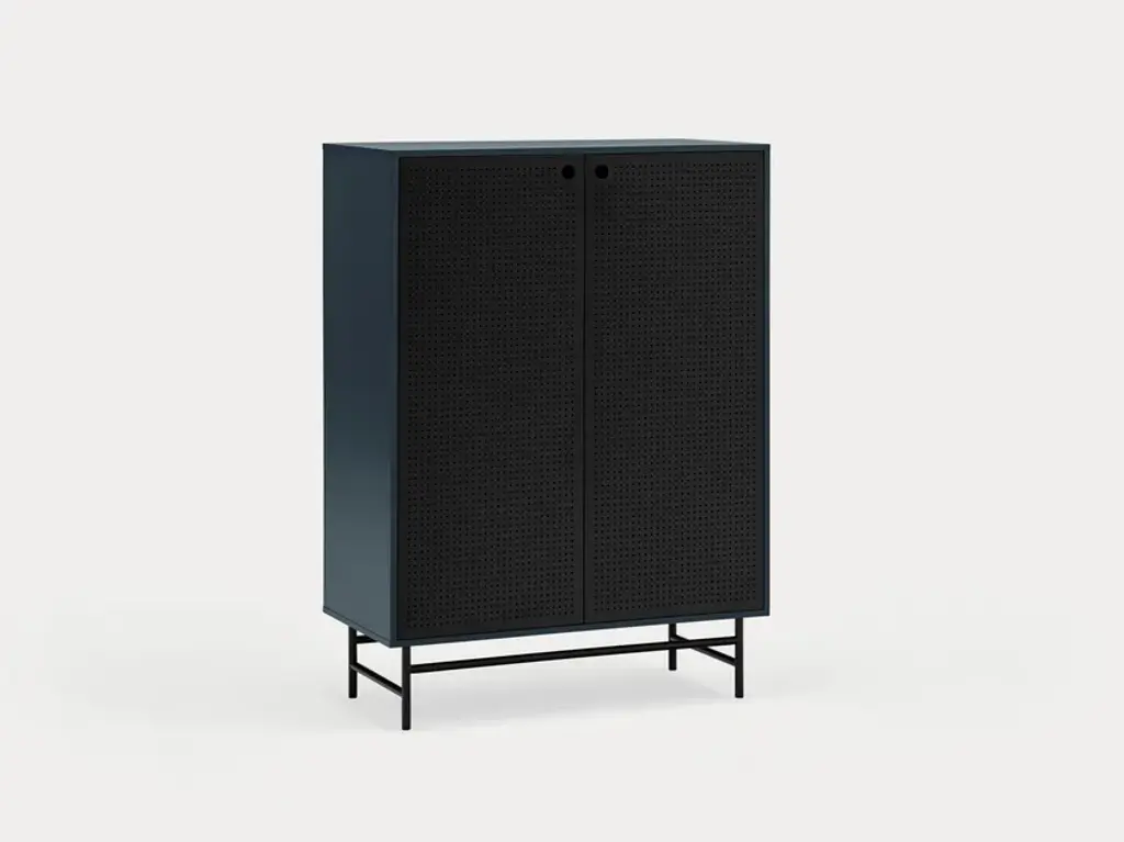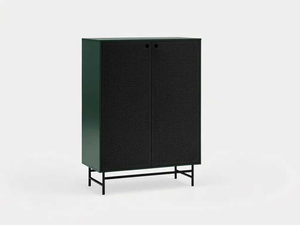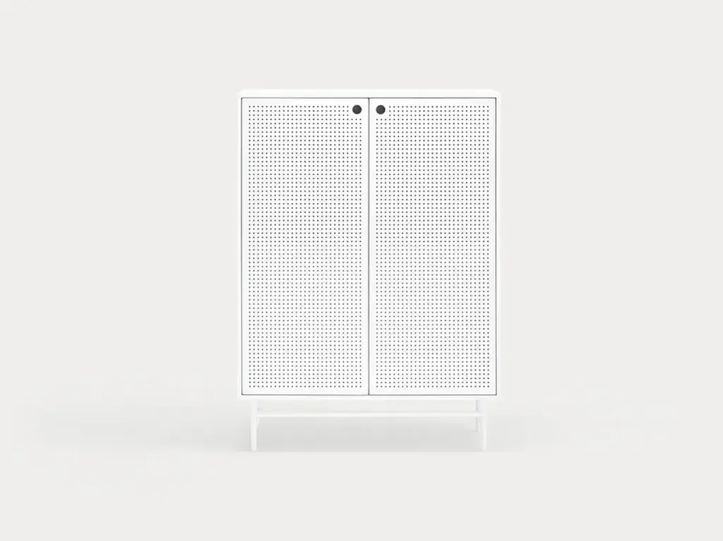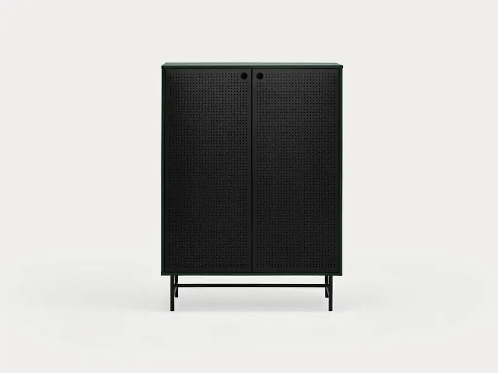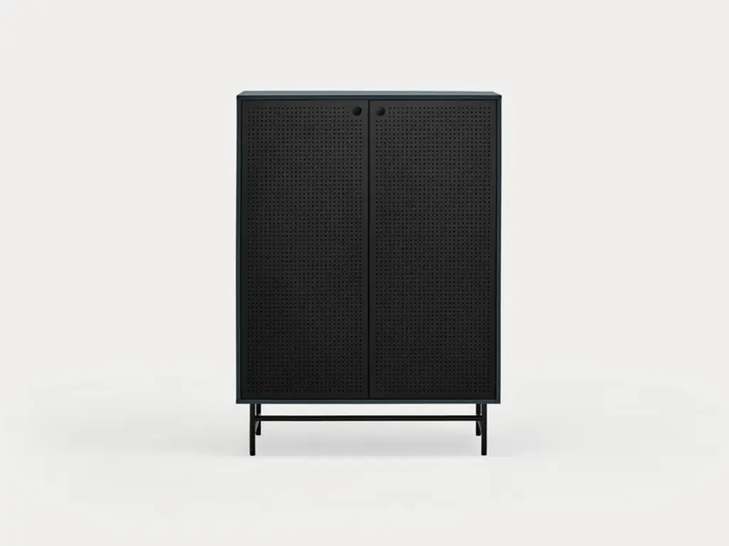 Punto is a matt laquered MDF highboard. Available in various colours.Punto collection claims its industrial spirit by combining design and functionality. The perforated metallic doors add to its singular character and personality. Each one of them has an integrated circular handle, distinctive particularity of the collection. The structure of every piece of furniture comes in matt lacquered MDF in various colours.