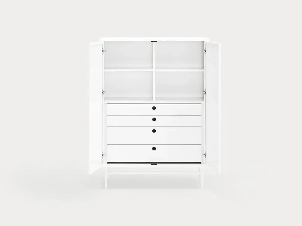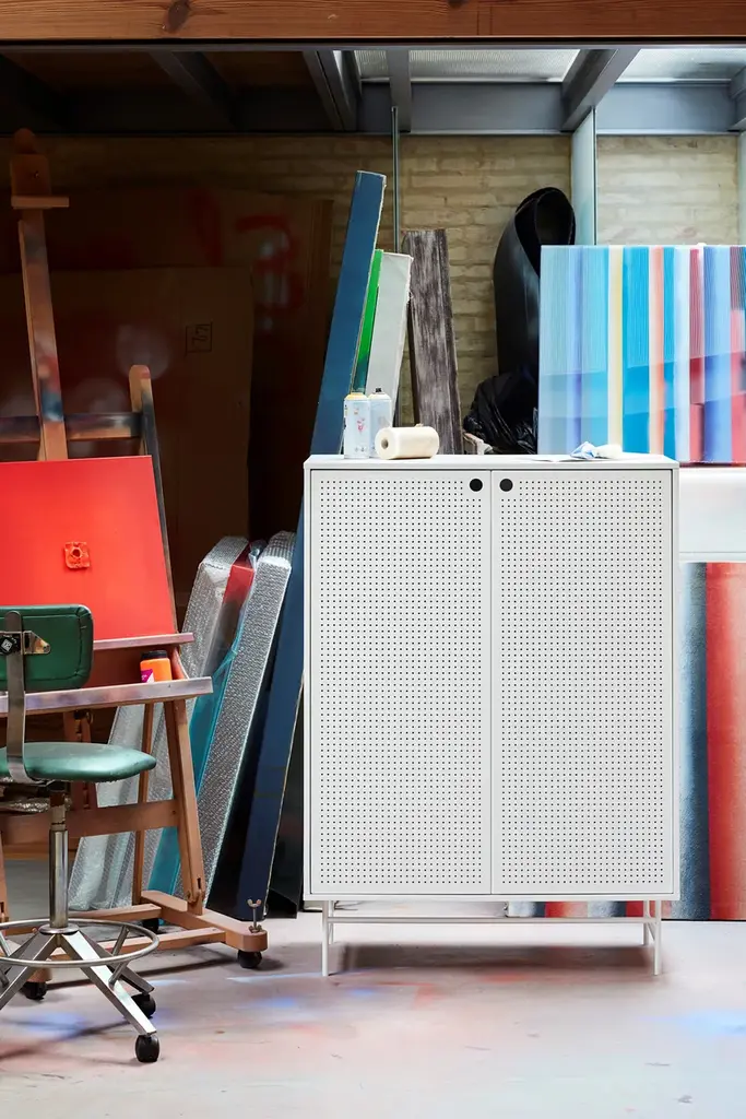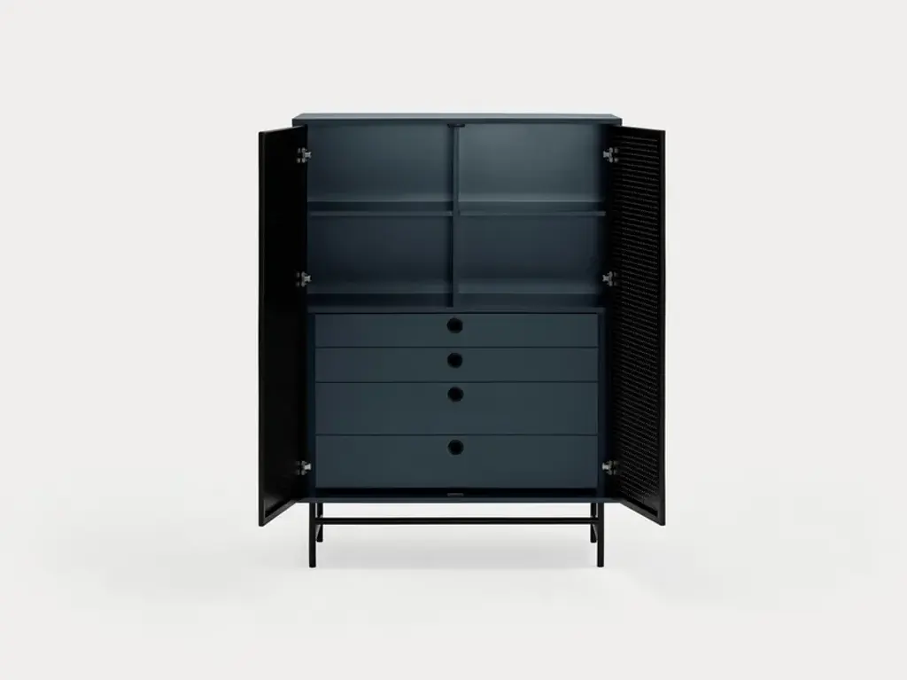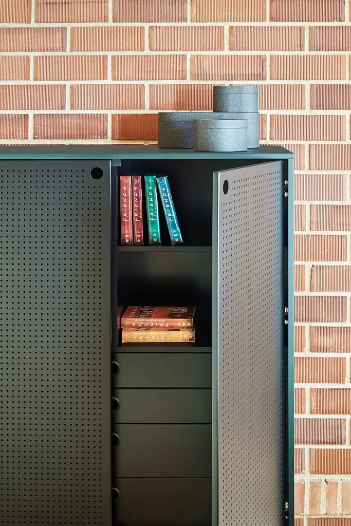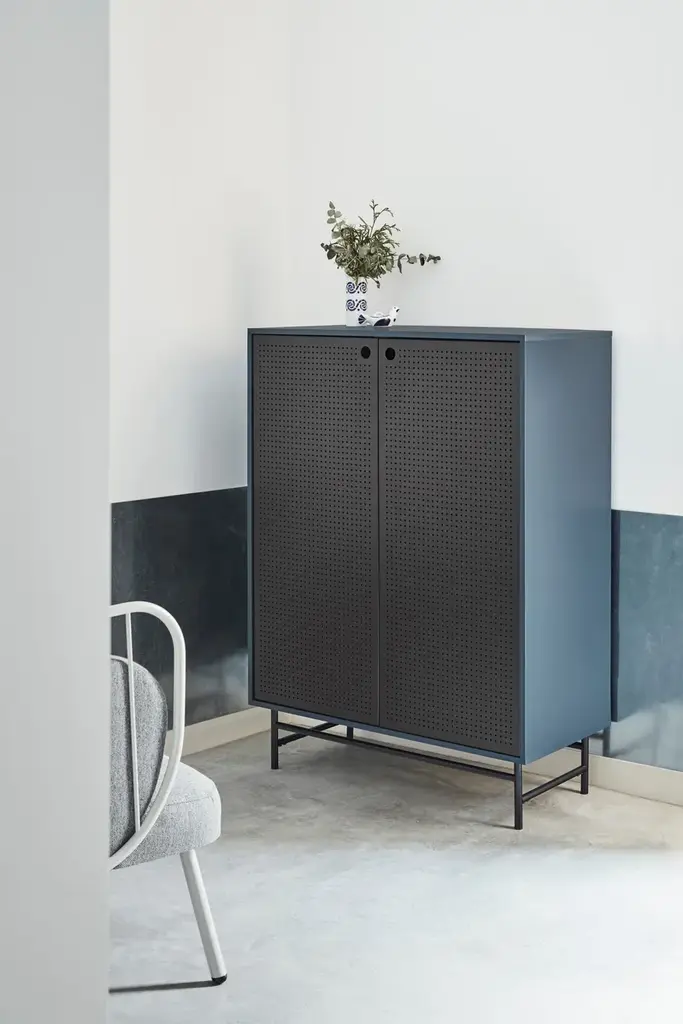 Punto is a matt laquered MDF highboard. Available in various colours.Punto collection claims its industrial spirit by combining design and functionality. The perforated metallic doors add to its singular character and personality. Each one of them has an integrated circular handle, distinctive particularity of the collection. The structure of every piece of furniture comes in matt lacquered MDF in various colours.