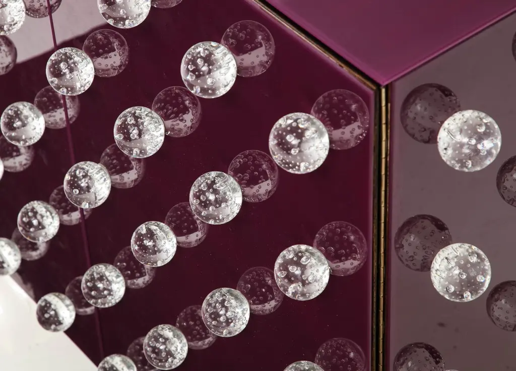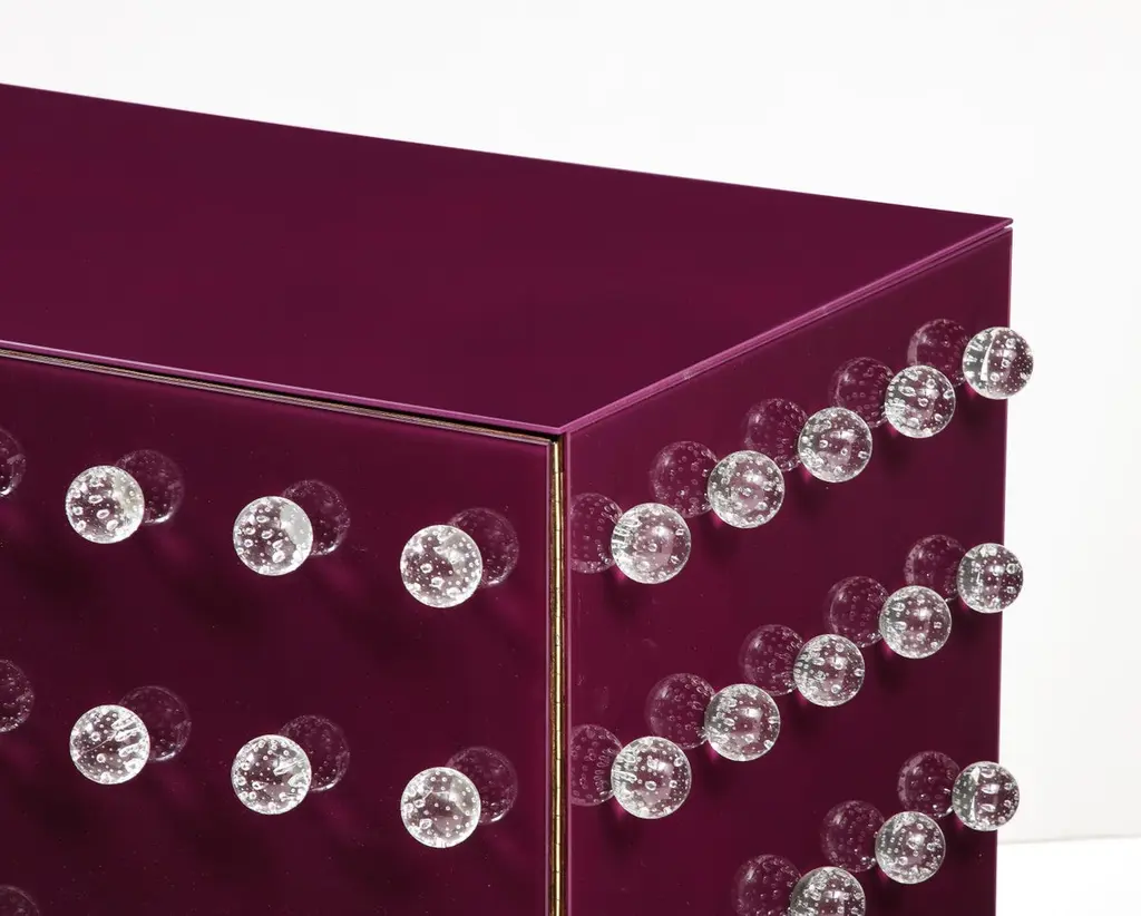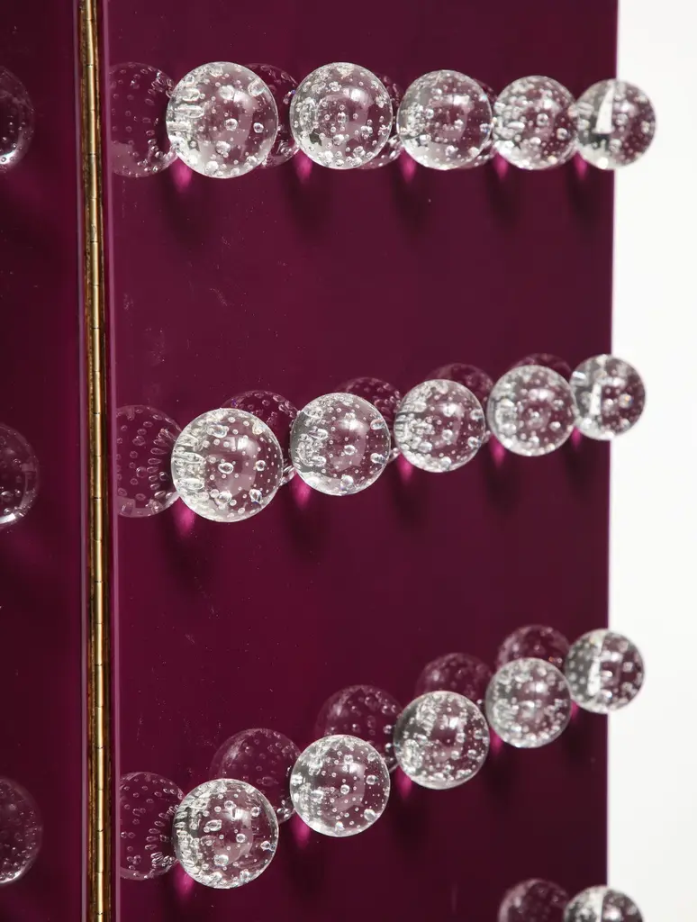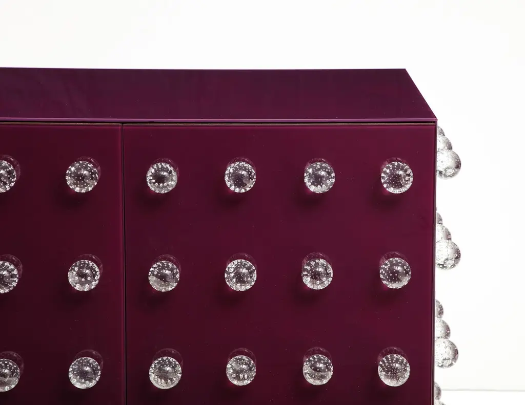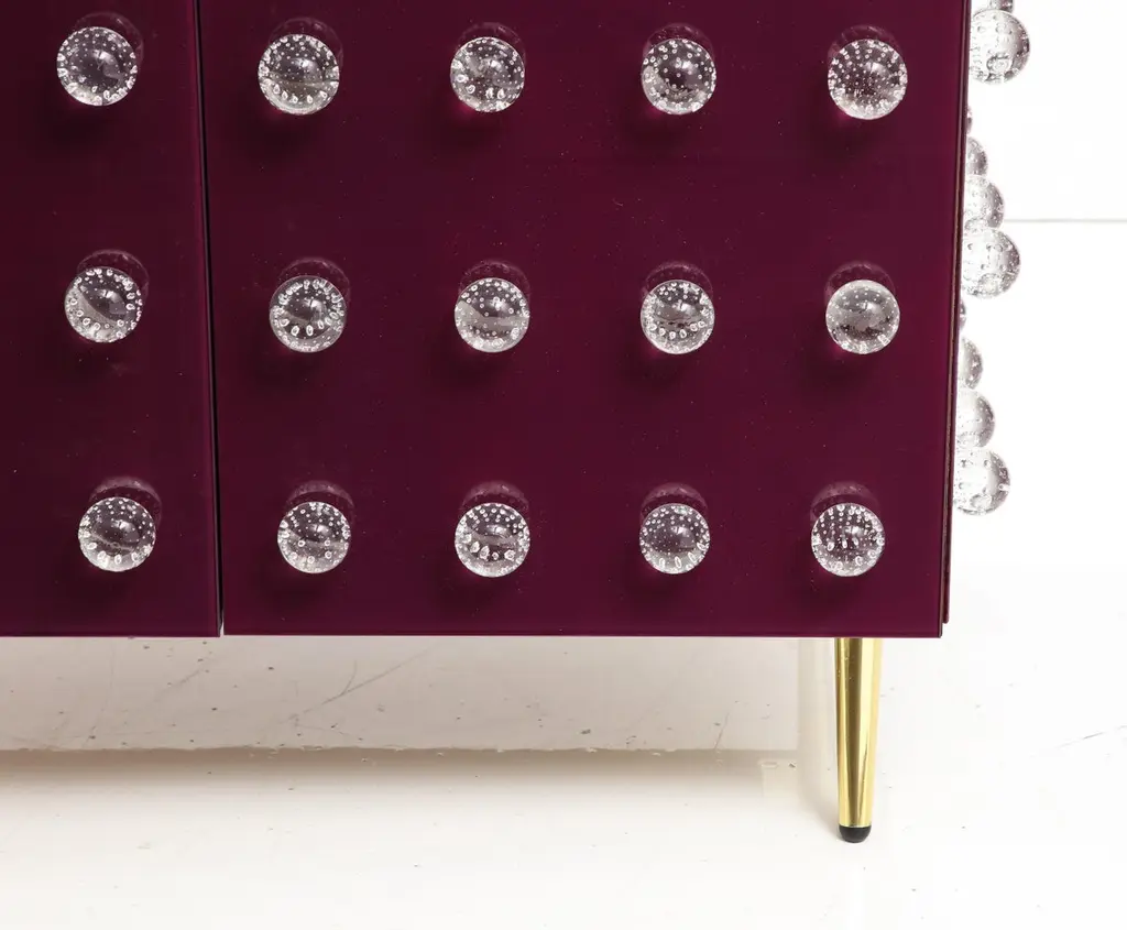 Murano glass kitchen cabinet, jewelry-inspired design. Handcrafted birch wood frame with fine Murano glass and brass feet. Ninety vibrant Murano glass spheres and ground purple glass inlays are meticulously embedded into the exterior, a stunning display of Venetian artistry. This one-of-a-kind kitchen furniture piece elegantly combines functionality with decorative flair inspired by traditional Italian Murano glassmaking techniques.Murano glass jewelry design elements elevate this cabinet beyond ordinary kitchen storage. Ideal for displaying treasured glassware or adding a touch of Italian craftsmanship to your culinary space. Blending old-world Venetian glass artistry with modern cabinet utility, this piece exudes sophistication. The intricate brass trim complements the vibrant purple hues of the Murano glass spheres beautifully. Whether storing dishware or simply admiring craftsmanship, this cabinet enriches any kitchen with its distinctive Italian flair.