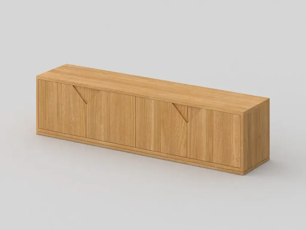 PYRA TV showcases high-quality craftsmanship and understated elegance. Characterized by a handle-free design, it exudes a modern and minimalist vibe. Unique milling work on the fronts replaces conventional handles, facilitating easy door opening. This thoughtful design accentuates the natural beauty of solid wood, giving the lowboard a timeless appeal. With its sleek lines and lack of intricate embellishments, this versatile piece seamlessly blends into diverse interior design schemes. Whether placed in a contemporary living space, a minimalist bedroom, or a traditional hallway, the lowboard effortlessly enhances the overall aesthetic of various room styles.Available in naturally treated wood types: maple, beech, core beech, ash, oak, knotty oak, cherry, walnut, knotty walnut.Technical Details:Standard treatment: robust surface oiled with pure herbal oil.Continuous slats.Handleless door opening ("push function").Permanently assembled. All parts except the back panel are solid wood.Standard depth: 45 cm.Standard height: without baseboard, wooden or metal feet.