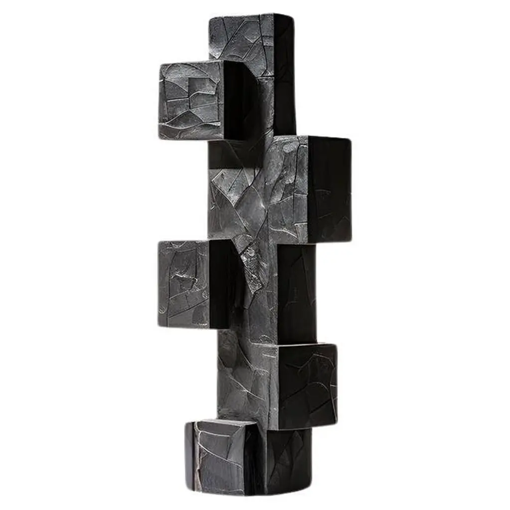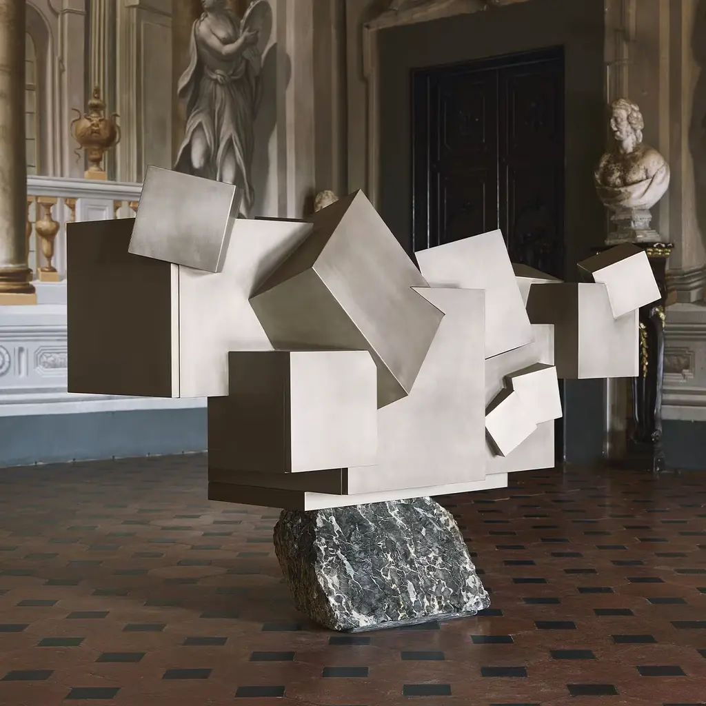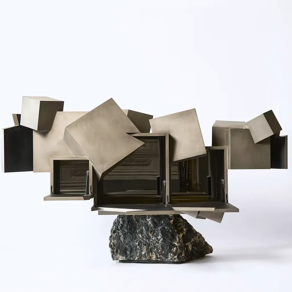 From the greek pyr, the pyrite mineral is the inspiration for this cabinet. This mineral presents itself as a cuboid crystalline structure and is represented in the piece through an assembly of cubic containers. The cabinet openings are of different sizes opened in two ways: the three front doors can be tilted whilst the two side doors are hinged. The wooden structure is coated with a metal-based paint. The base in Portoro marble can also be remove and the cabinet suspended from the wall.