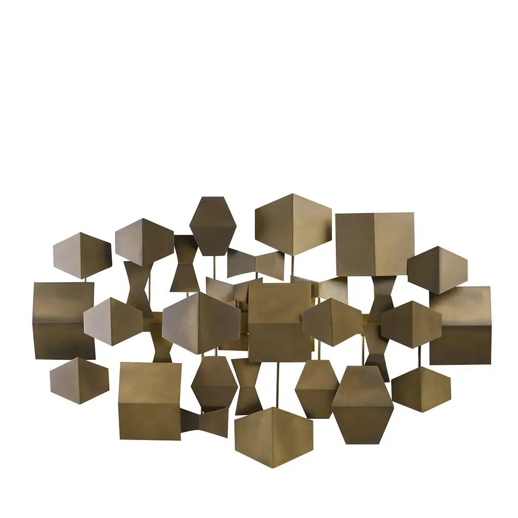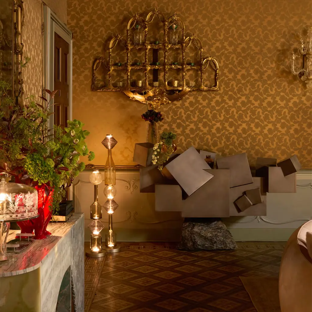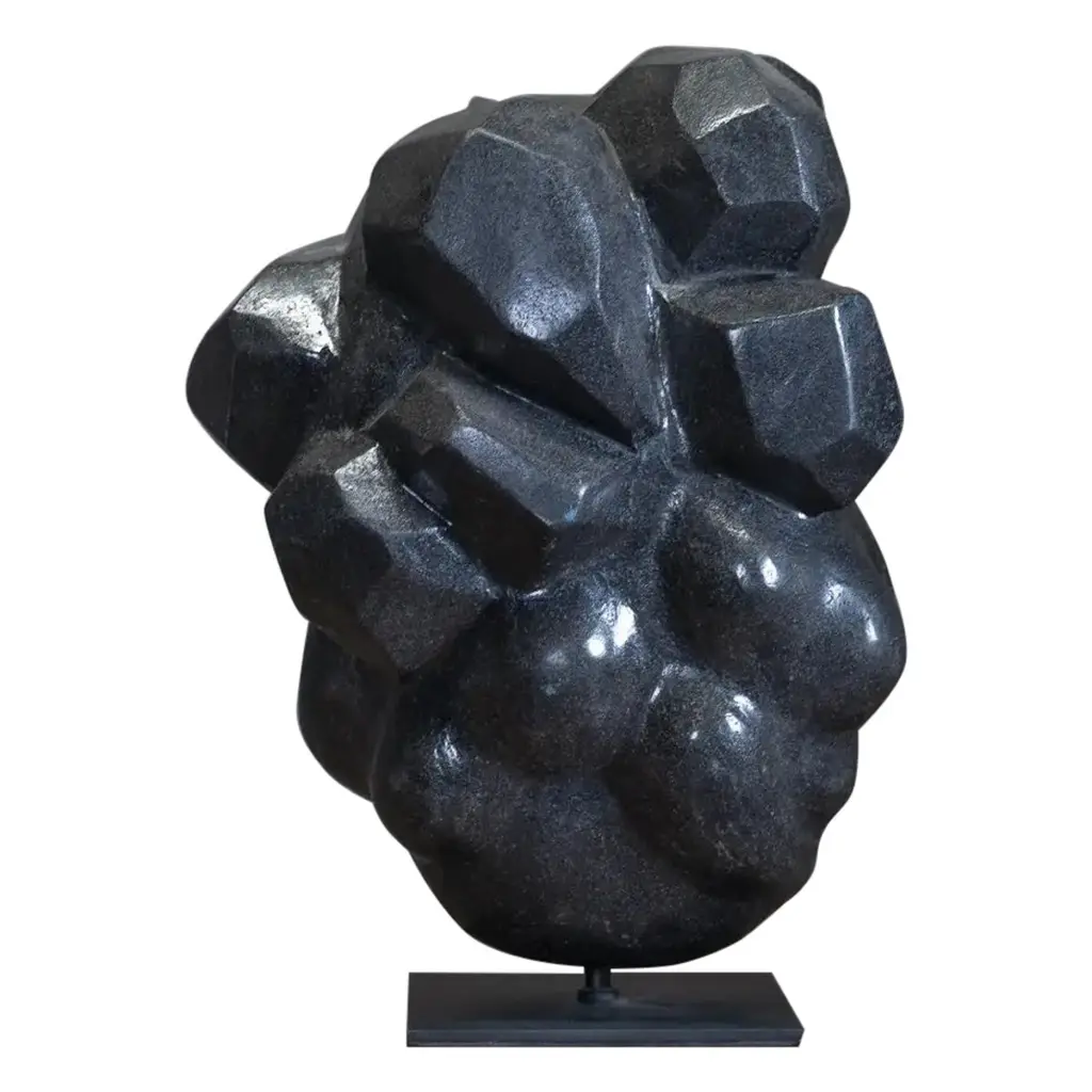 From the greek pyr, the pyrite mineral is the inspiration for this cabinet. This mineral presents itself as a cuboid crystalline structure and is represented in the piece through an assembly of cubic containers. The cabinet openings are of different sizes opened in two ways: the three front doors can be tilted whilst the two side doors are hinged. The wooden structure is coated with a metal-based paint. The base in Portoro marble can also be remove and the cabinet suspended from the wall.