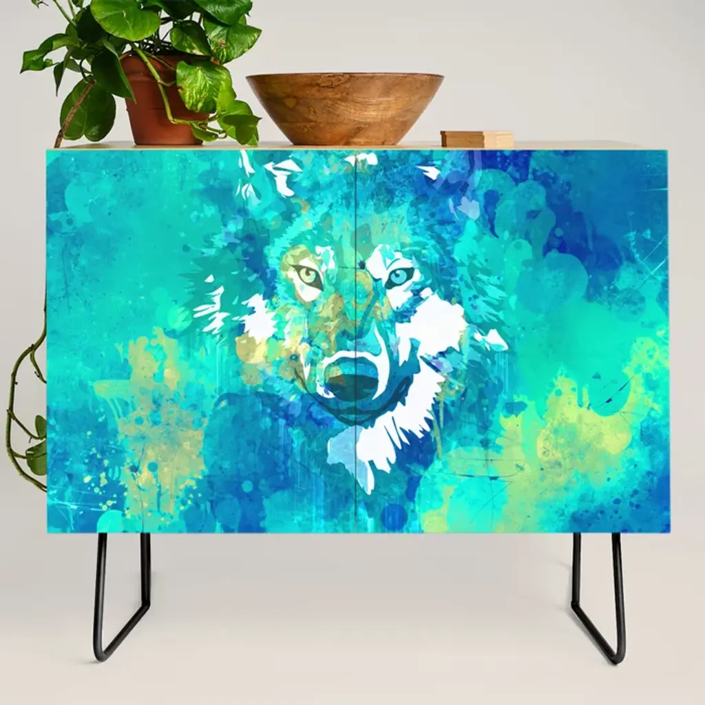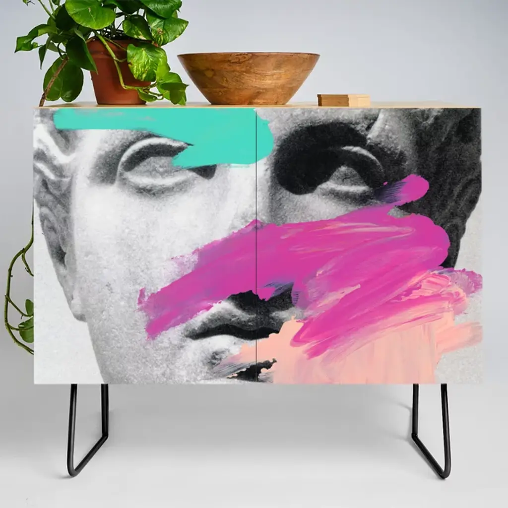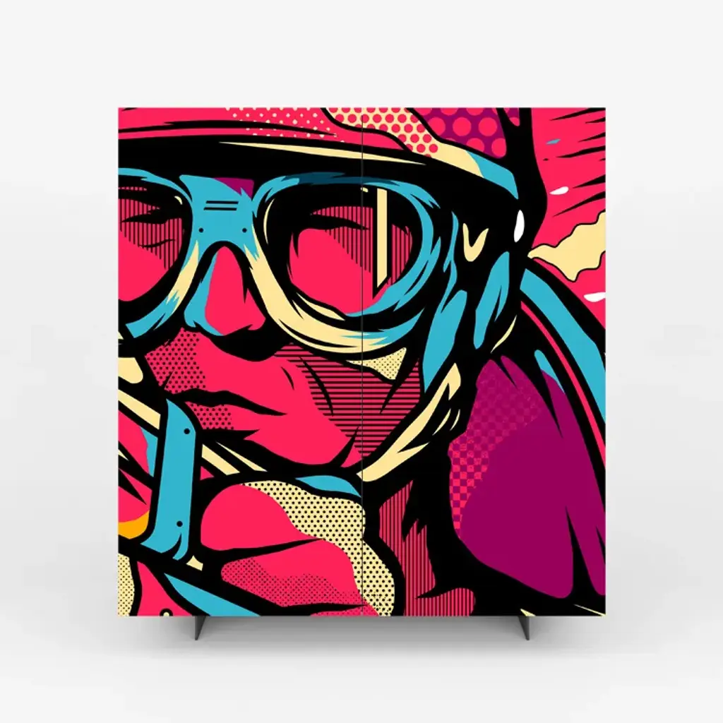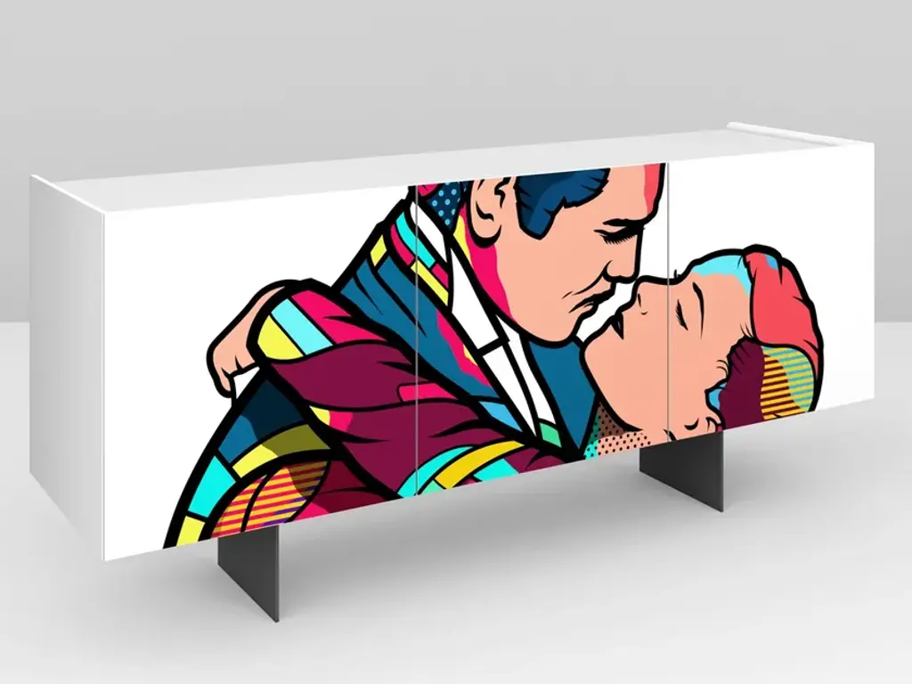 Highboards with two doors in lacquered wood inside. The exterior is made of digital printing with protective paint.The container is provided on a painted metal pedestal.