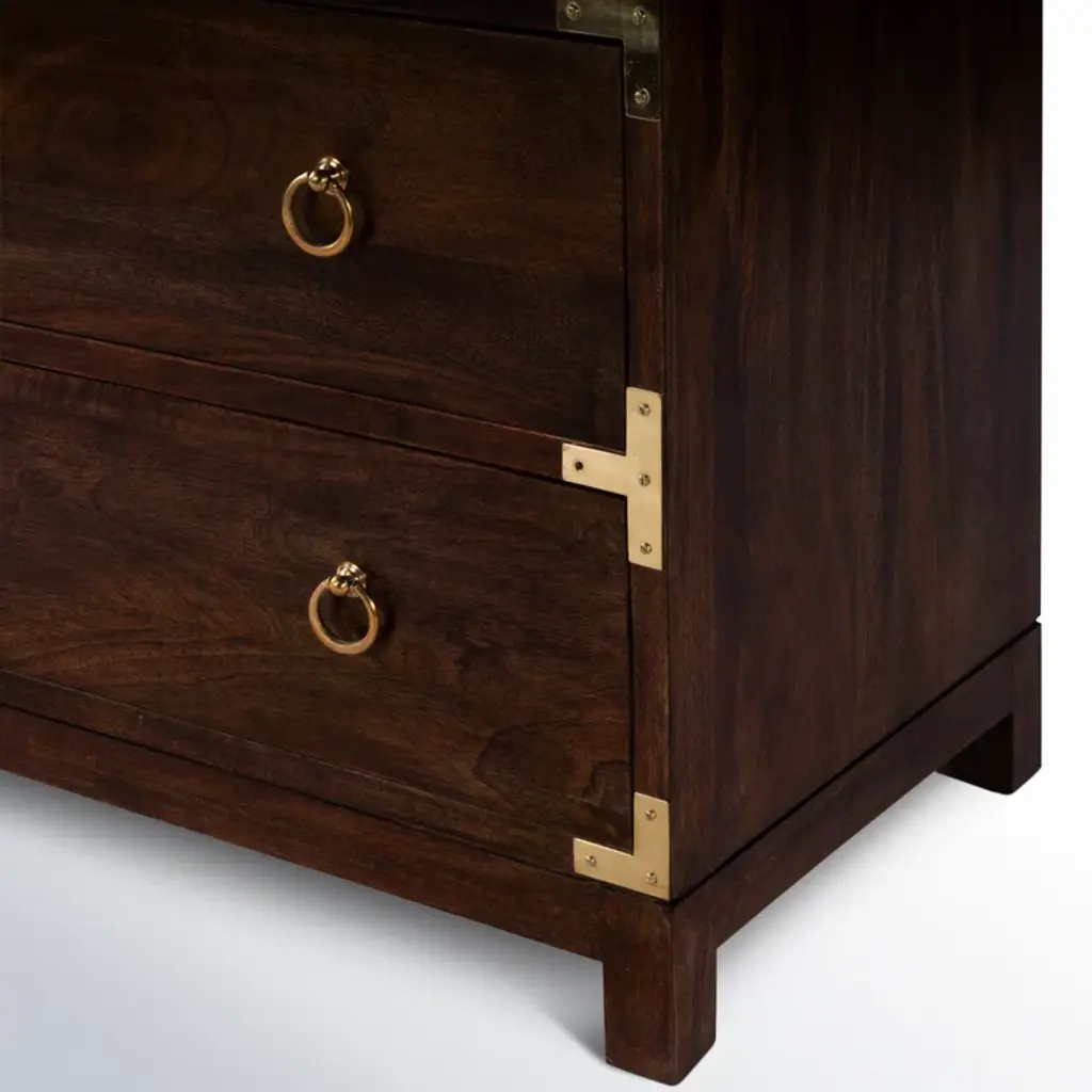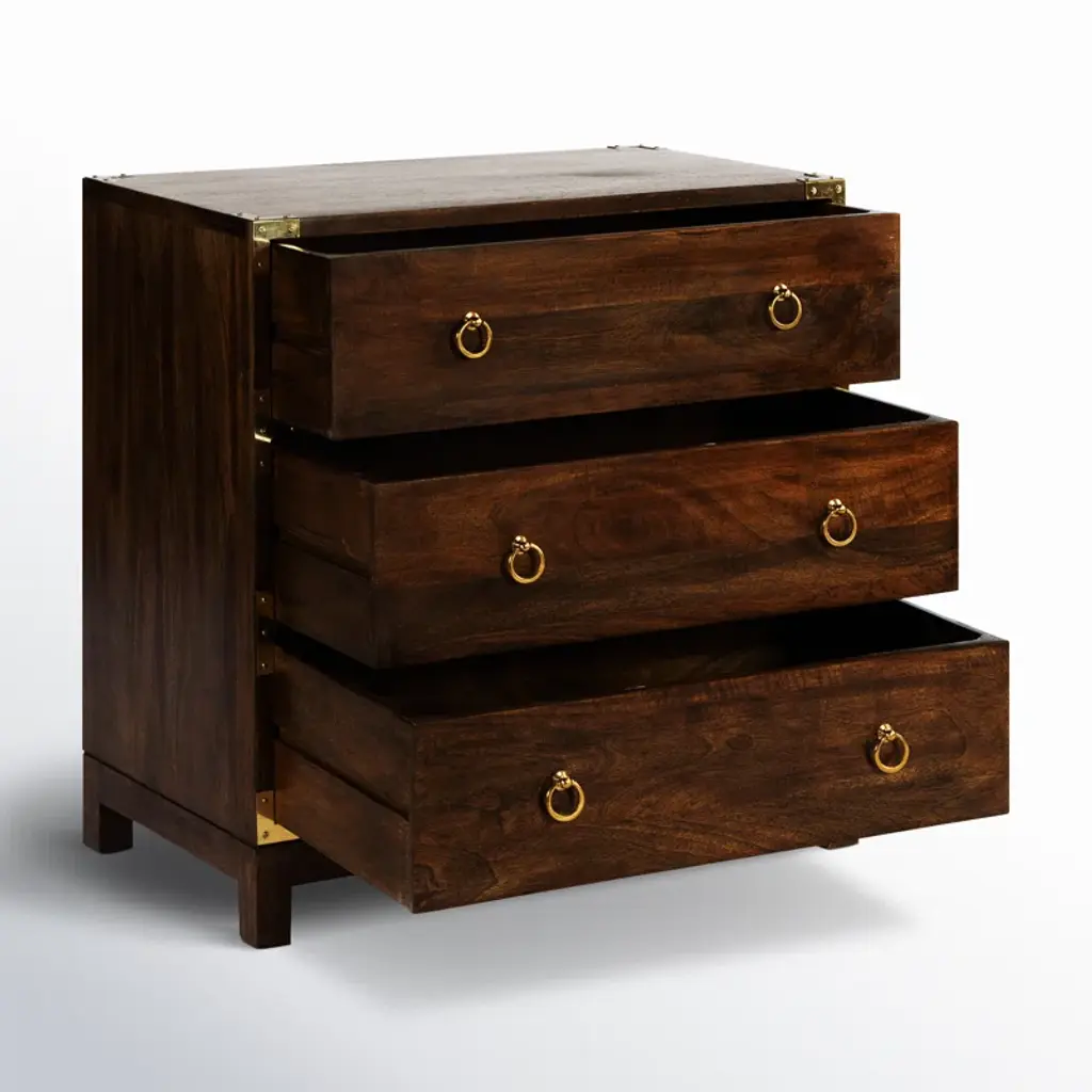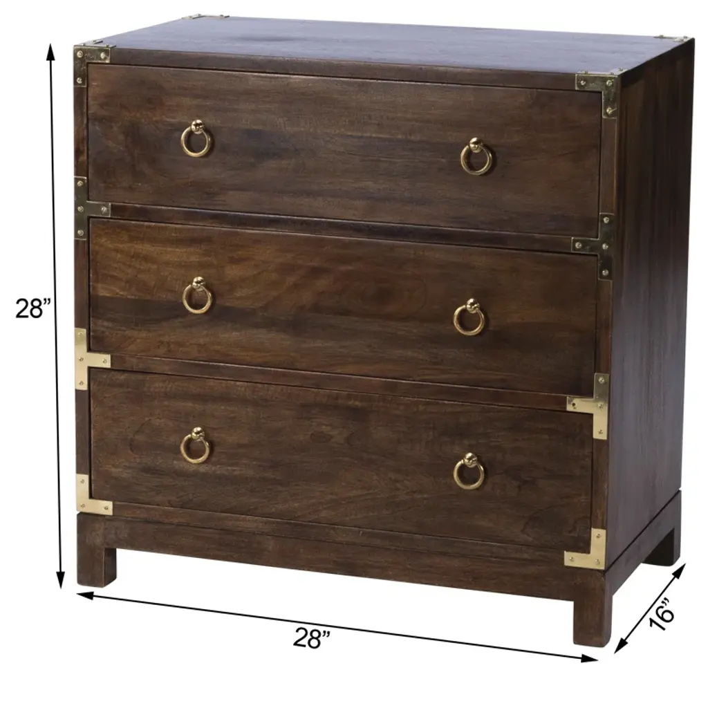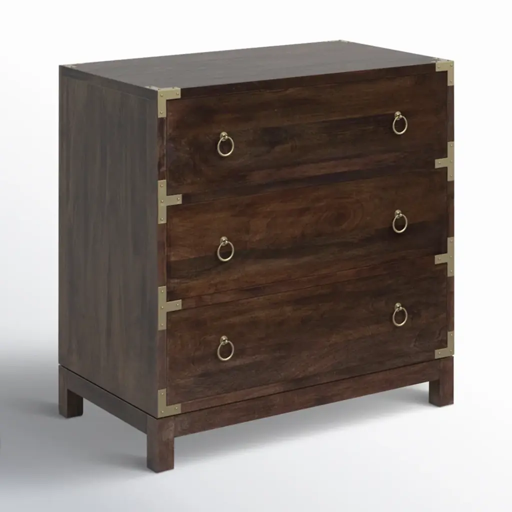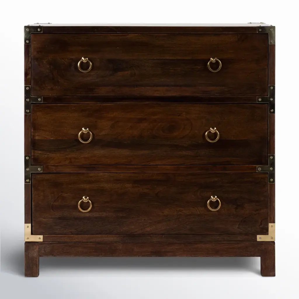 This accent cabinet ups your storage game without taking up too much floor space in your living room or bedroom. It's crafted from a blend of solid and engineered wood, and it features a clean-lined silhouette with brass-plated corners and ring pulls. Three drawers round out this piece, providing a spot to tuck away everything from spare linens and clothes to various odds and ends. Bonus: A wall anchor is included for extra safety and stability.