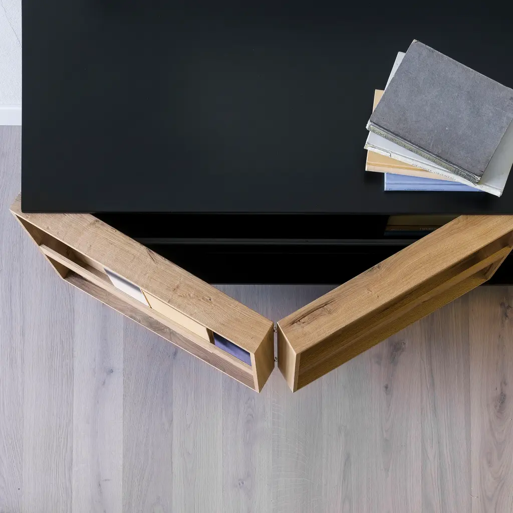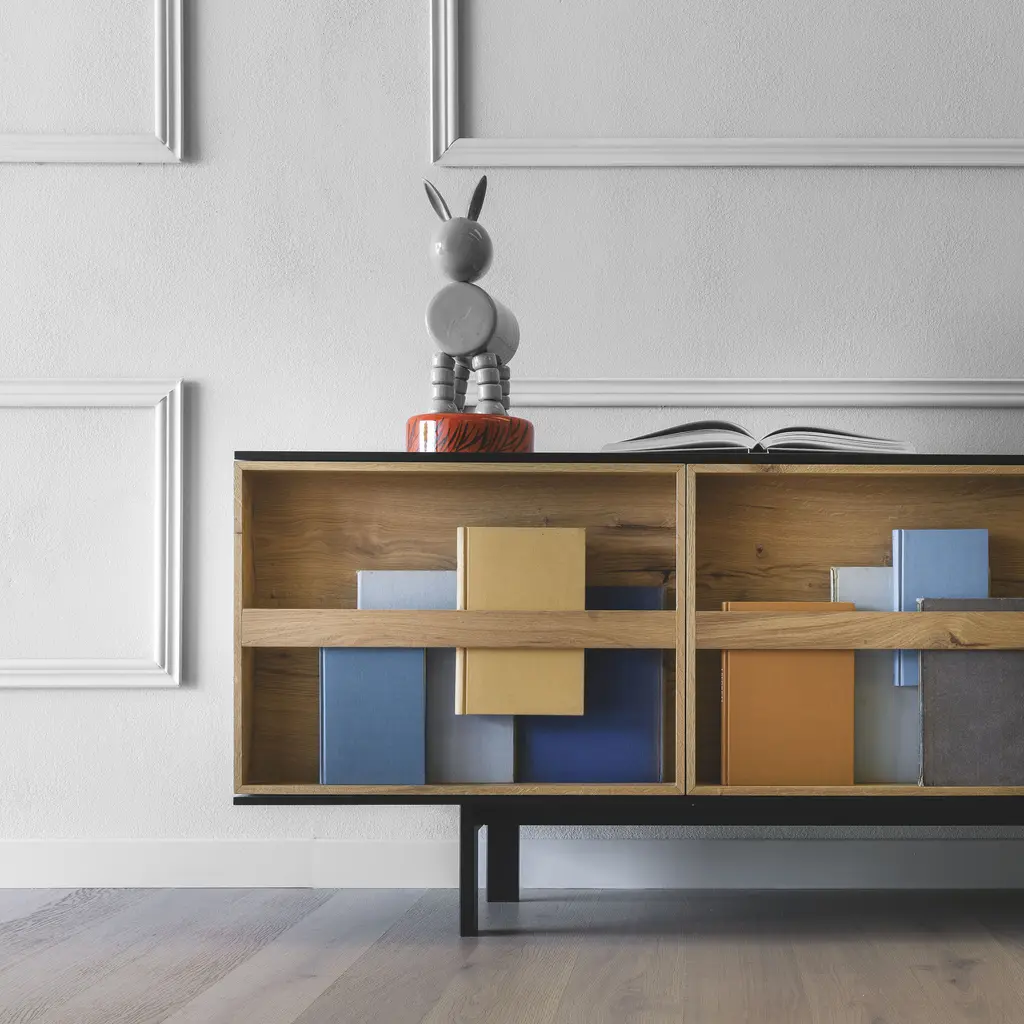 Bibliophiles and those who love them will delight in the organizational flair of Ramblas, a long, low sideboard with a library-style book and magazine rack cleverly integrated into its front. Encased in a slimline wood shell lacquered to match the metal base, the cabinet's hinged doors open on roomy interior storage. Imaginatively conceived by Gaia Giotti and Jonah Scarselli of Florence-based design E-ggs, there are numerous finish combinations with either contrasting walnut or oak doors.