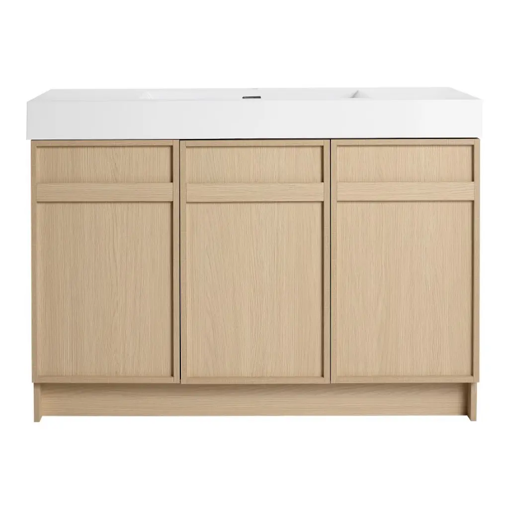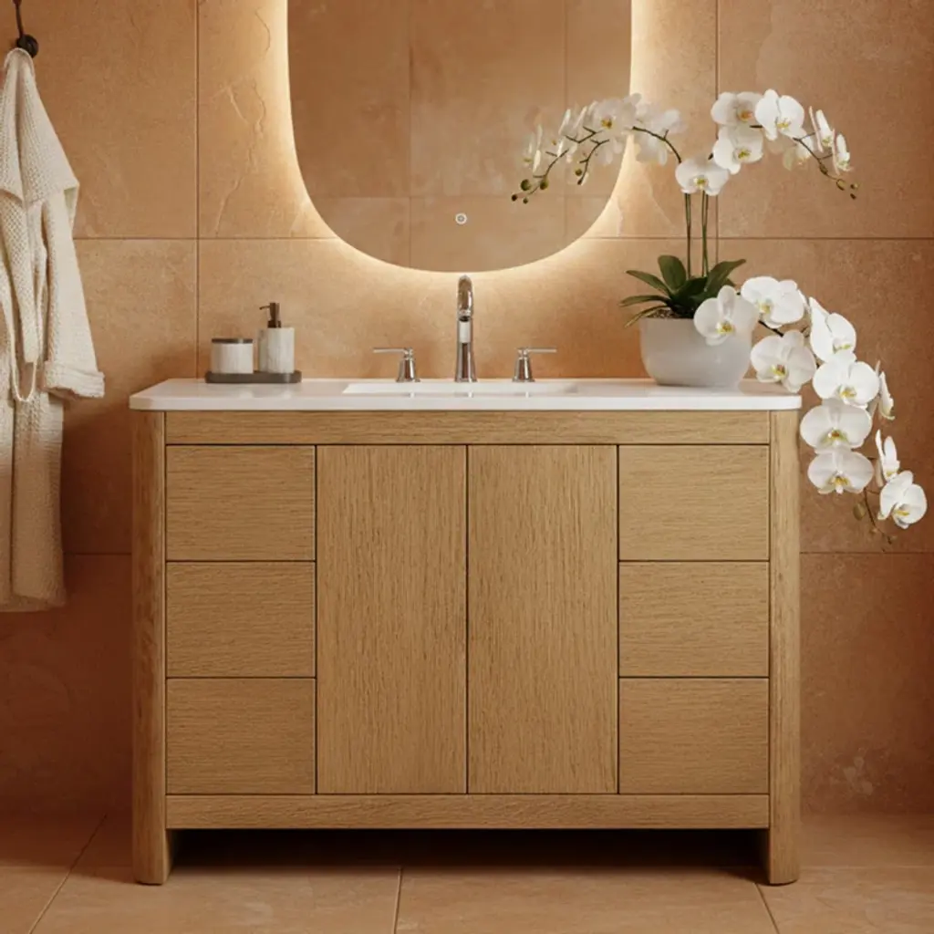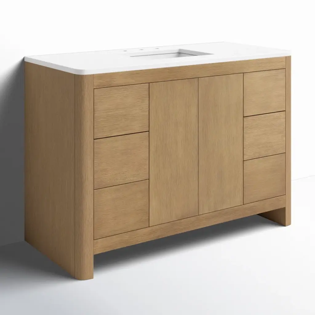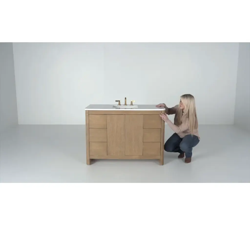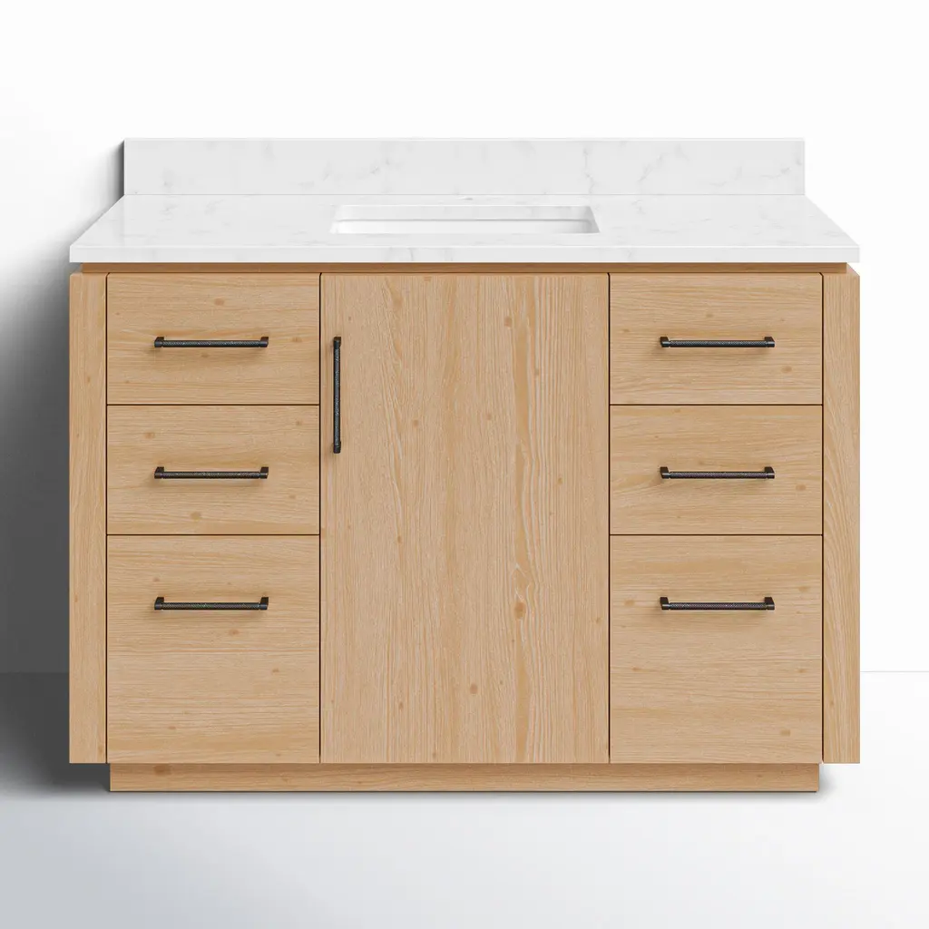 Modern simplicity meets functional design with this bathroom vanity. Crafted from hardwood, it features a hand-distressed finish for a touch of rustic charm. The white quartz countertop complements the undermount ceramic sink, while the spacious cabinet and drawers provide ample storage. Soft-close hinges and drawer glides ensure a quiet and smooth closing. Perfect for both residential and non-residential use, this vanity is ready to elevate your bathroom space with its contemporary style and practicality.