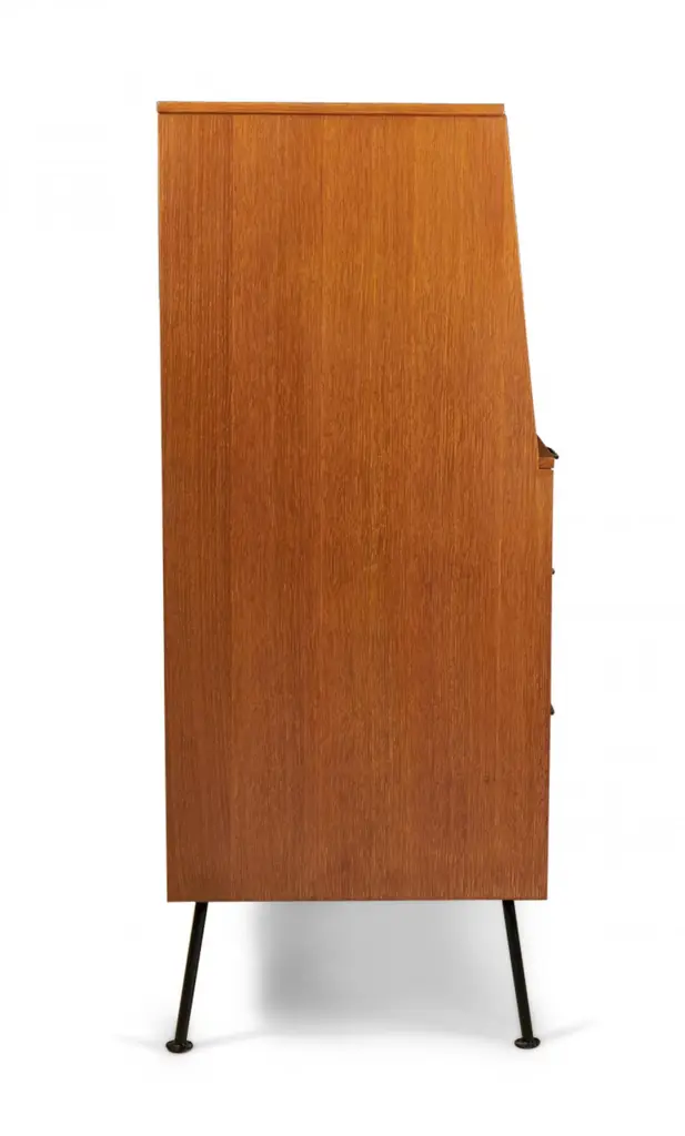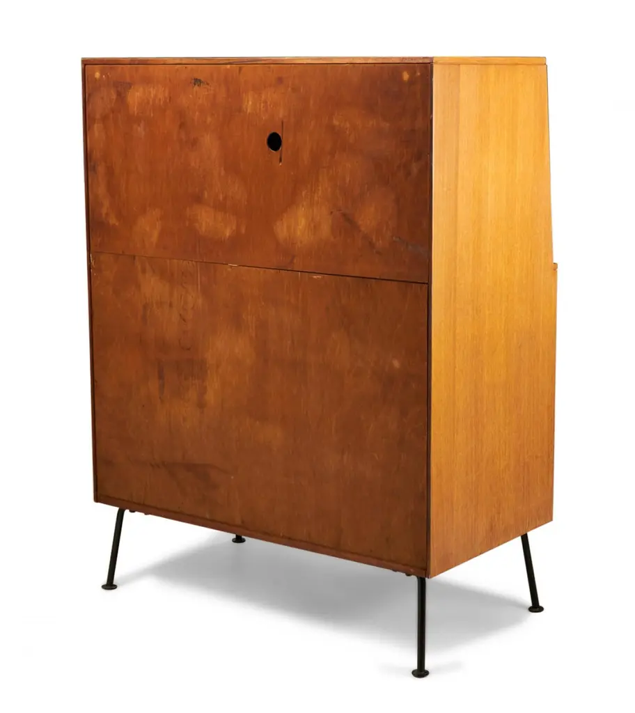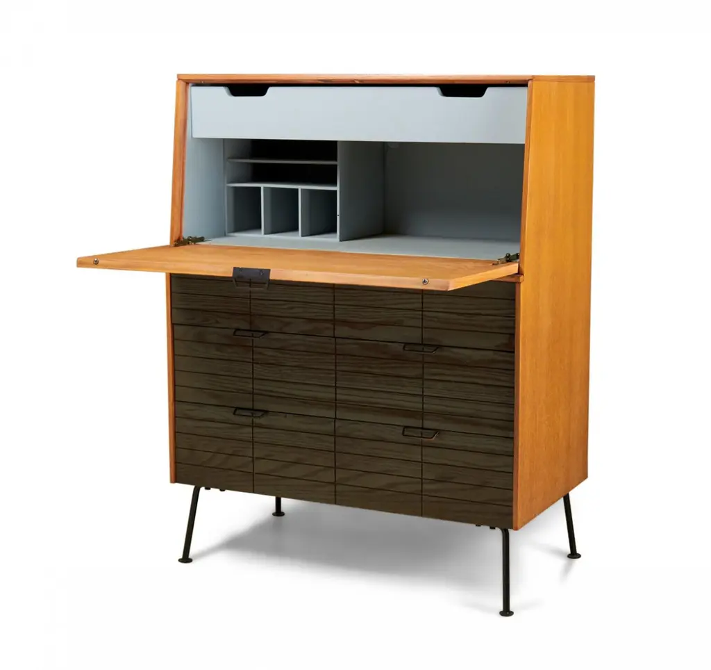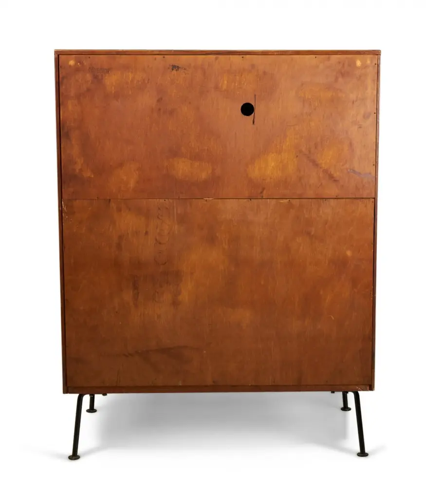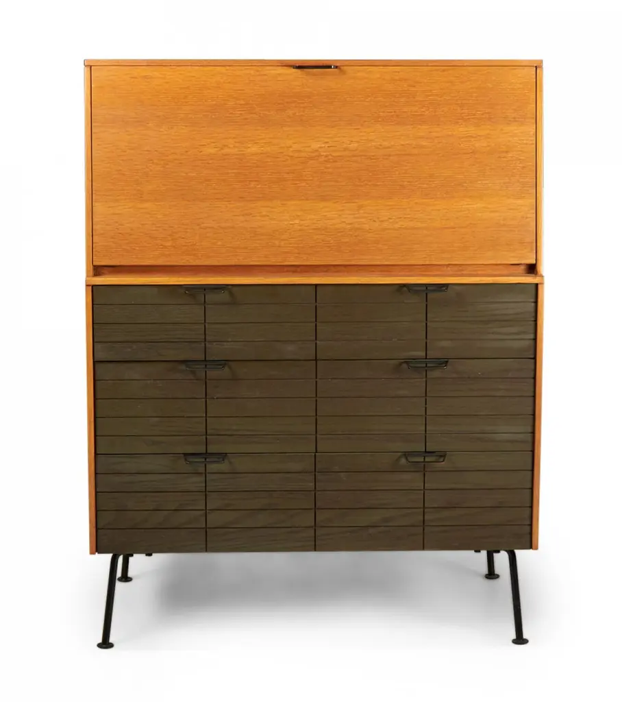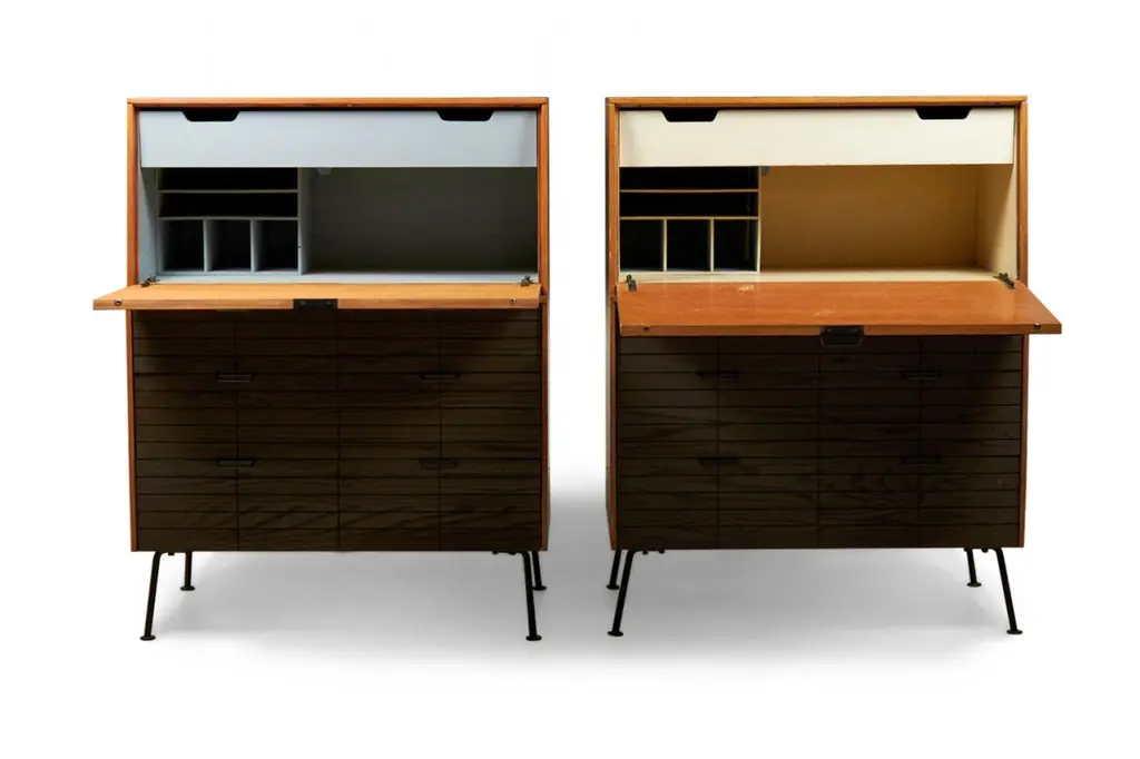 Raymond Loewy For Mengel Fall-Front Walnut And Iron Secretary Cabinets